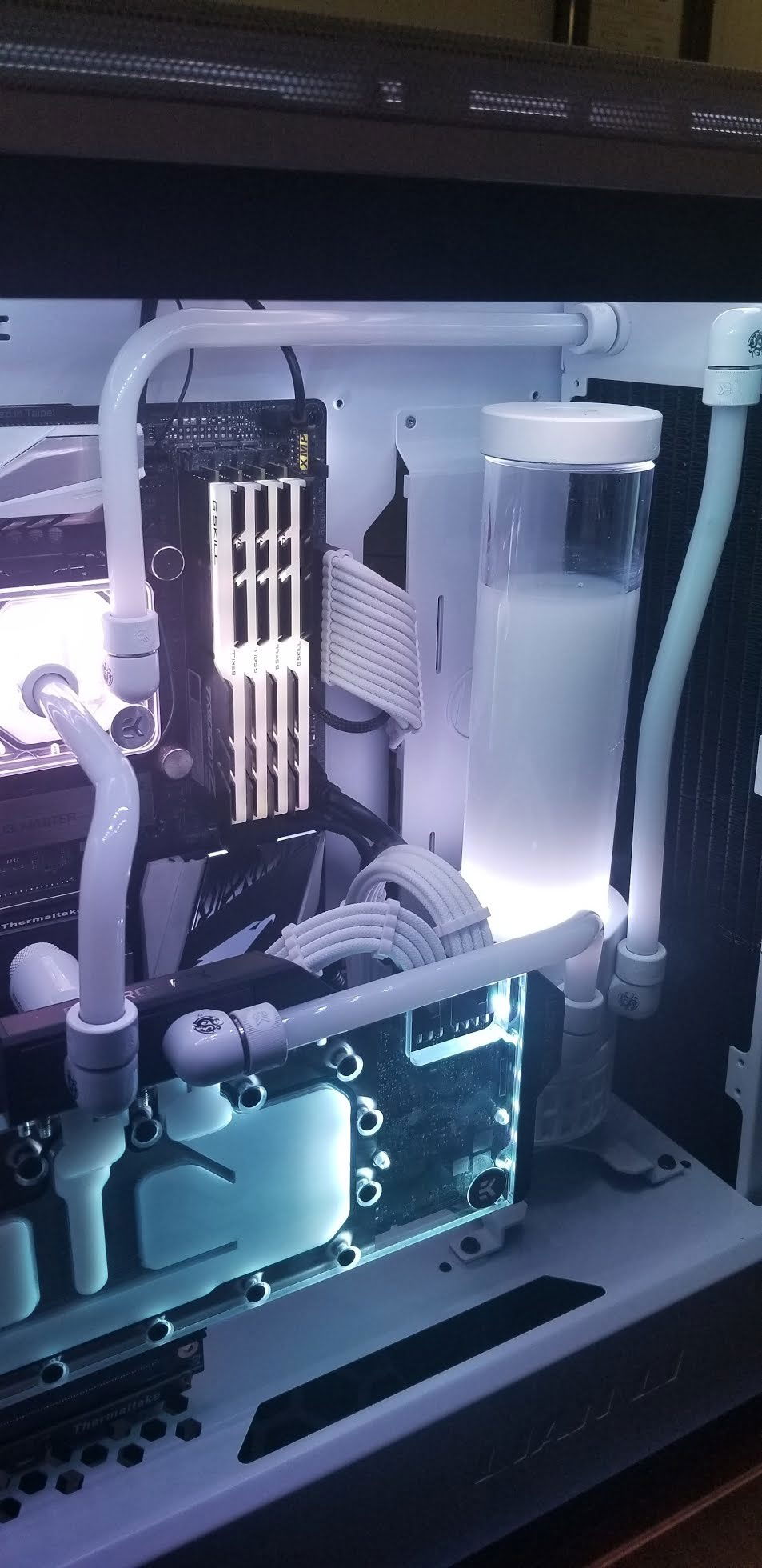 I originally wanted a white/ rgb build but after seeing it all white i fell in love. I spray painted the motherboard, reservoir, fans, and radiator white to go with my color scheme. If I had left them black i think it would of made it look bad so I really happy with how it turned out. It ended up taking my whole winter break to finally complete it. This is also my first go at rigid tubing so I think it turned out alright.