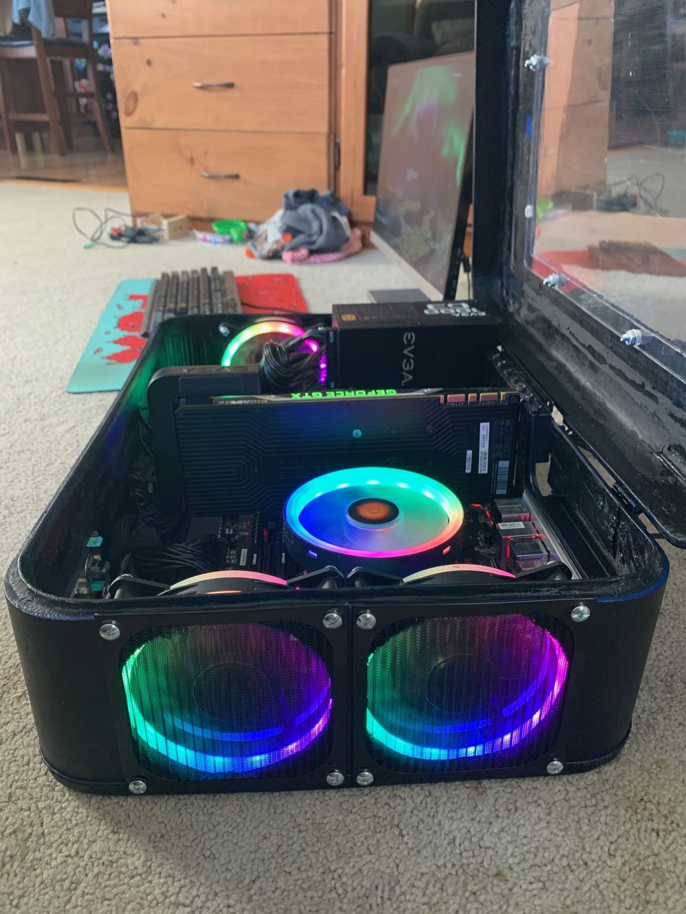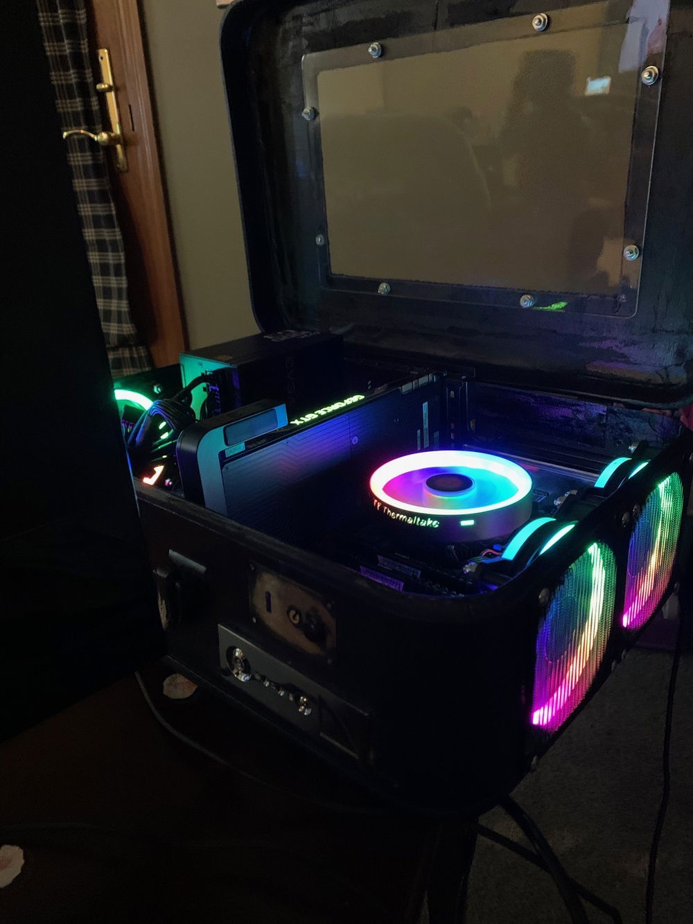 I pulled an old motherboard tray, plexiglass side panel, and power/reset buttons from an old tower I had lying around and used them with the suit case. For the components, I went on eBay and bought a few used parts which ended up working out perfect! Overall I really like how it turned out and now I am hooked! I am trying to think of what my next build will be.