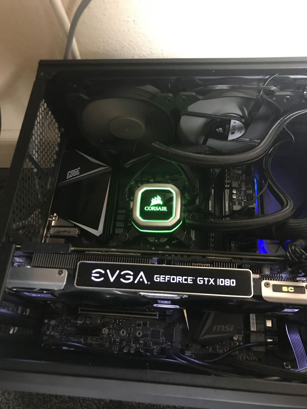 Originally built summer 2017 with a Ryzen 5 1600X, MSI B350M, and H60. Upgraded over christmas with i9, new mobo, and H100i. Often seen with top panel off because it's a toasty build.