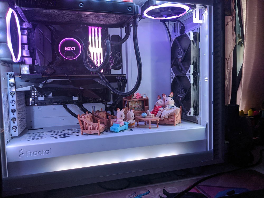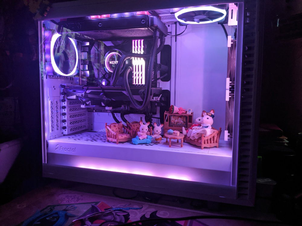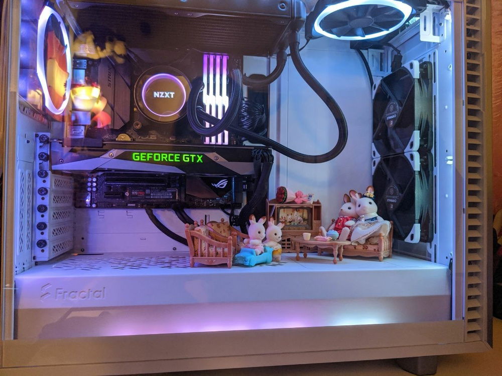 I originally built this machine back in 2017 as my new upgrade in the Corsair Carbide Air 240, but I didn't like the case in the end for it being too smol. I Moved everything from that case into the new Fractal Design 7 in white when that came out and with the excess space, I put a family of calico critter bunnies.
