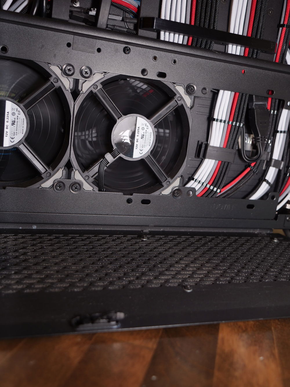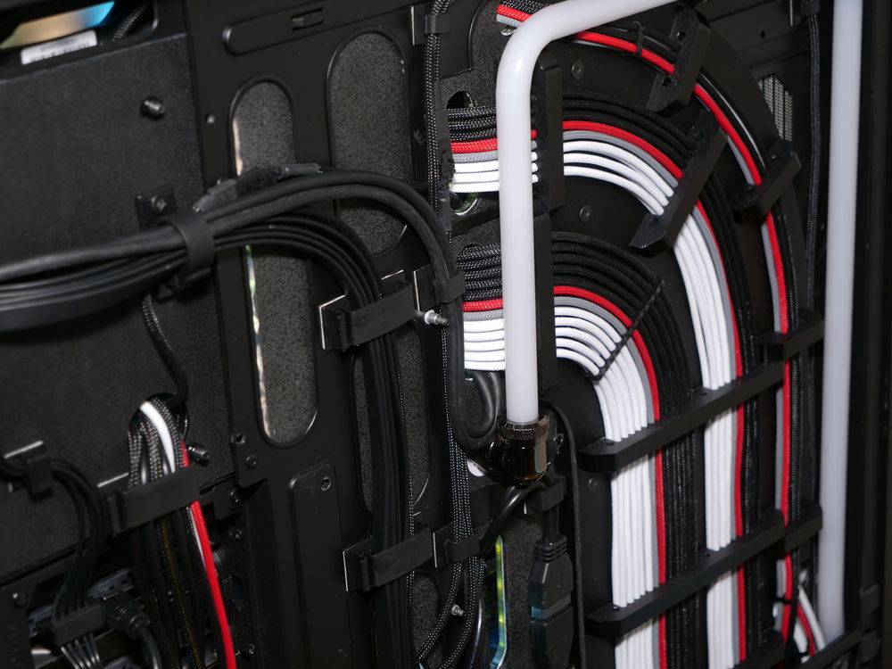 Corsair 900d is the case heavily modded. Custom two layer Motherboard backer mirrored and black vinyl matches Asus Rampage Encore design. Custom two layered midplate matches same design. Custom drive cage light box cover piece.