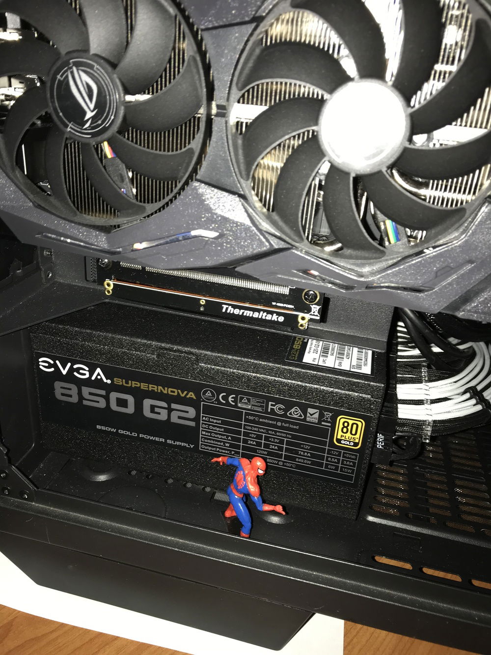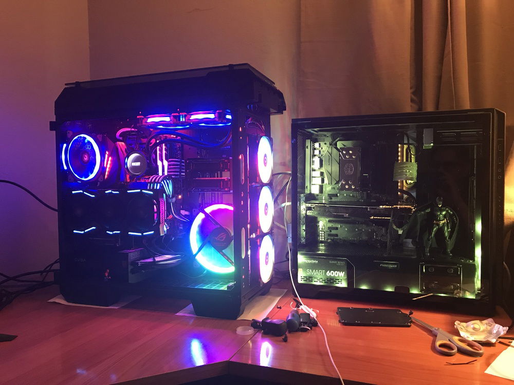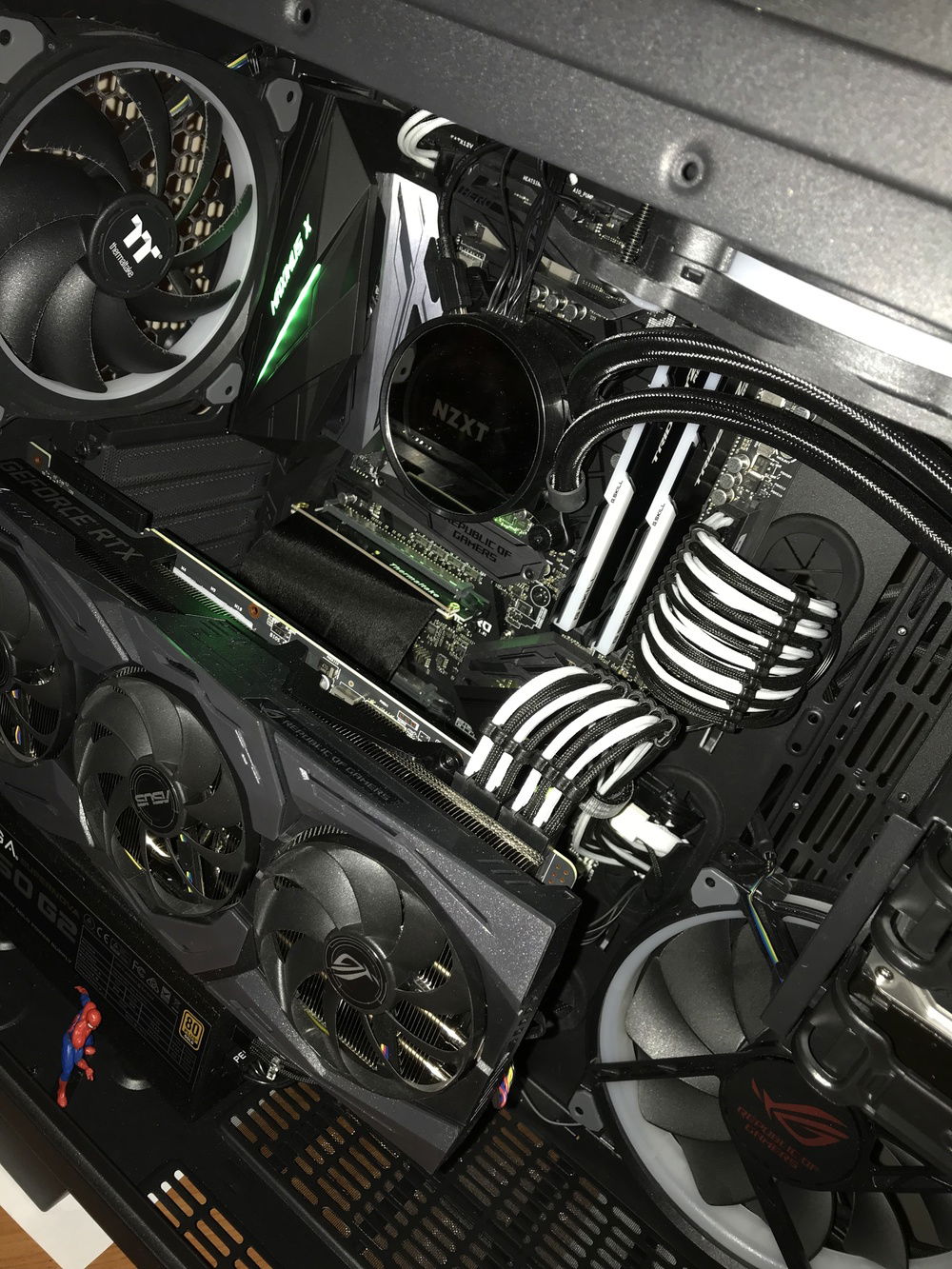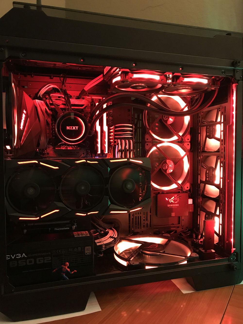 THE BOSS consists of the following components: i7-8700K, Asus ROG Stryx RTX2080, Trident 16GB 3200mHz RAM, Asus ROG Maximus Hero X wifi/ac motherboard, NZXT AOI liquid cooler, 256GB Samsung Evo M.2 SSD, 500GB Samsung Evo SSD, 4TB Toshiba performance HDD, two(2) Toshiba 256 GB HDD’s in RAID, EVGA 850W fully modular power supply with Cable Mod power cables, 1x Thermaltake riing Plus 140mm fan, 1x Thermaltake Riing Plus 400mm fan, 3x Thermaltake Pure Plus 120mm fans, 2x Thermaltake Riing Plus 120mm fans, 1x Phanteks 140mm fan, 2x Phanteks RGB LED strips, NZXT internal usb hub, Thermaltake View 71 4-sided tempered glass full-tower case, Thermaltake GPU pci-e extension cable for vertical mounting, and Spiderman.