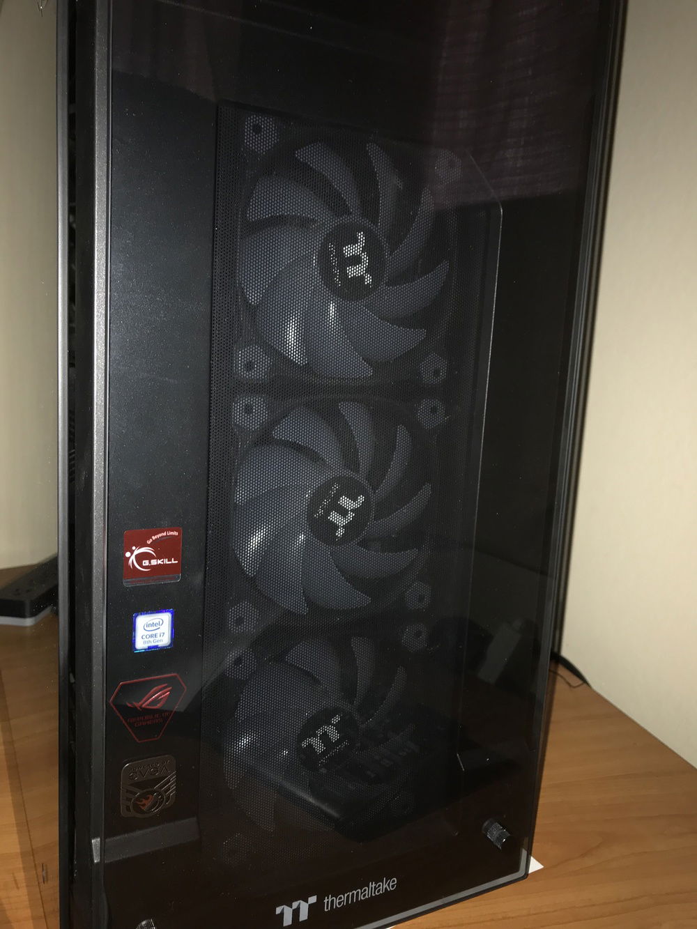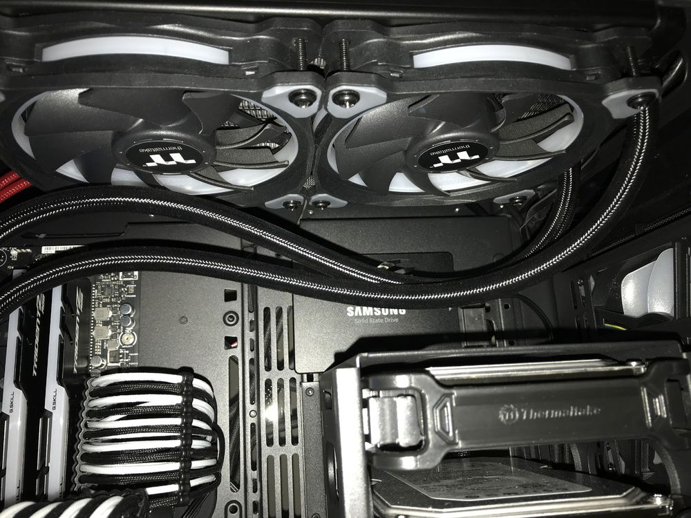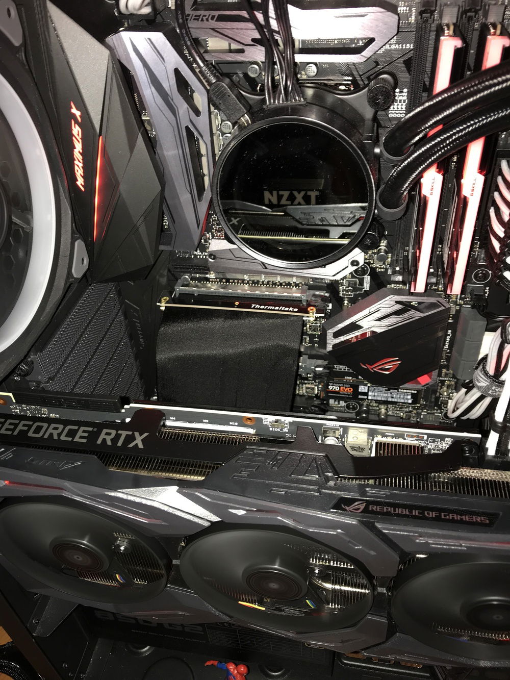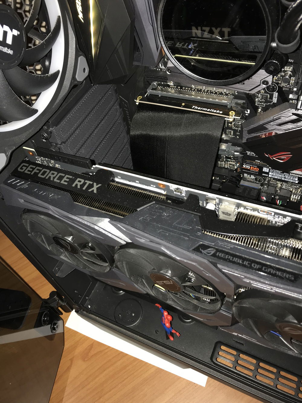THE BOSS consists of the following components: i7-8700K, Asus ROG Stryx RTX2080, Trident 16GB 3200mHz RAM, Asus ROG Maximus Hero X wifi/ac motherboard, NZXT AOI liquid cooler, 256GB Samsung Evo M.2 SSD, 500GB Samsung Evo SSD, 4TB Toshiba performance HDD, two(2) Toshiba 256 GB HDD’s in RAID, EVGA 850W fully modular power supply with Cable Mod power cables, 1x Thermaltake riing Plus 140mm fan, 1x Thermaltake Riing Plus 400mm fan, 3x Thermaltake Pure Plus 120mm fans, 2x Thermaltake Riing Plus 120mm fans, 1x Phanteks 140mm fan, 2x Phanteks RGB LED strips, NZXT internal usb hub, Thermaltake View 71 4-sided tempered glass full-tower case, Thermaltake GPU pci-e extension cable for vertical mounting, and Spiderman.