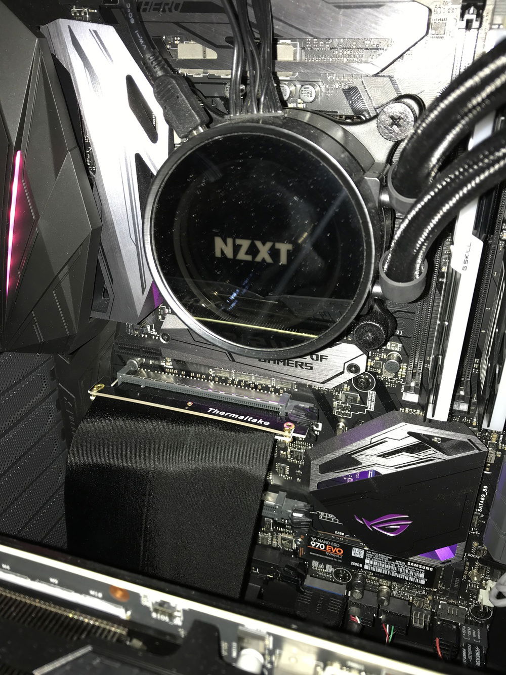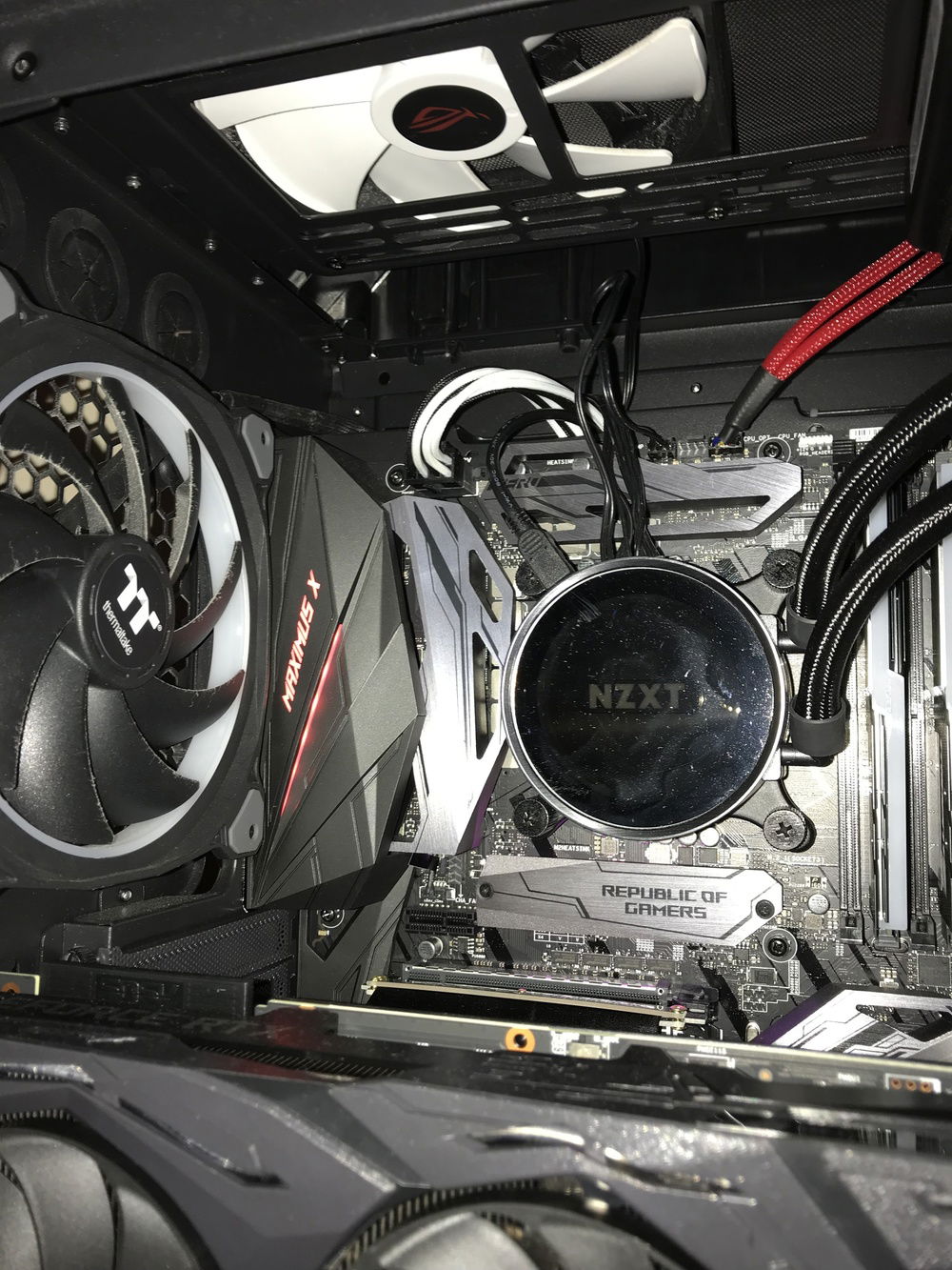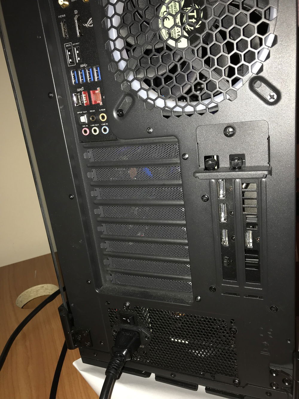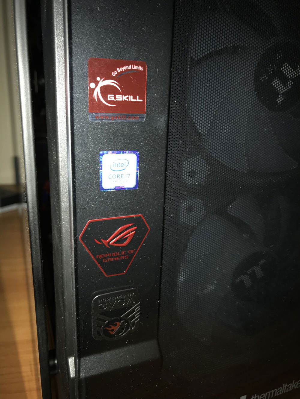 THE BOSS consists of the following components: i7-8700K, Asus ROG Stryx RTX2080, Trident 16GB 3200mHz RAM, Asus ROG Maximus Hero X wifi/ac motherboard, NZXT AOI liquid cooler, 256GB Samsung Evo M.2 SSD, 500GB Samsung Evo SSD, 4TB Toshiba performance HDD, two(2) Toshiba 256 GB HDD’s in RAID, EVGA 850W fully modular power supply with Cable Mod power cables, 1x Thermaltake riing Plus 140mm fan, 1x Thermaltake Riing Plus 400mm fan, 3x Thermaltake Pure Plus 120mm fans, 2x Thermaltake Riing Plus 120mm fans, 1x Phanteks 140mm fan, 2x Phanteks RGB LED strips, NZXT internal usb hub, Thermaltake View 71 4-sided tempered glass full-tower case, Thermaltake GPU pci-e extension cable for vertical mounting, and Spiderman.