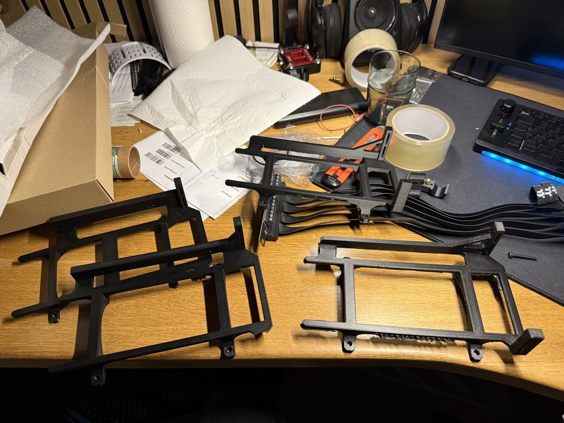 After about 6 revisions, everything fit perfectly and I was able to mount my GPU with its riser cable to the left of the mainboard. All cables except for the riser cable will go through a printed cable duct in the bottom corner of the case.