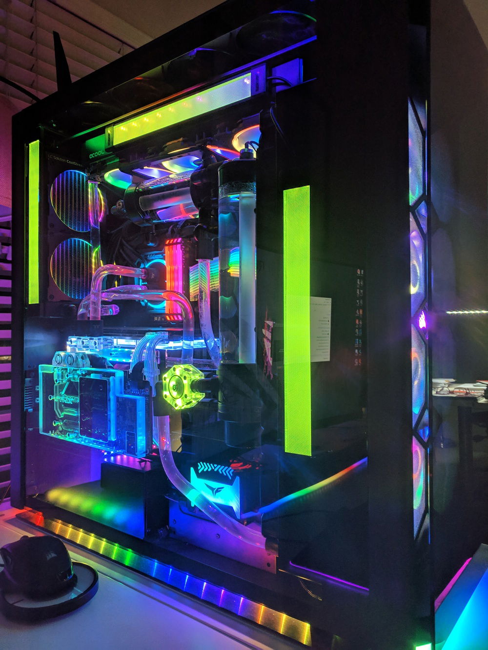 The fittings have RGB rings inside to illuminate the PETG tubes. Uses 2 x 480mm EKWB XE-480s, an Alphacool XT45 X-Flow 420mm rad, and an EKWB 240mm SE-240 rad from Austria. Both systems are full water cooled loops.