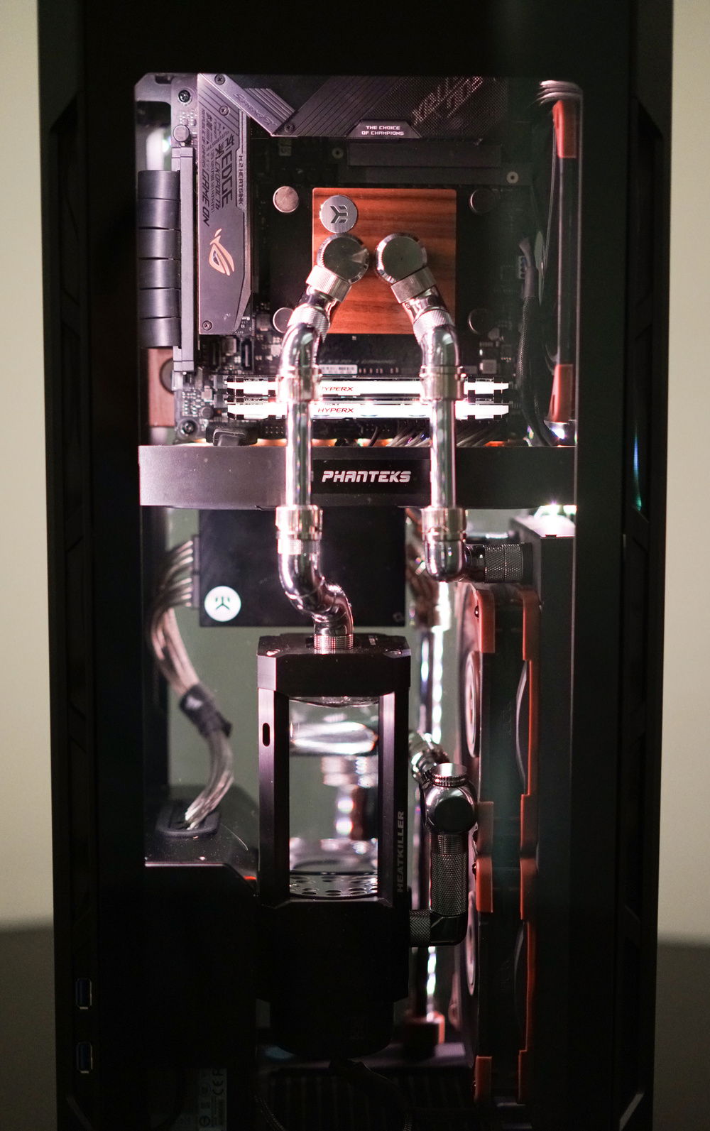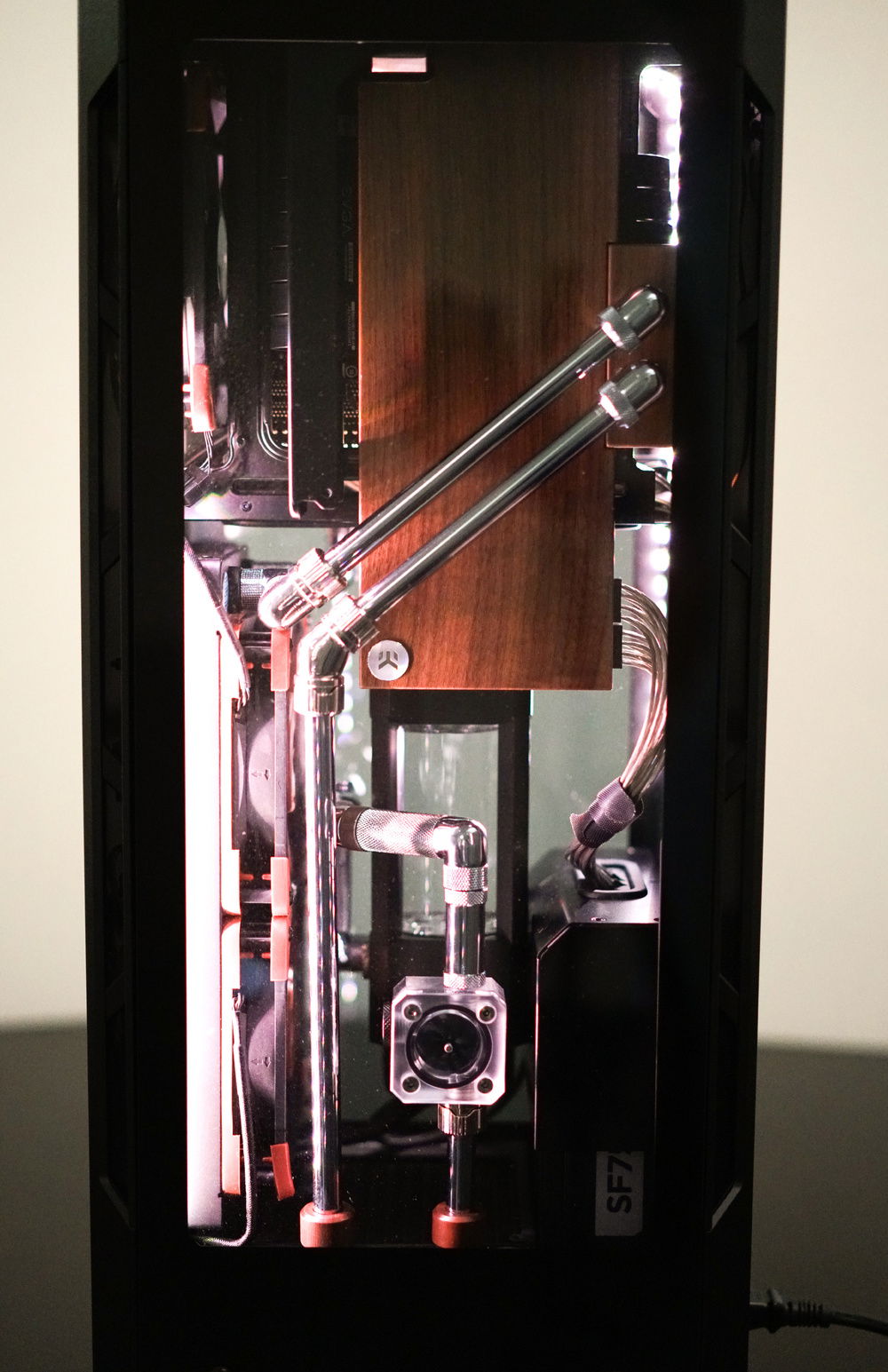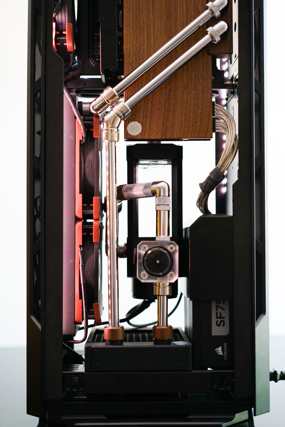 I rotated the CPU Block 180 degrees to center the ports with the case and have the outflow drop into the reservoir below. One complaint with the Lignum block is that the fit and finish below the wood isn't that great. I had some bad threads on the AM4 standoffs and had to use quite a bit of force (pliers) to secure it to the motherboard. Underneath the wood it's standard EK workmanship and I have doubts about the price premium over regular EK blocks. Looks great though.