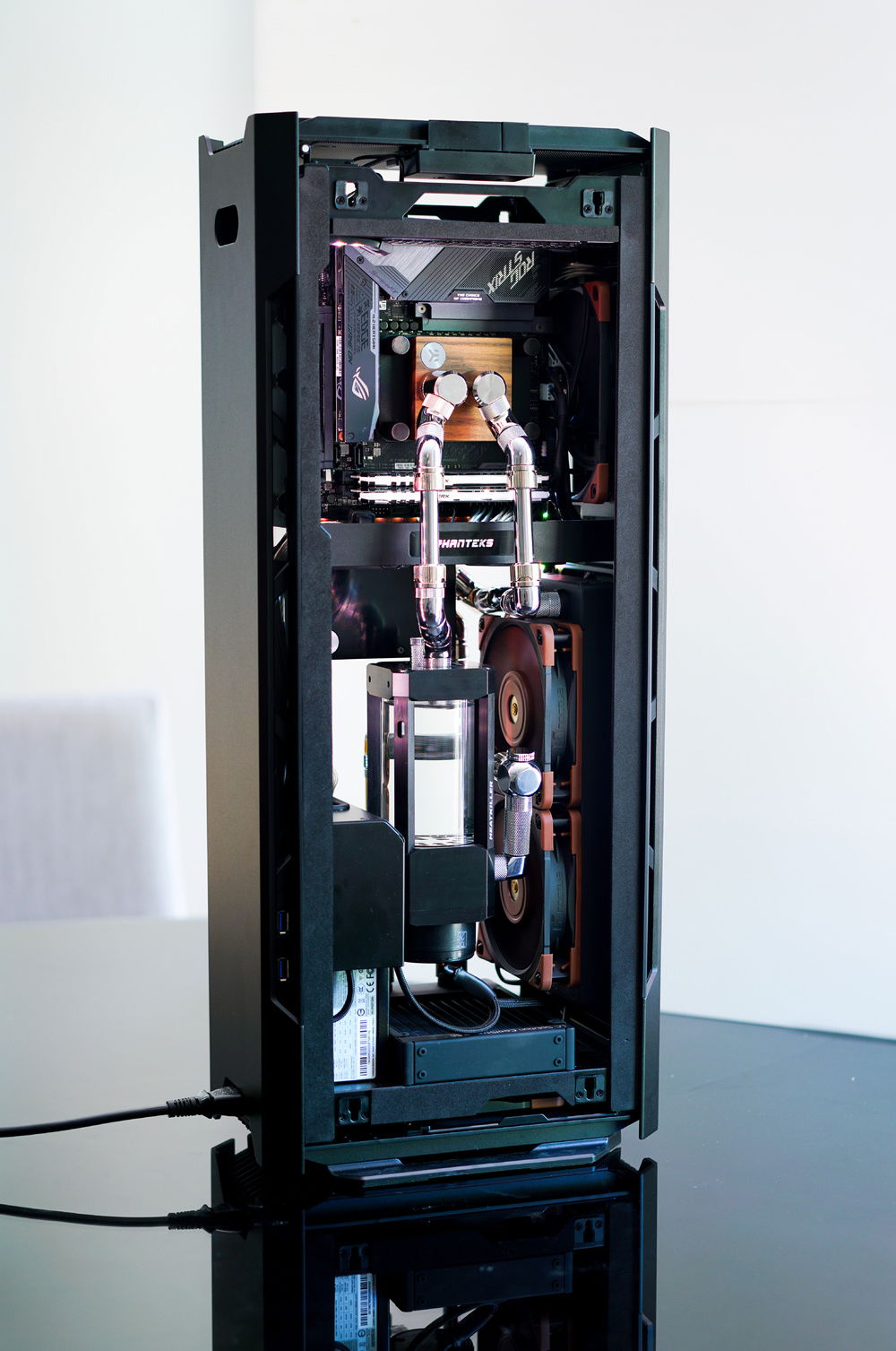 I wanted the Bitspower flow meter somewhere prominent but I had run out of space on the front side of the Phanteks Evolv Shift X. I love the fan blades of those Noctua NF-A 12x25 pwm fans.