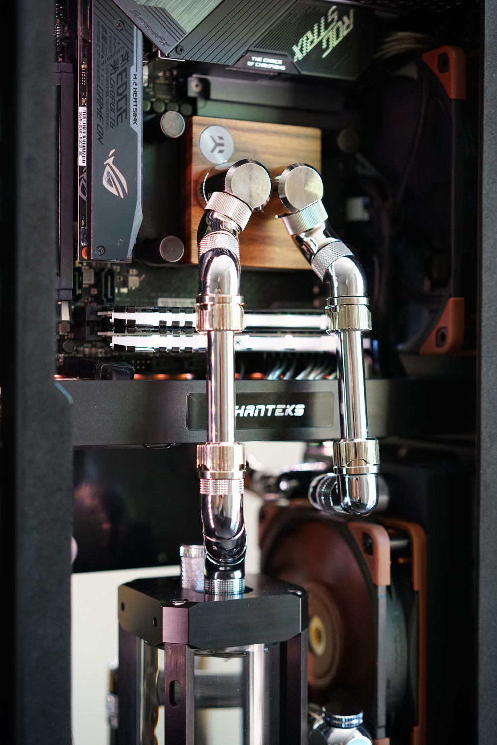 I actually used a mixture of fittings to get the right look for the Lignum CPU block (I love the texture). I had a lot of EK Torque angled fittings but they are just too large for this ITX build. So only these 2 ended up in the final build. The rest are Barrow, EK classic. One thing worth noting is that EK and Barrow(ch)/Bykski have a different tint to their chrome finish. EK has a warmer tone whereas Barrow(ch) is closer to silver. I also like the HyperX DDR4 low profile ram, I won't be buying full height anymore.