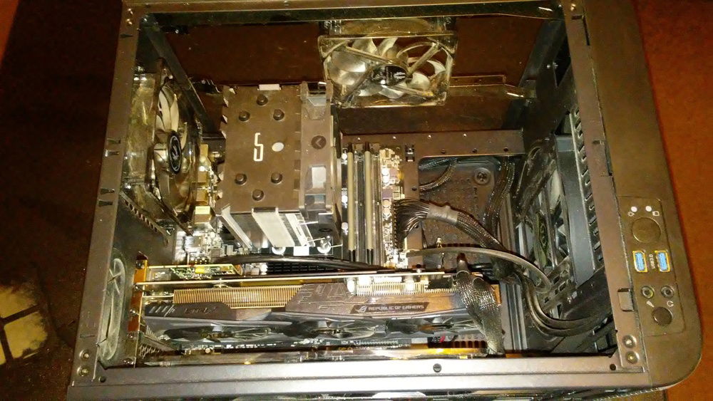 Custom painted case and GPU shroud (Camo Green) with black trim and a touch of white accents on the acrylic front plate held on to the case with magnets. 3 fans on the top of the case as intake with the stock 200mm fan in the front as exhaust. A custom painted FUNKO POP on top as ornamentation.