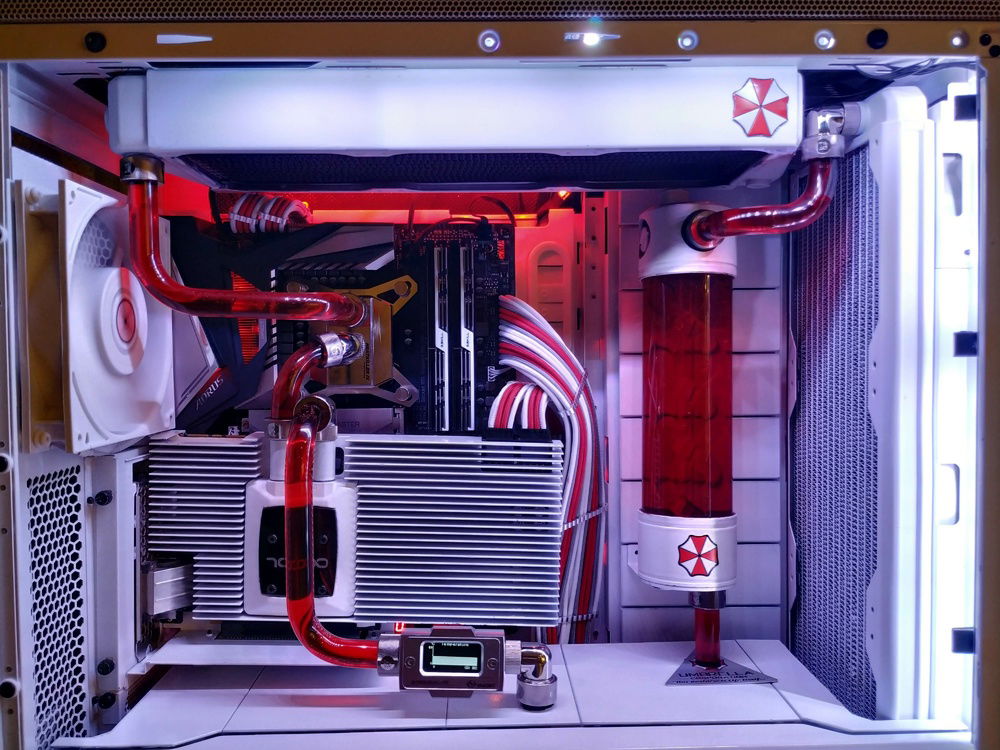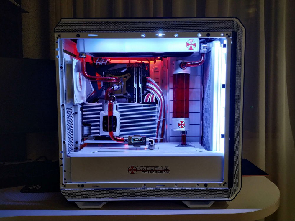 Inspired by Resident Evil 2001 movie, particularly by the Hive. Painted everything myself (except for MB, case and fans). Had to make a couple of not planned holes in the case, but this is my first build, I just don't have enough experience. Thermals are ok, yet I have to admit sometimes the case is suffocating the system. Normal temps under load are around 60 degrees C.