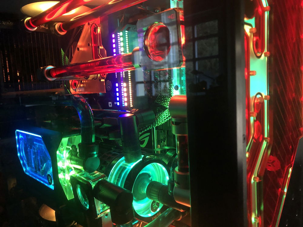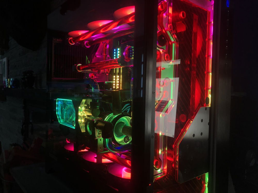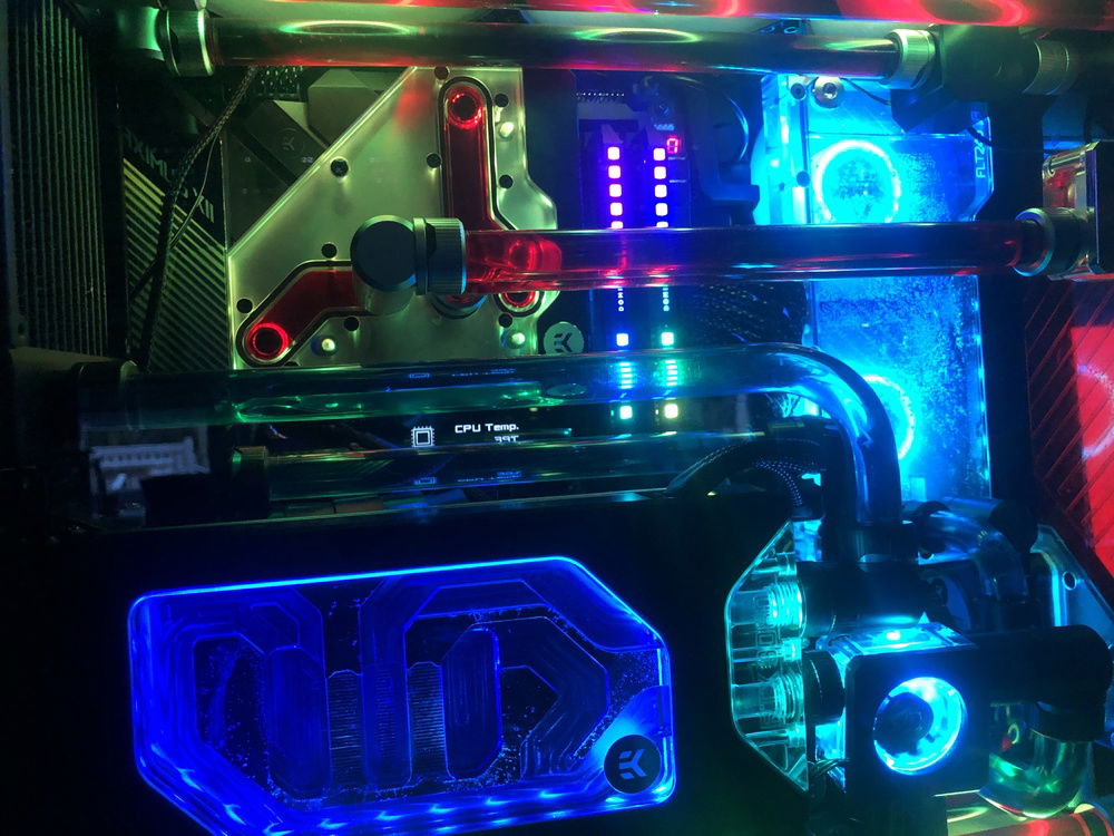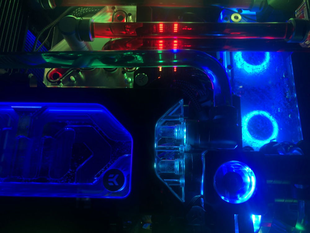 2 circuits: red for the CPU(=heart), blue for the GPU (=lung). Connected with 2 EK loop connect. CPU Intel i9 10900K, GPU RTX 3080. Case: Lian Li O11 DXL