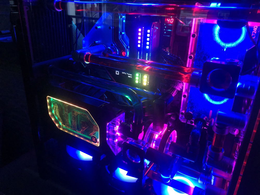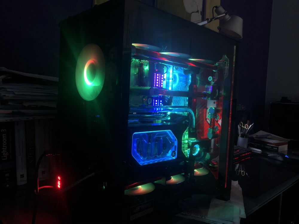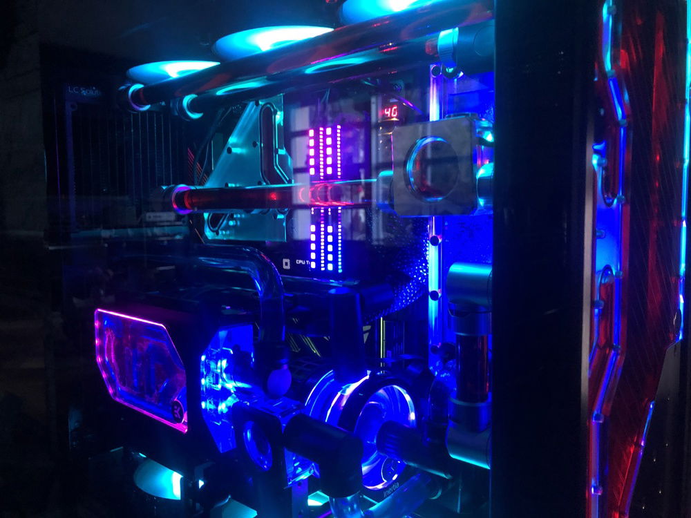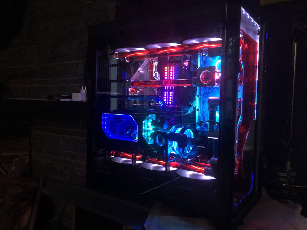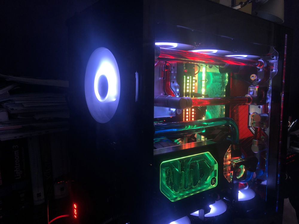 2 circuits: red for the CPU(=heart), blue for the GPU (=lung). Connected with 2 EK loop connect. CPU Intel i9 10900K, GPU RTX 3080. Case: Lian Li O11 DXL