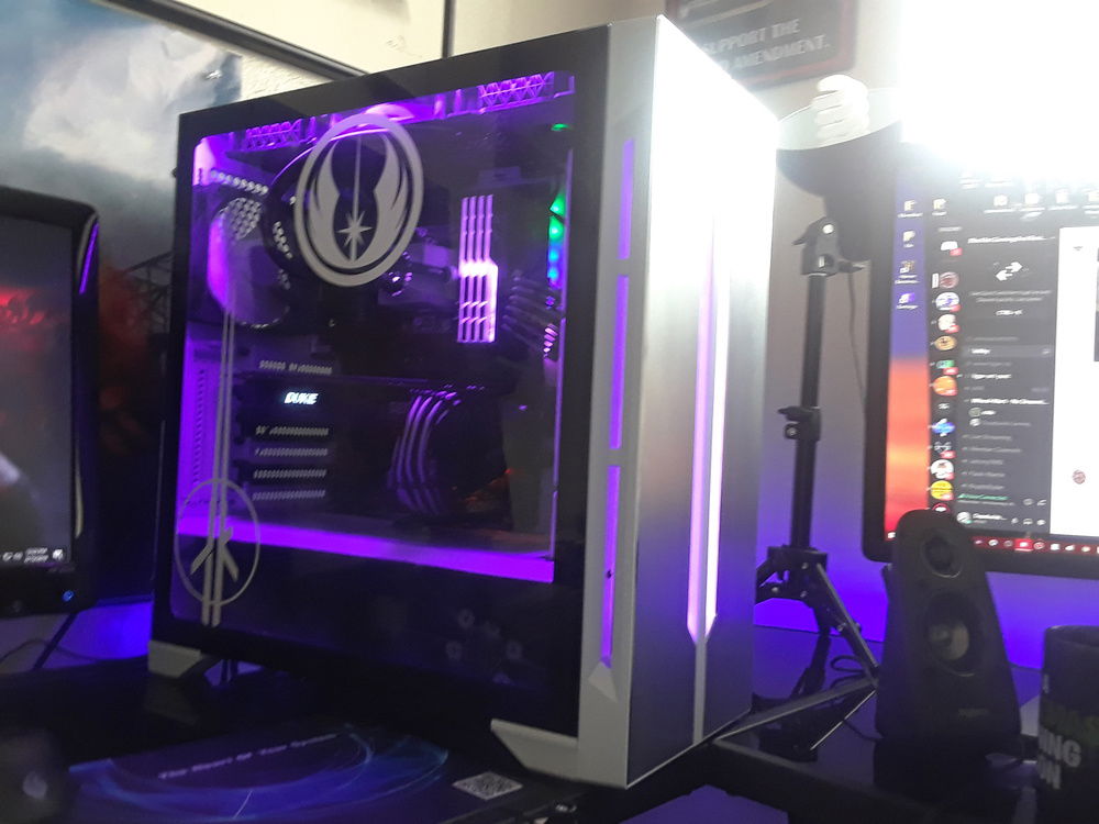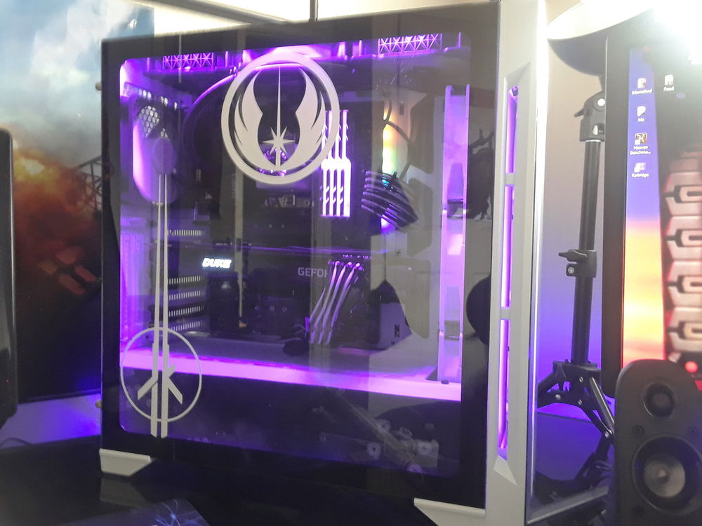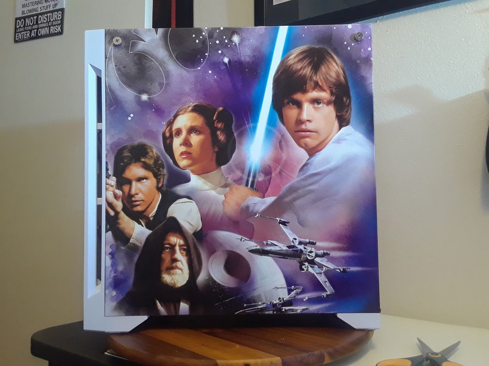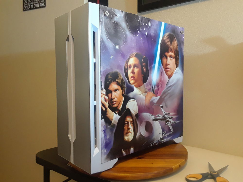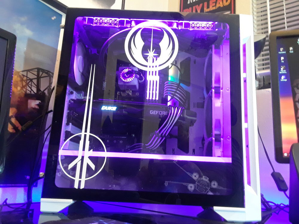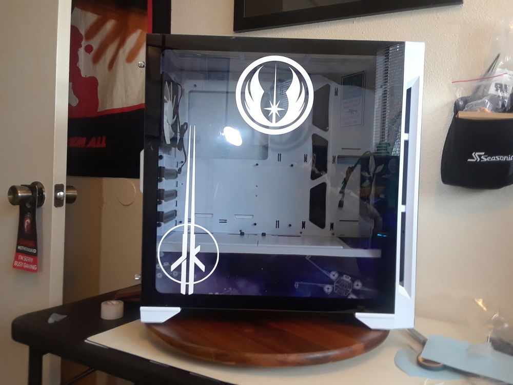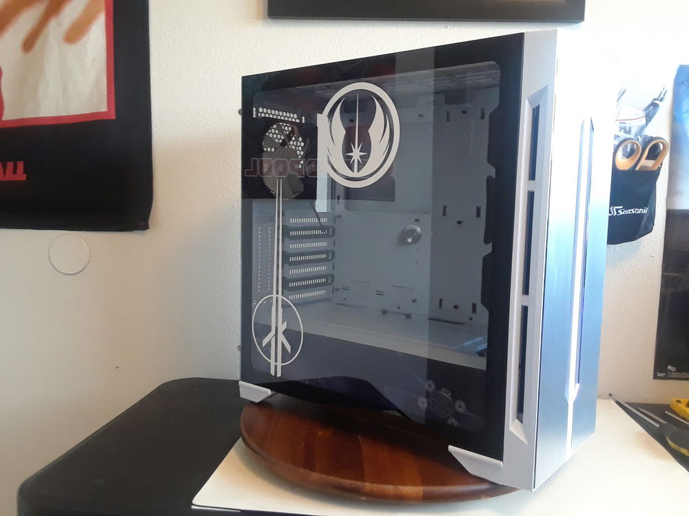 The Jedi was a Valentines day gift for the wifey. The graphics applied to the PSU shroud were the roughest part of this build. The graphics are high quality vinyl and custom designed per spec. She loves it!