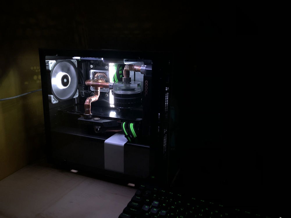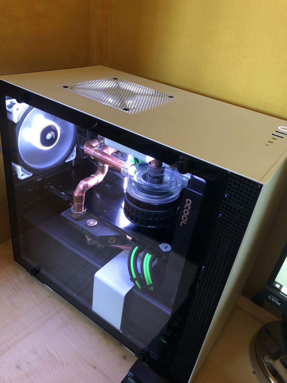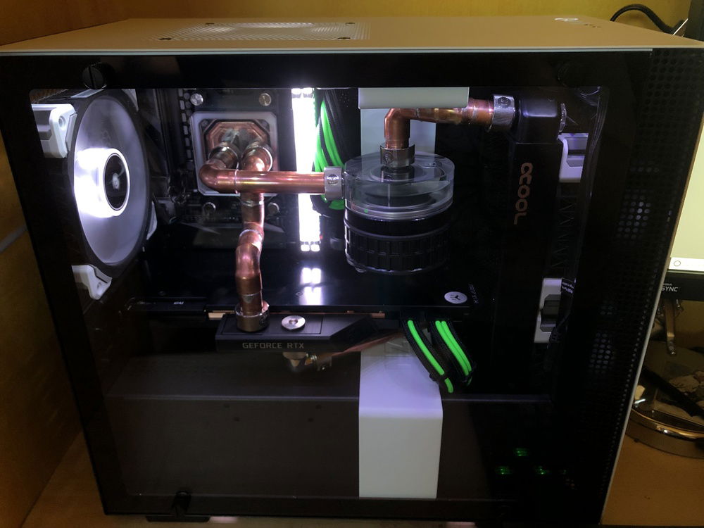 First custom build in years, first time using a gpu block. EKWB for all the components and a Alpha-cool Xflow to help with filling. Copper pipe was a giant pain but it turned out better than I expected. Running 4.2ghz on the 2700x with a slight gpu overclock at around 60 C while gaming on a single 240mm rad. Wasn't sure what to call it, it reminds me of a high end coffee machine.