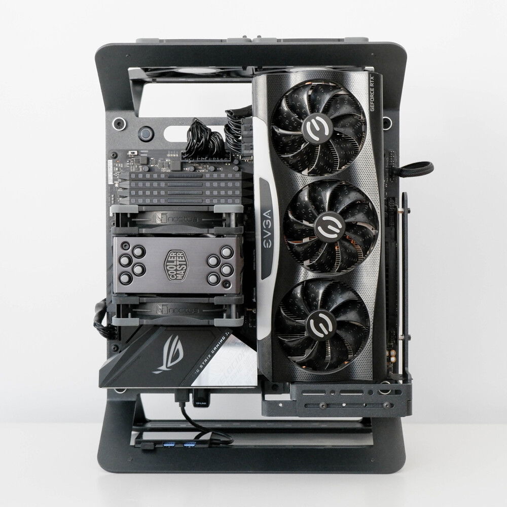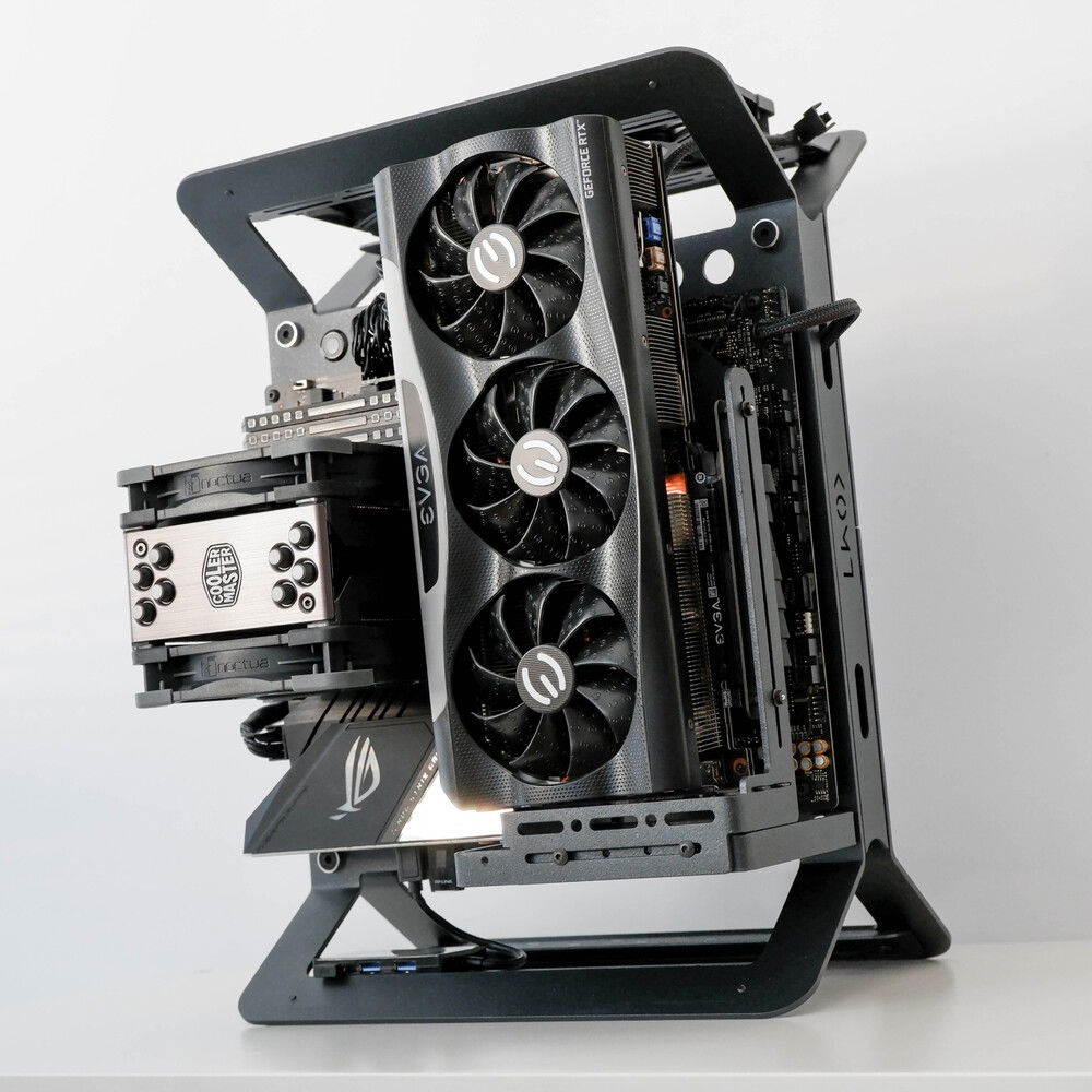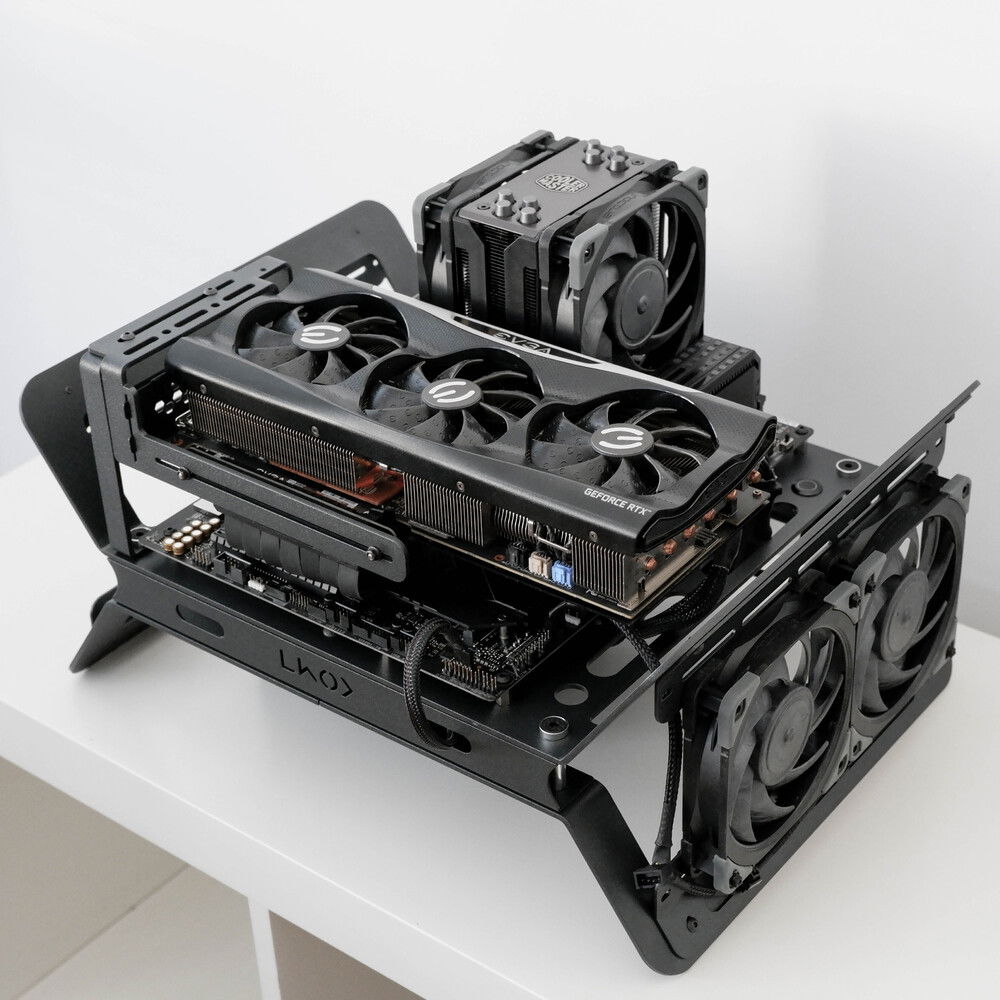 The Nexus is a multi-orientation test-bench style open chassis, inspired by our mighty Apex. It is designed to accommodate Standard-ATX, Micro-ATX and Mini-ITX motherboards. Both wings can support 240mm, 280mm and 360mm radiators. The design of the chassis focuses on more simplified air or all in one cooled builds. Custom loops are also possible, depending on the builder creativity. The chassis is made out of 3mm steel with a textured black powder coat.
