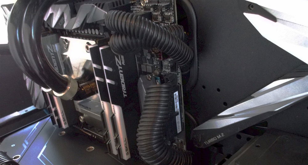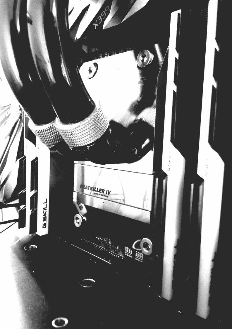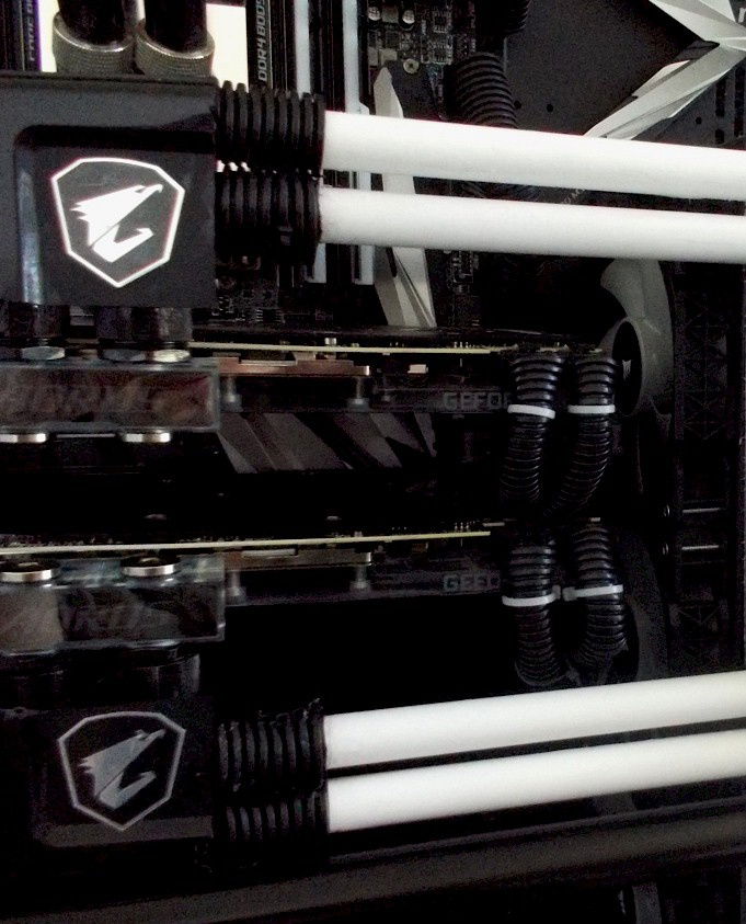 I started with a Thermaltake Core P5 case and a MSI MEG Creation X399, added two Aorus 2080 Ti Xtreme WB water-cooled cards, 32 GB of TridentZ and WD Blue M.2s. The 2950X got a Watercool Heatkiller IV TR Nickel plated block. The black, white and silver theme was quickly locked in (at least before RGB kicks in...). The build has two separate cooling circuits: CPU has two XSPC RX 360 rads with two MPC655 pumps. GPUs have three XSPC RX 360 rads, also with two MPC655 pumps. Add in something like twenty 120mm fans, and it runs, well, cool even when overclocked 24/7...