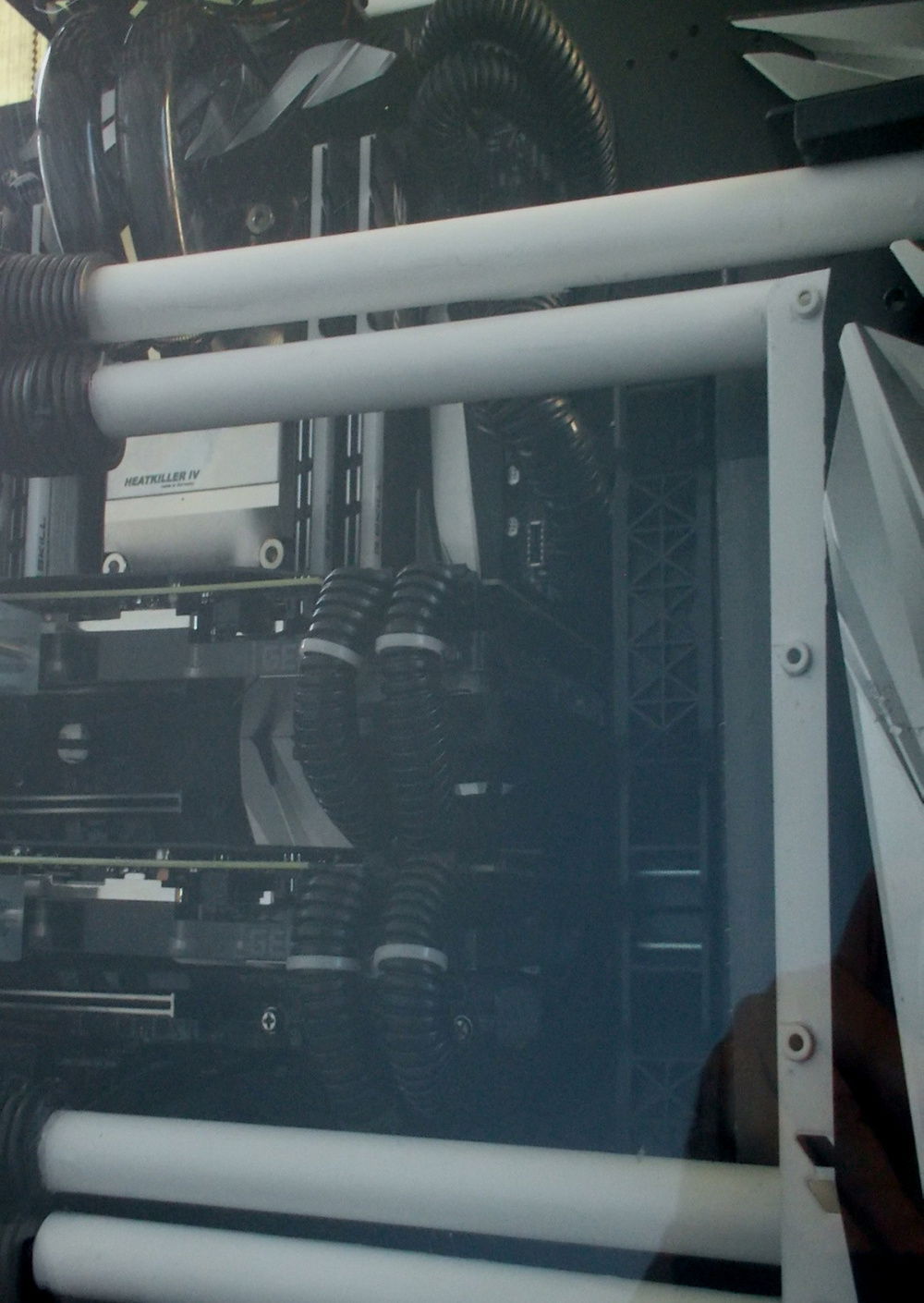 The build required a lot of mods on the Core P5 'case', noting that the GPU cooling tubes (horizontal, white in the pics) are copper tubing, complete with copper elbows.