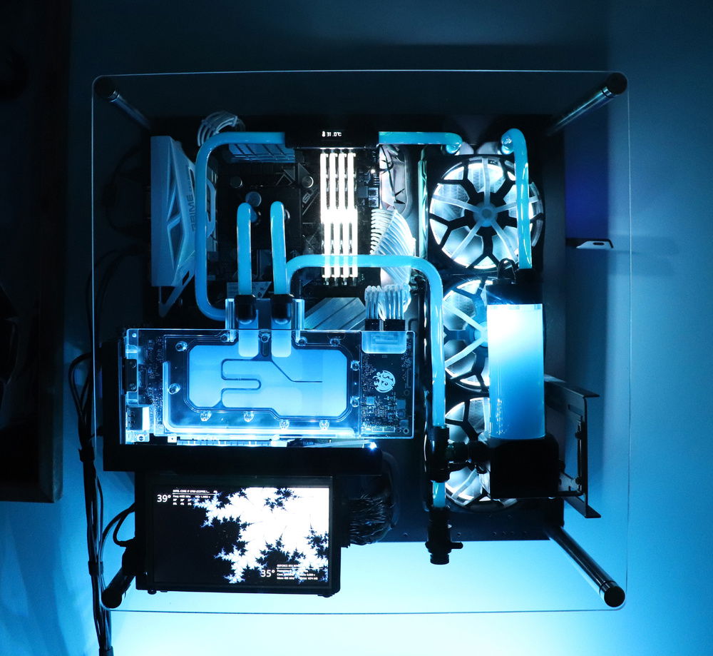 This is my daily driver. I'm pretty new to the water cooling side but the learning curve was a ton of fun. It utilizes a custom hard-line loop to cool cpu and gpu. Mayhems pastel to tint the water. Keyboard is a custom dz60 using cherry silvers, with a rose wood case and brass back plate, all from KBDFans Currently waiting on my new keycap set so I'm stuck with my Corsair keycaps that don't quite mesh. The mini screen is a 7" Pi screen, running off usb and hdmi. The gpu/cpu temps are displayed via Rainmeter. I've 3D printed cable clips and Fan grills, and I'm still deciding whether I like em.