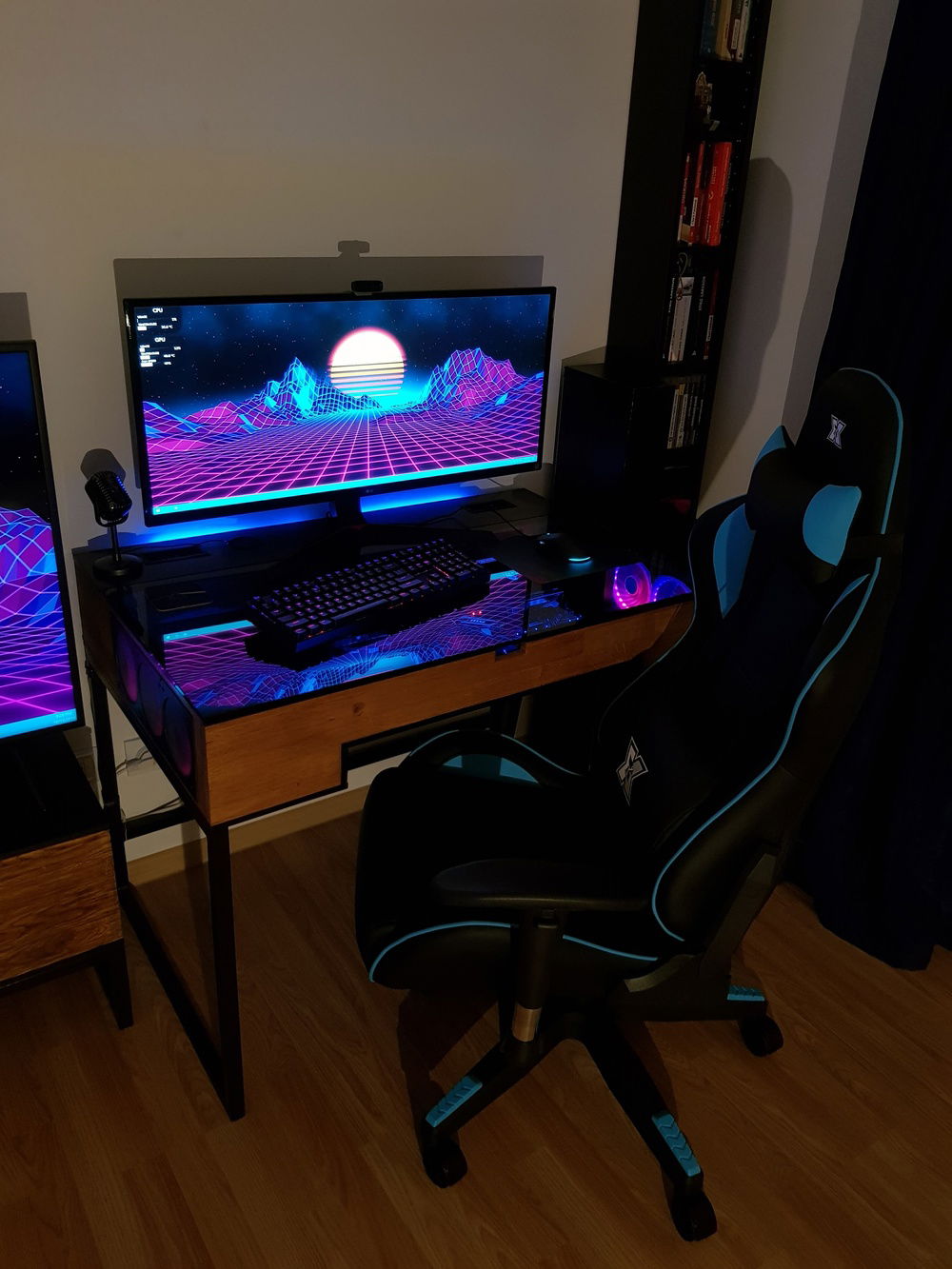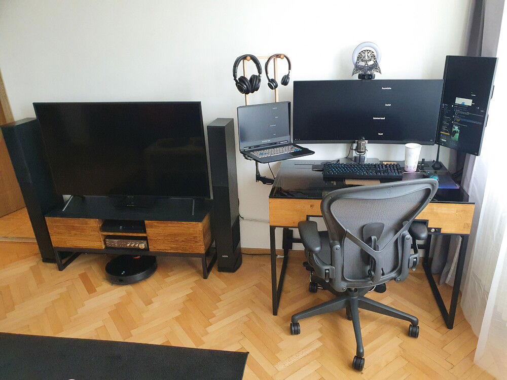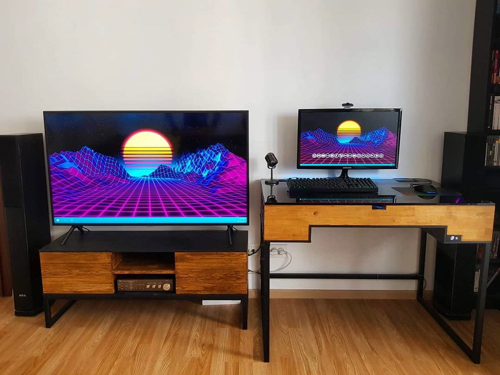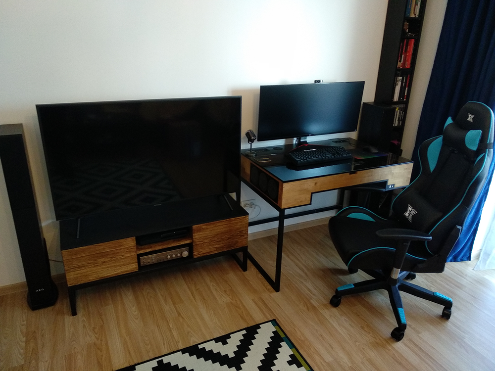 Case: Manually built desk (stained wood, painted MDF, painted aluminium frame, tinted laminated glass)