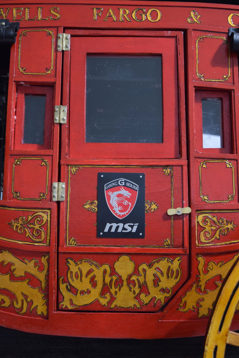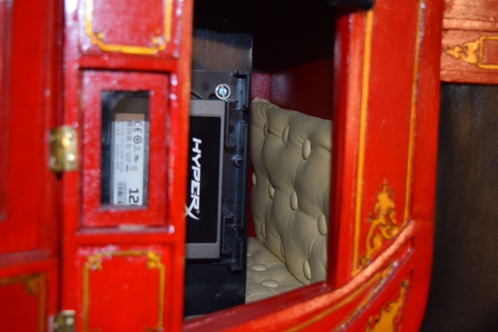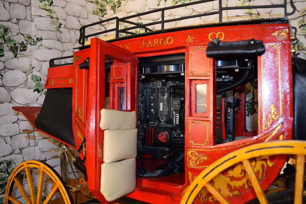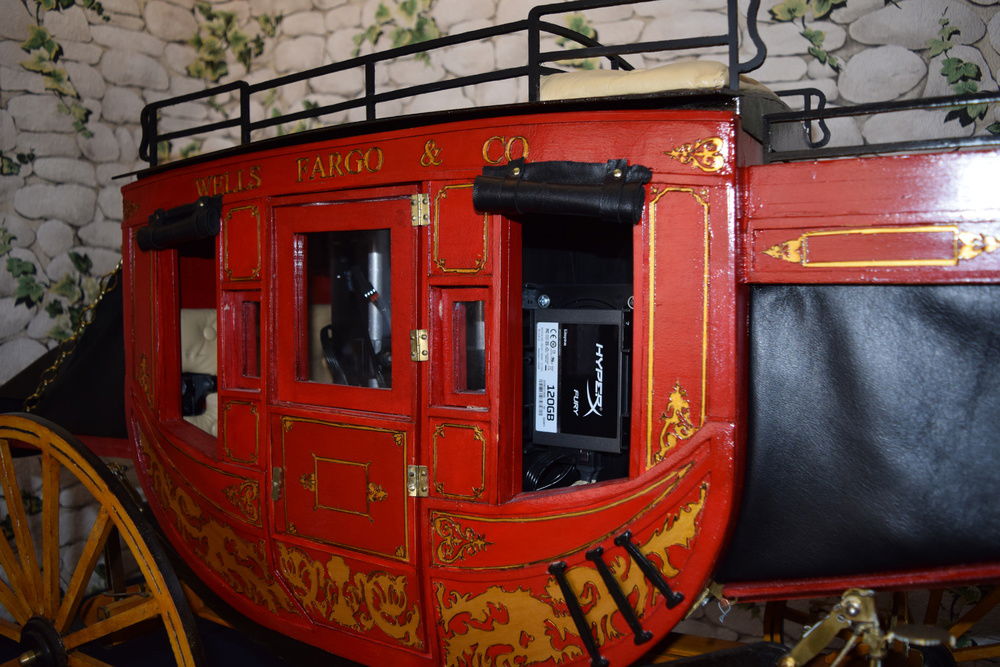 The project of “The Stage Coach” was born from the passion in designing, building and from the experience in the processing of various materials as aluminum, brass and wood. “The Stage Coach” is a real reproduction of the 1880 stage coach. For a higher strenght its frame is all aluminum with a treated wood covering. It has handmade beige leather seats and the buttons are covered with the same leather. The very important peculiarity is the roof that opens to 90° with a linear actuator powered by an electric switch. Therefore we have a larger space for maintenance. The motherboard is fixed on a black plexiglass sheet fixed on bushings positioned on two aluminum tubulars. The PSU is located in the back of the coach - the trunk – that is covered by black leather. The SSD are located behind the plexiglass sheet,. In the sides of the coach there are gold decorations. The machines used are: milling machine “Optimum” jig saw “Proxxon” welding apparatus for aluminum hand tools and a lot of dexterity.