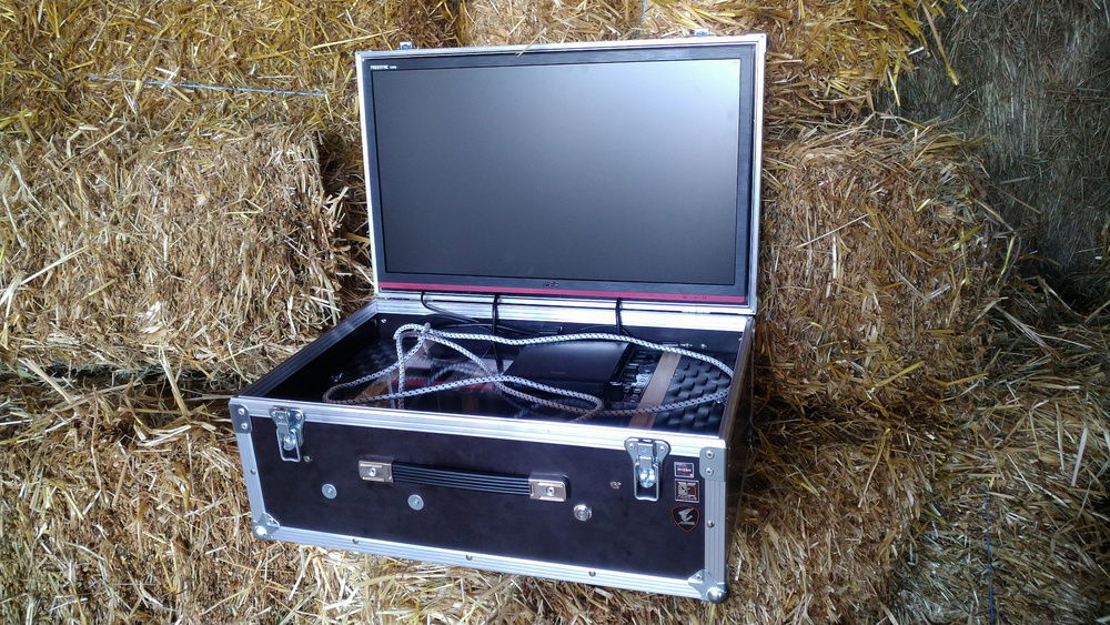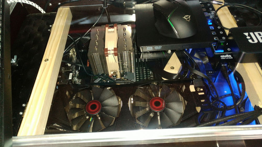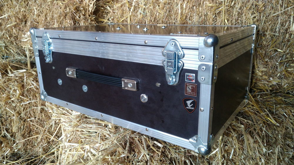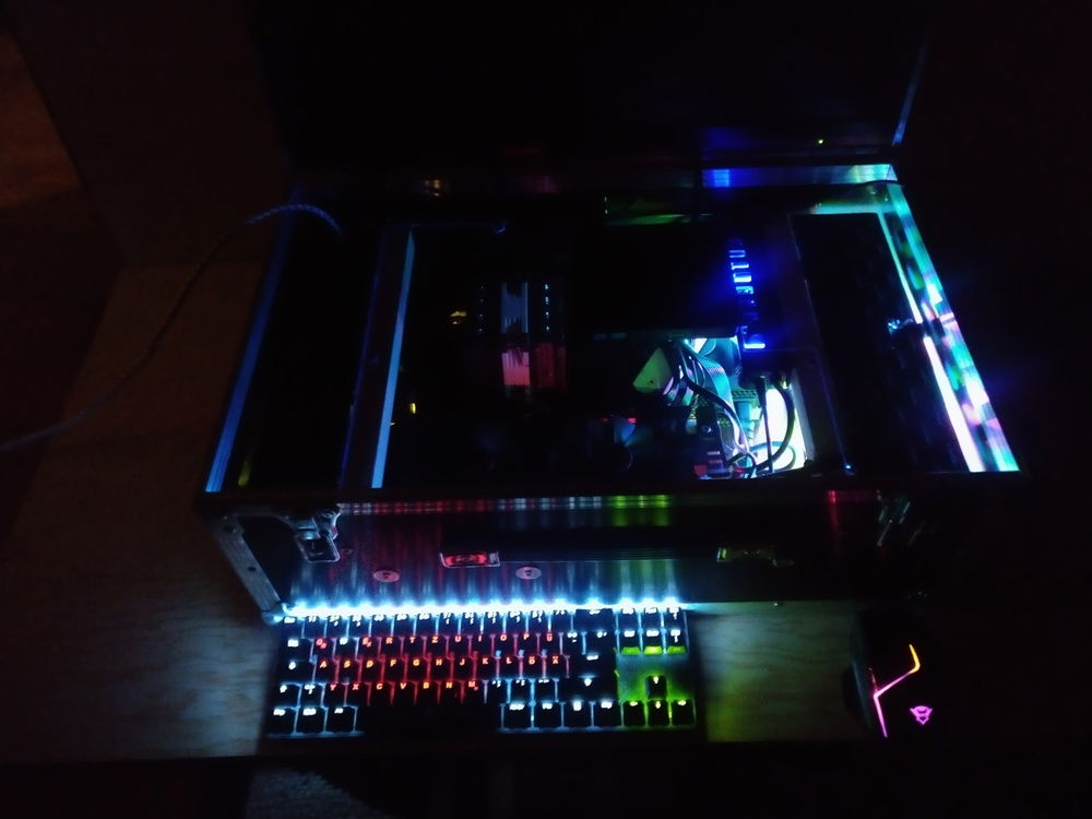 The goal here was to build a portable gaming rig with the full upgradebilety of a desktop. It got a bit bigger than i thaught but it works perfectly fine. It cost me a bit more than 1000 Euro and it weighs 18kg. All the pheripheals and cabels can be stored save in the case. It takes about one to two minutes to fully set it up.