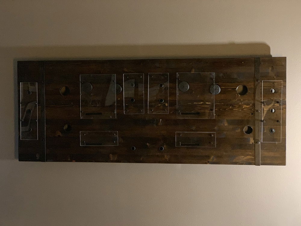 The final build was done in pine with a dark walnut stain and blackened bronze accent rivets.
