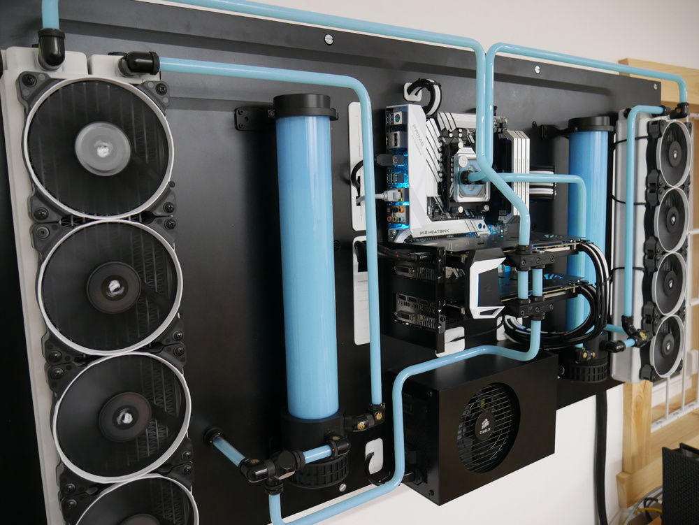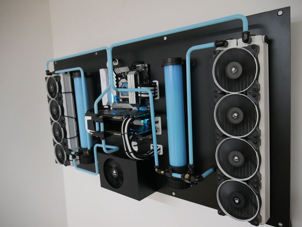 To celebrate the opening of my shop I decided to build a unique wall build PC for myself. The PC itself has a Ryzen 2700x, 2x GTX 1080s, 32GB of RAM, 500 GB SSD, and 3 TB HDD. The parts came from my last build including the main water cooling components. It has EK water blocks for the CPU and the GPUs. All the fittings are bitspower fitting and I'm using bitspower crystal link 12mm acrylic tubing. The radiators are 480mm rads from Hardware Labs, and I filled the loop with Mayhem's pastel white coolant and dyed it with Mayhem's blue dye to give it a light blue color. My last build was very bulky and took up a lot of space on my desk so I figured "Hell I'll just wall mount the PC". I made the frame myself using 1" square tubing and 1/4" acrylic which I cut using my X-Carve CNC router. Overall I'm very happy with the build and it looks great and it is for sure a center piece in the shop.