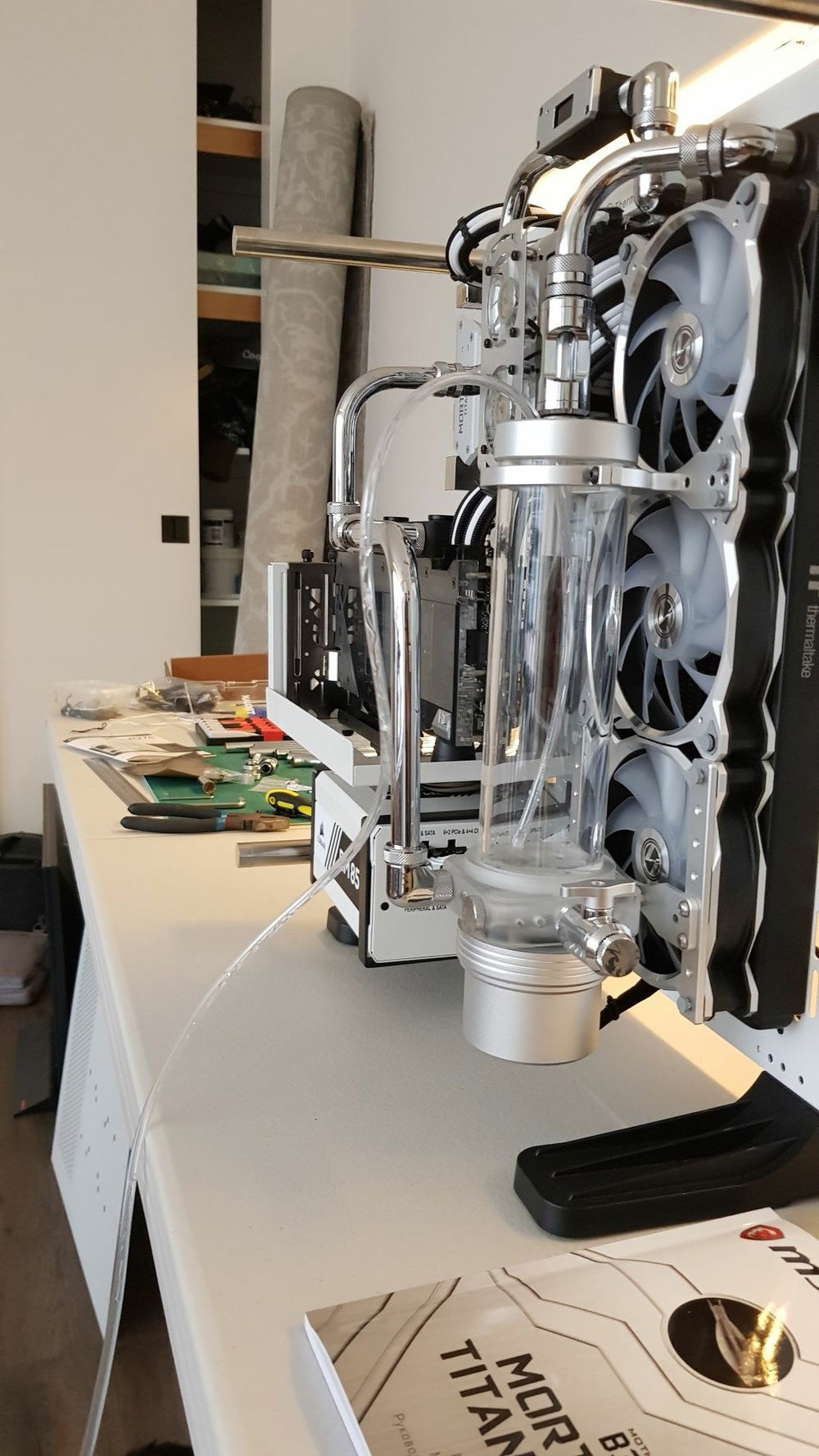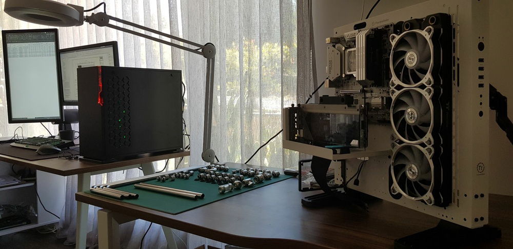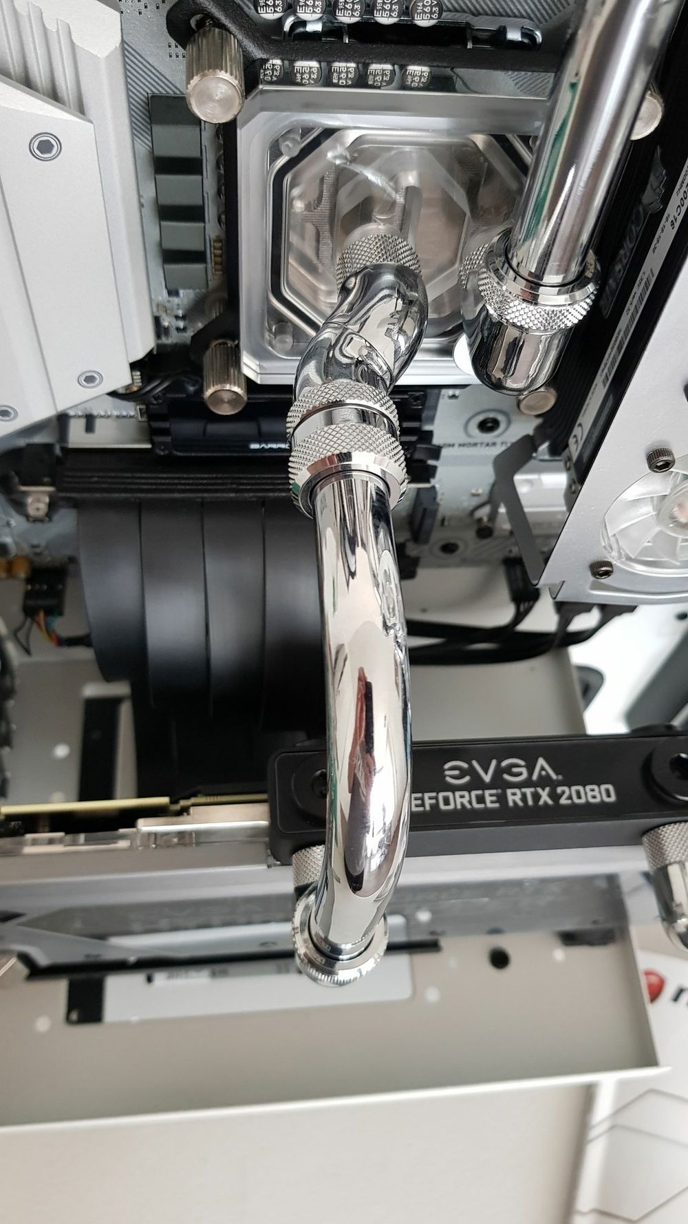 Mistakes made were: not wiring up the motherboard before piping up the GPU - made it very difficult to do after the GPU was installed. Changed the GPU - CPU connection, reducing number of fittings by one. I also bought too many fittings & didn't end up using the rotary anywhere in the system. My approach was to keep the runs as short as possible & reduce the number of fittings that could cause potential leaks. The EKWB leak testing kit proved to be worth the money spent. Pumping the system up to 0.5bar (50kPa) found a weakened O-ring at the temperature sensor. I replaced it and pressure held at 0.5bar for over a day before removing.