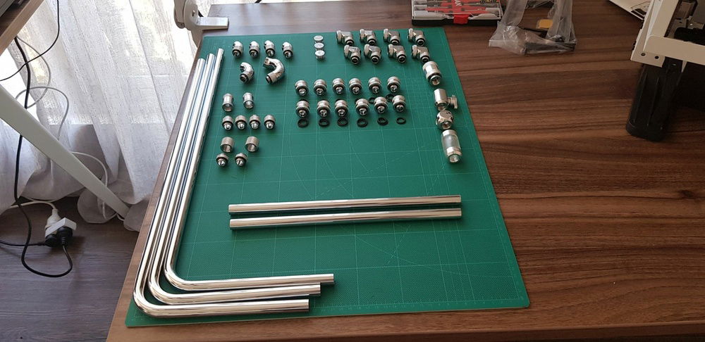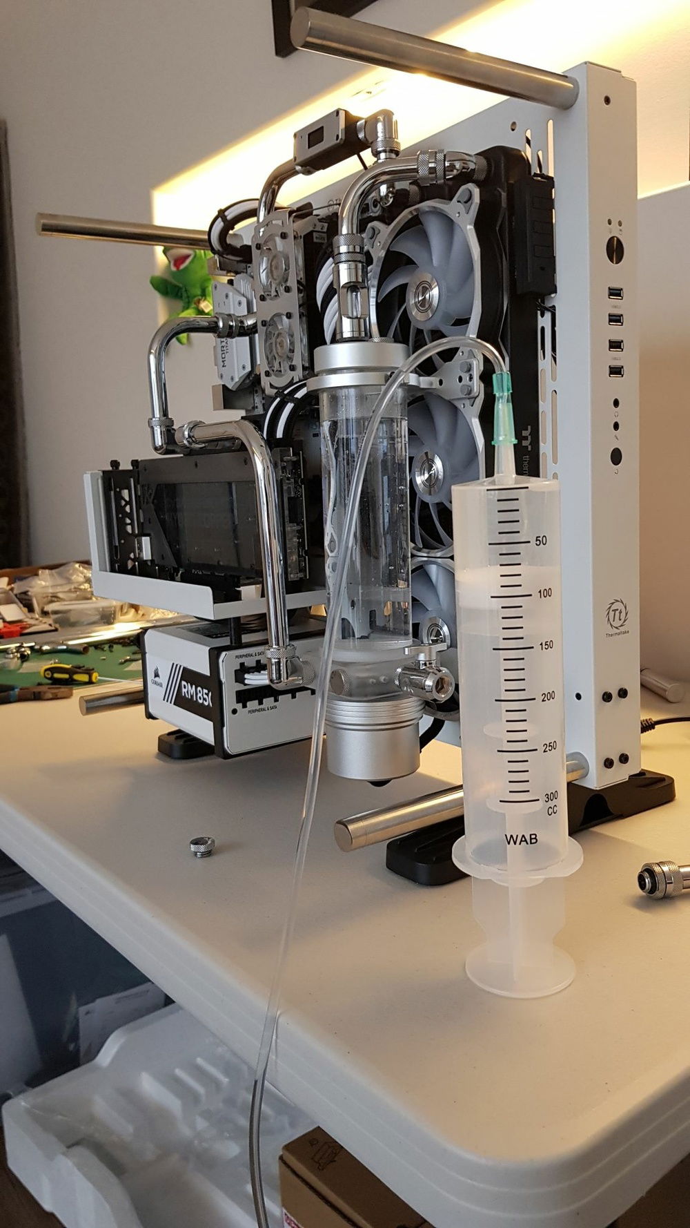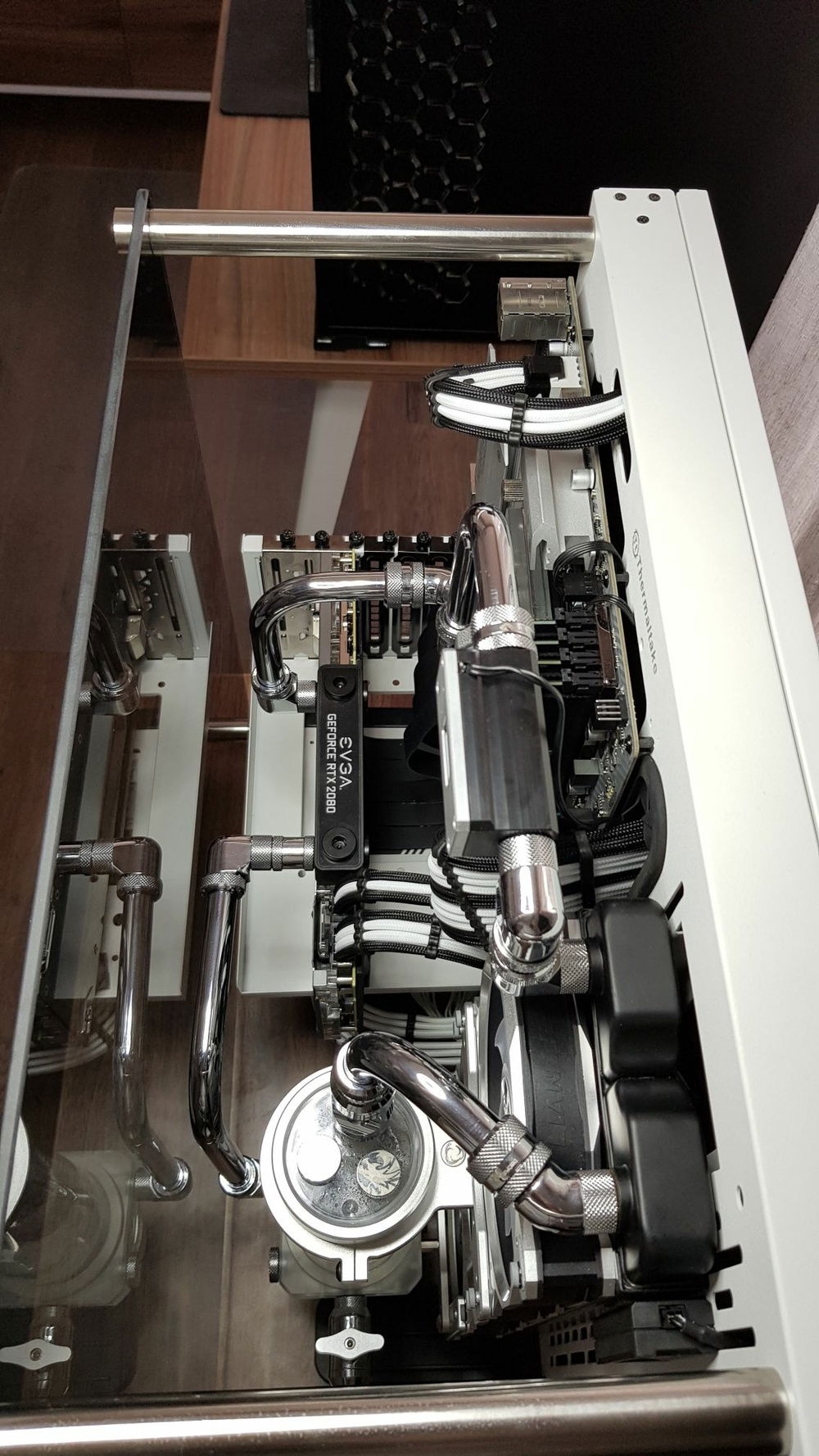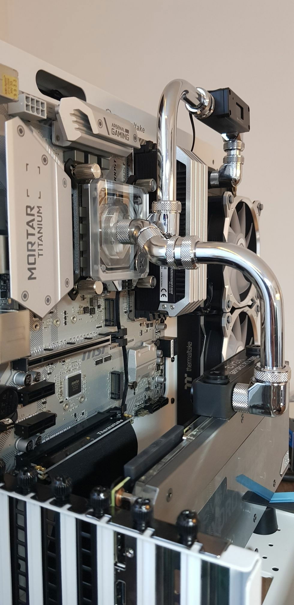 Mistakes made were: not wiring up the motherboard before piping up the GPU - made it very difficult to do after the GPU was installed. Changed the GPU - CPU connection, reducing number of fittings by one. I also bought too many fittings & didn't end up using the rotary anywhere in the system. My approach was to keep the runs as short as possible & reduce the number of fittings that could cause potential leaks. The EKWB leak testing kit proved to be worth the money spent. Pumping the system up to 0.5bar (50kPa) found a weakened O-ring at the temperature sensor. I replaced it and pressure held at 0.5bar for over a day before removing.