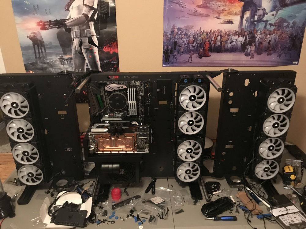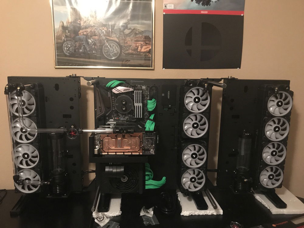 Intel i9 9900k MSI MEG Ace MB, Two 2080 ti in sli. 32 gb of G Skill TridentZ memory at 3600mhz. Evga 1300w psu, M.2 Samsung 970 Evo 250g for operating system, M.2 Samsung 970 Evo 1tb for primary and Samsung evo 860 1tb SSD for secondary. Two Thermaltake 480 Rad, Two alphacool all Cooper 240 rads.