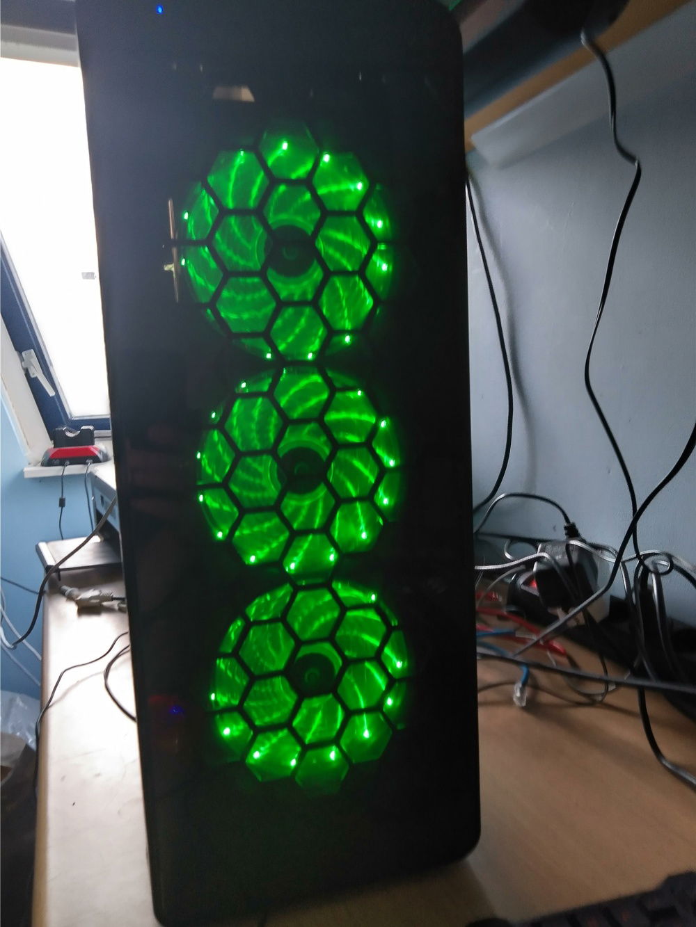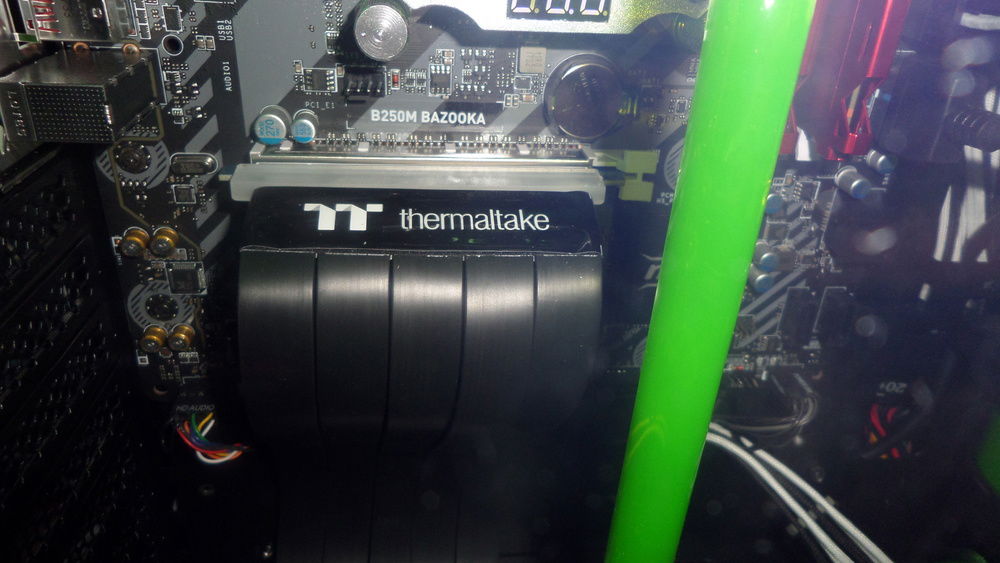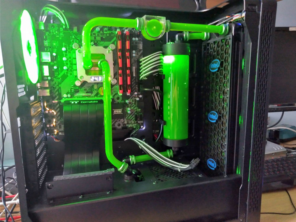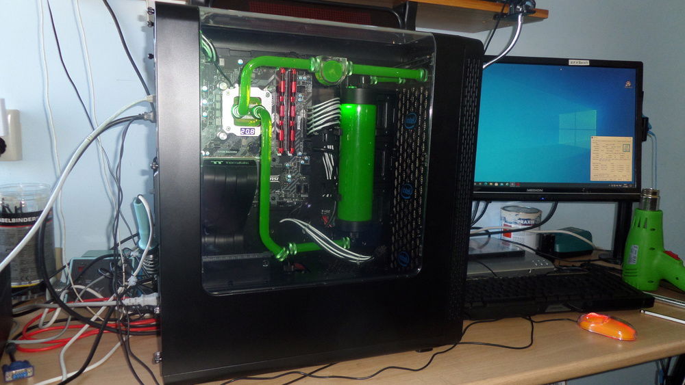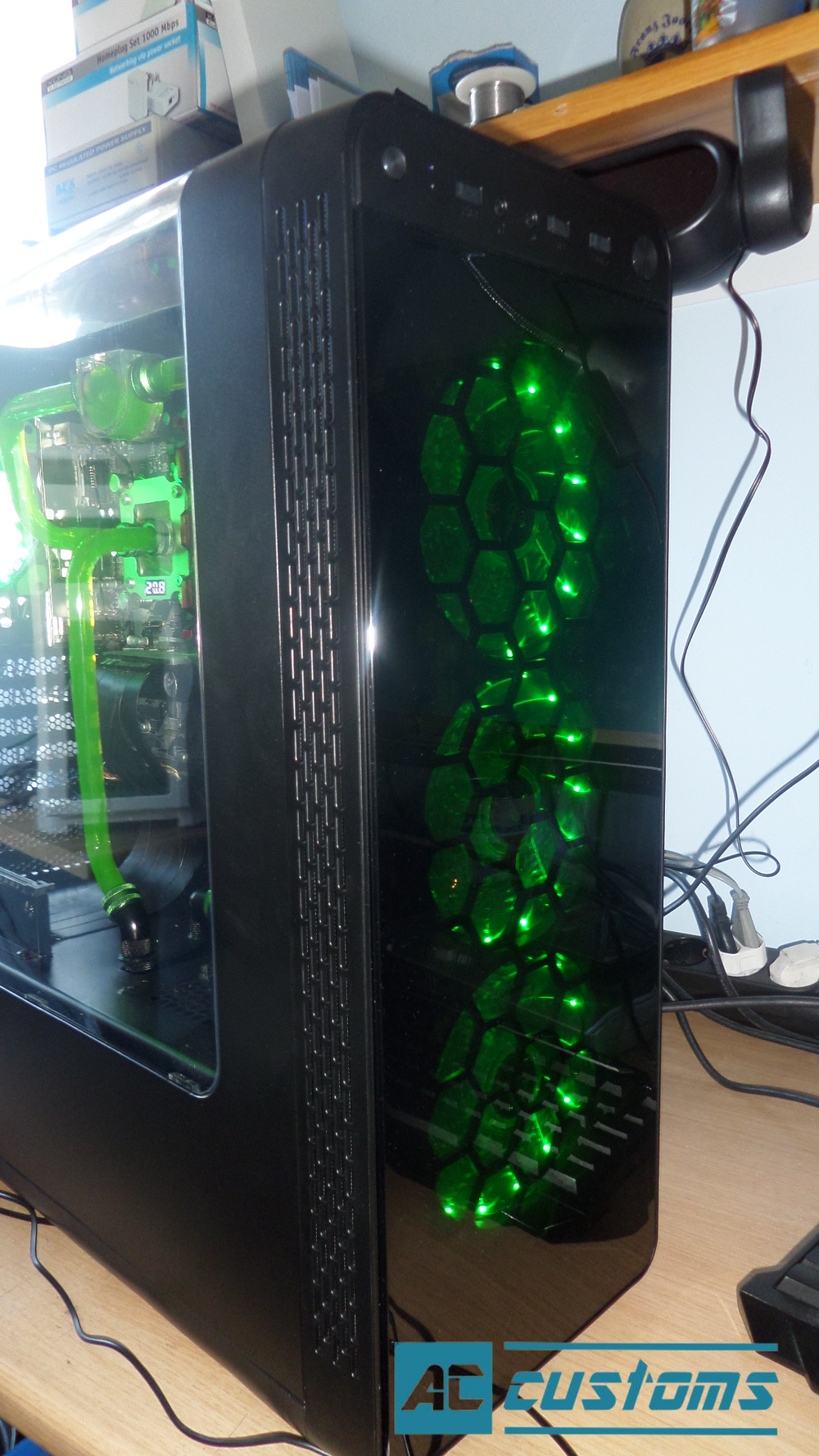 The memory will be changed in the future by 4x 4GB DDR4 2400MHz. At the first picture yoy can see a long LED light in the reservoir changed this with a small plug wit an green LED in it.
