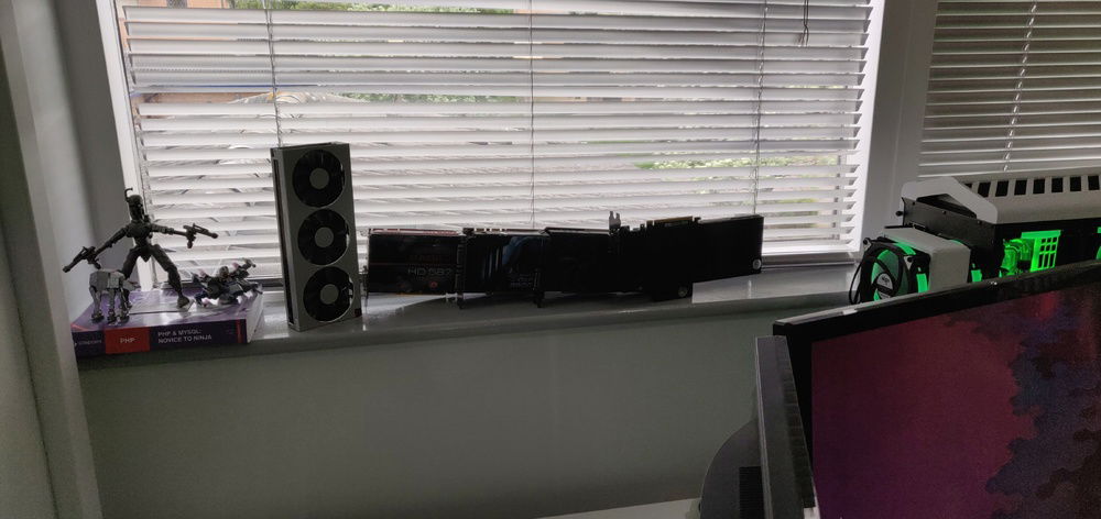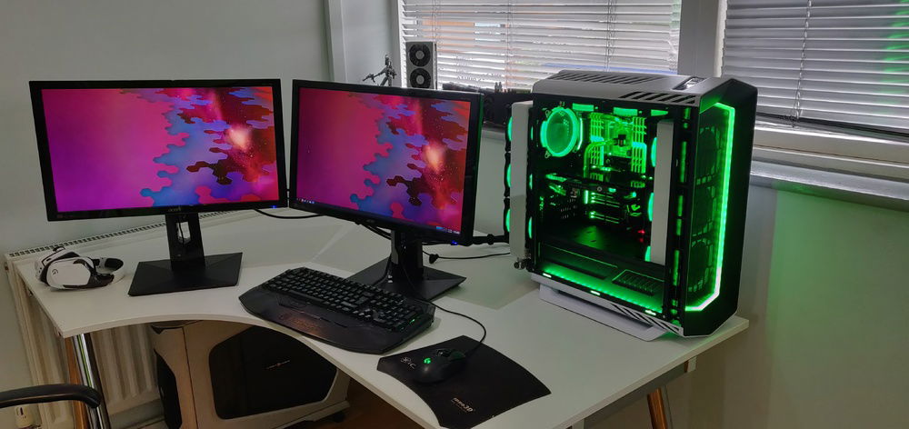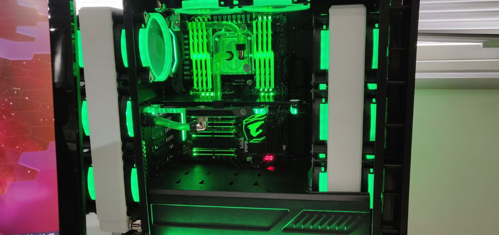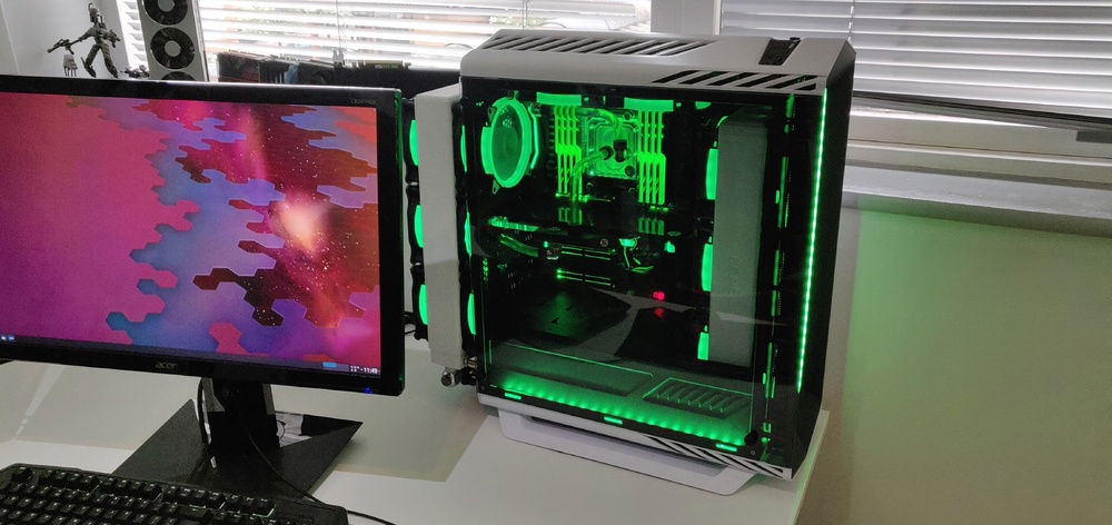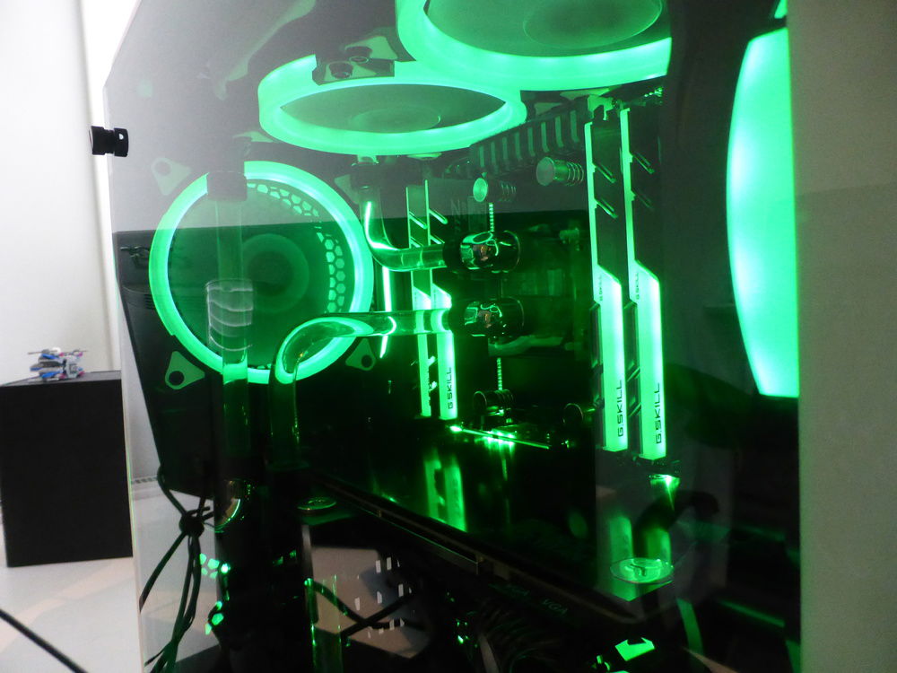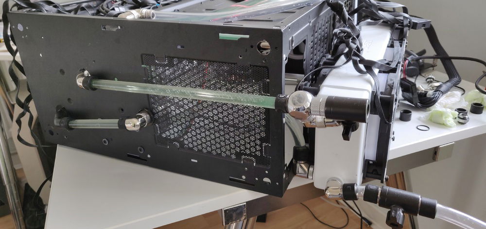 A Threadripper build with a focus on minimalist watercooling. I want the benefit of watercooling but with as few tubes and fittings visible as possible. The pump is hidden behind the shroud and one of the tubes is routed outside the case to the rear radiator through a fake fan,
