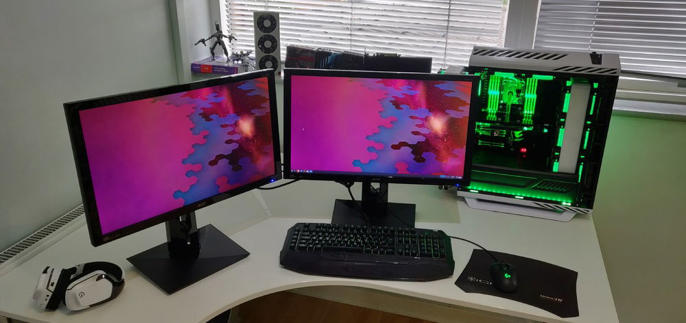 2x 4k IPS screens. I prefer the higher pixel density. Previously had a 28" TN 4k and although a huge upgrade from my 1080p monitor, looked pixelated compared to the Retina display in my Macbook Pro so upgraded to 2x 24" 4k screens which look beautifully sharp.