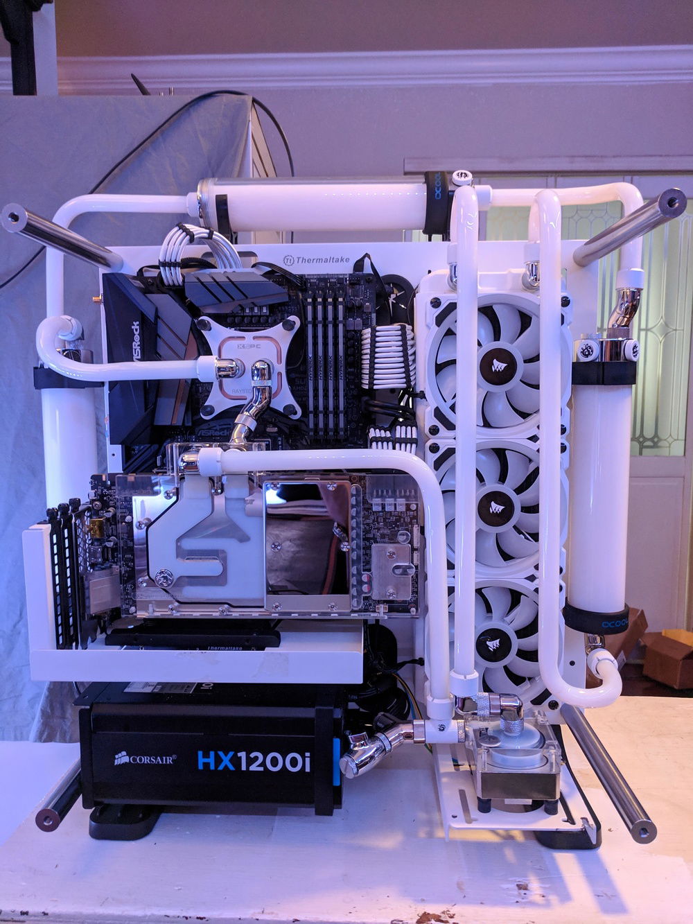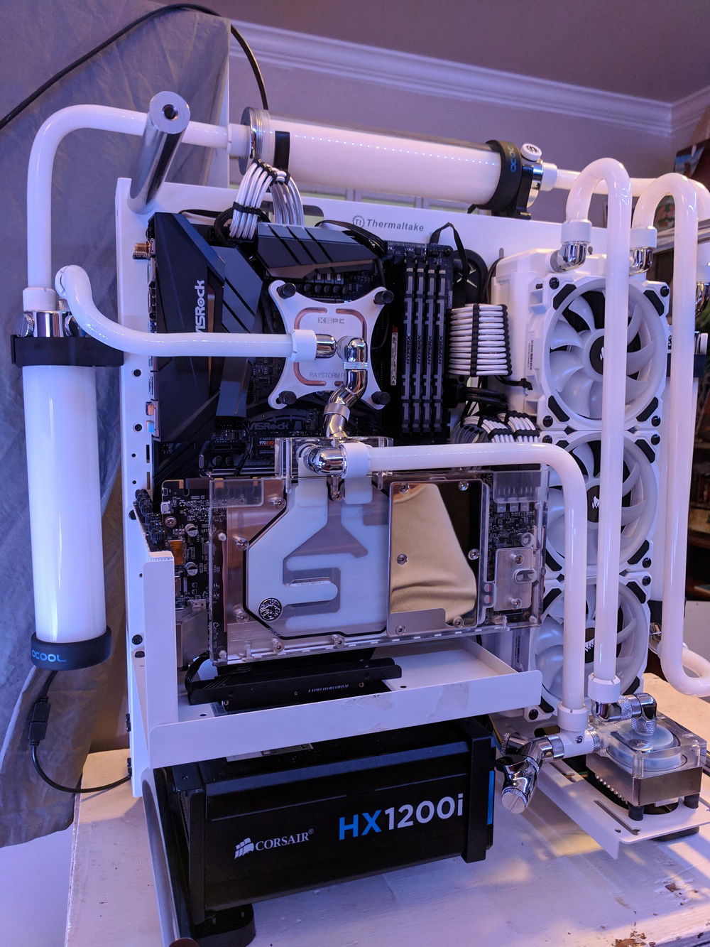 Build started with the Snow white Thermaltake Core P3, a favorite case for me. Originally it was supposed to be a simple motherboard and CPU upgrade on an old case using an Asrock Extreme4 z390 and 9600k. Once the part showed up, it was realized one or both were DOA and I had to RMA, and that point I went bigger. Moved the to the Core P3, Asrock Z390 Taichi /w the 9700k. Decided to go a custom loop with various components hand picked for quality.