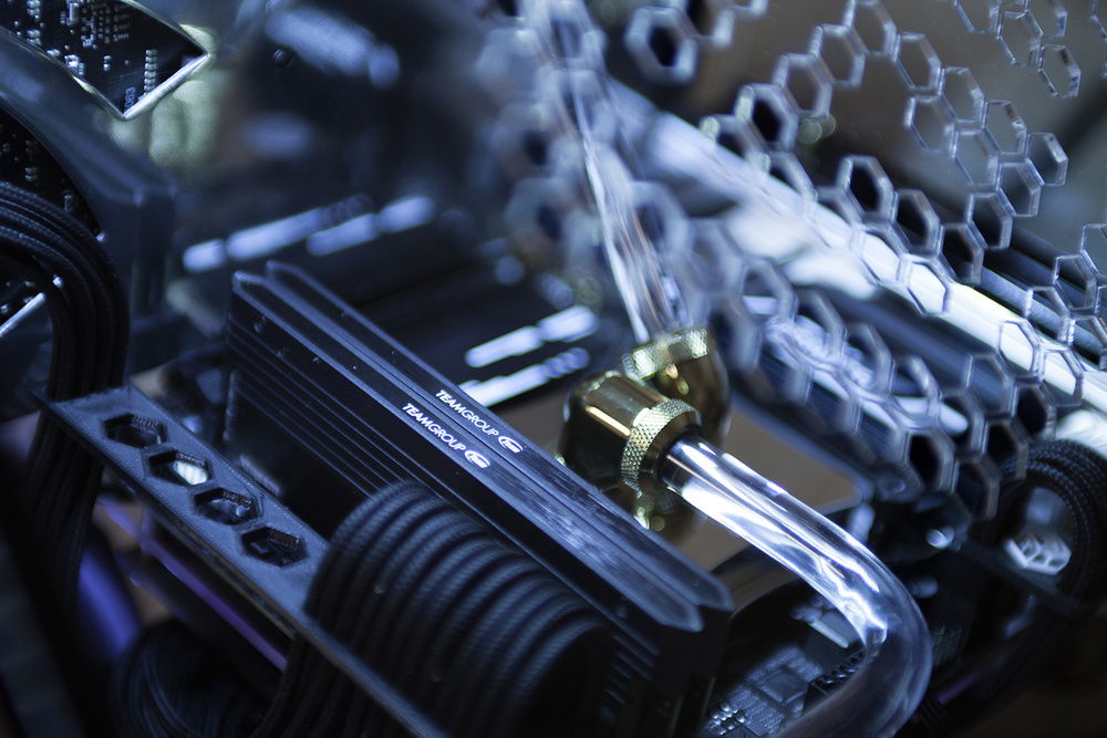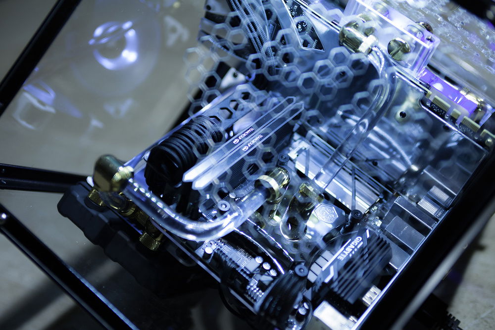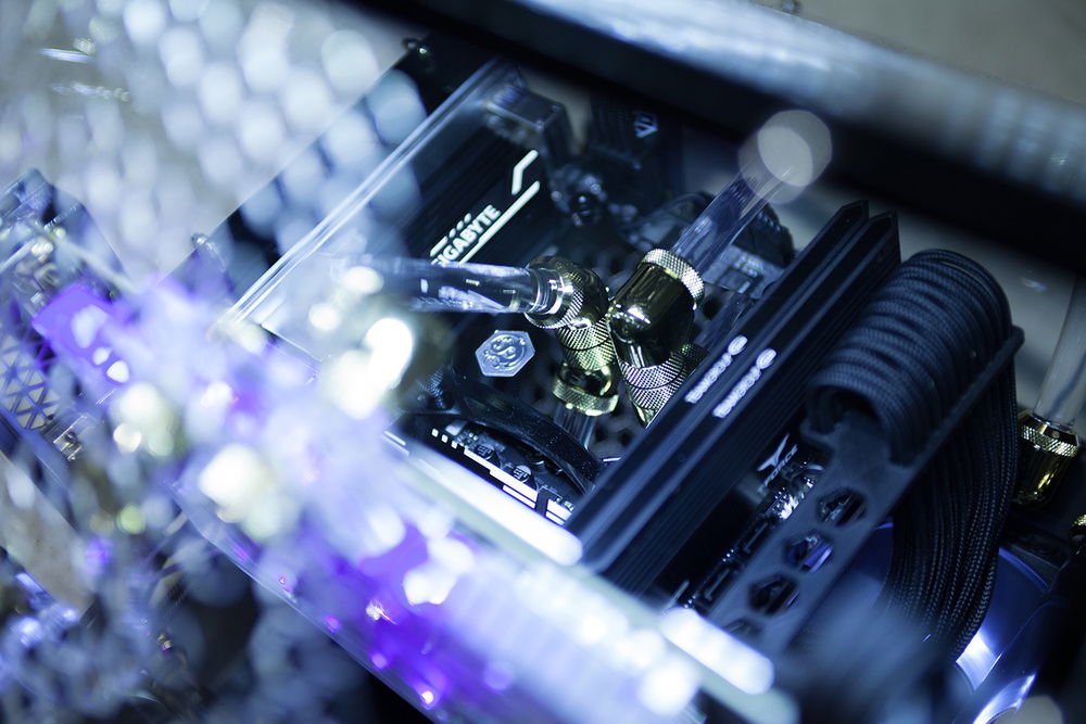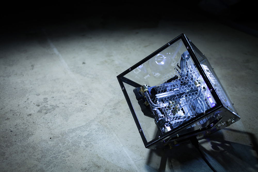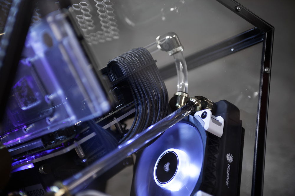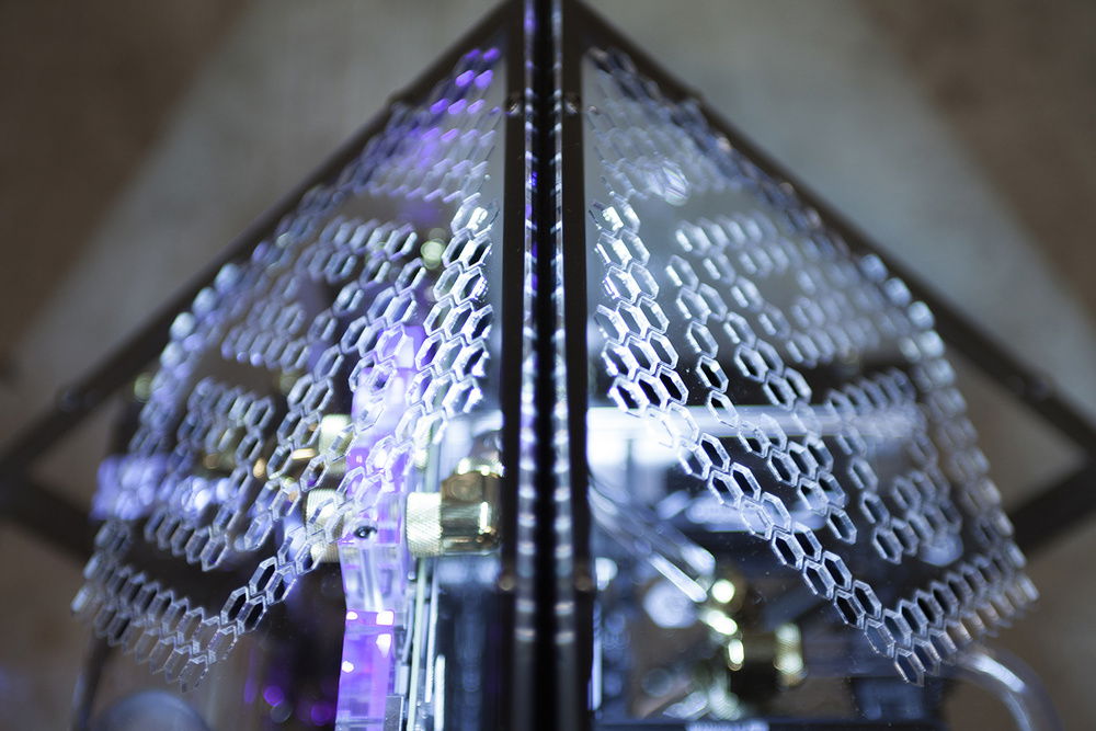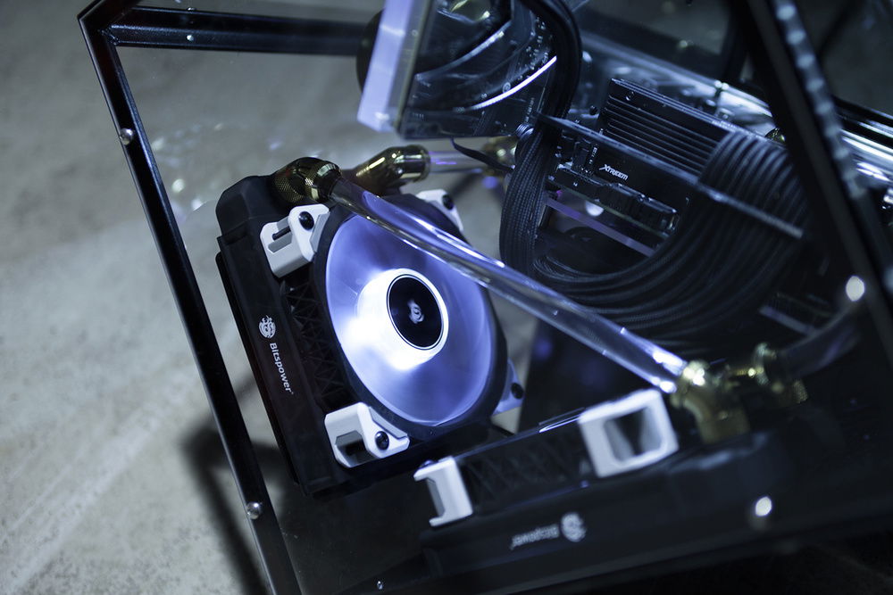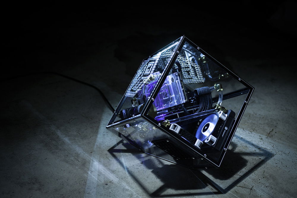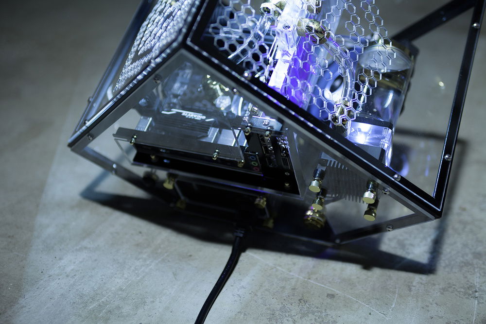 TILT is meant to be my signature project, built from scratch and fully designed by myself. It features a welded steel frame with a custom gold-flake paint. Everything from motherboard tray, to polished backplate, to cables and cable combs are all custom made. The shape together with the laser cut acrylic sides gives this project a modern art appearance.