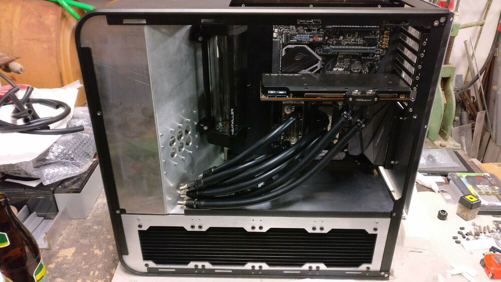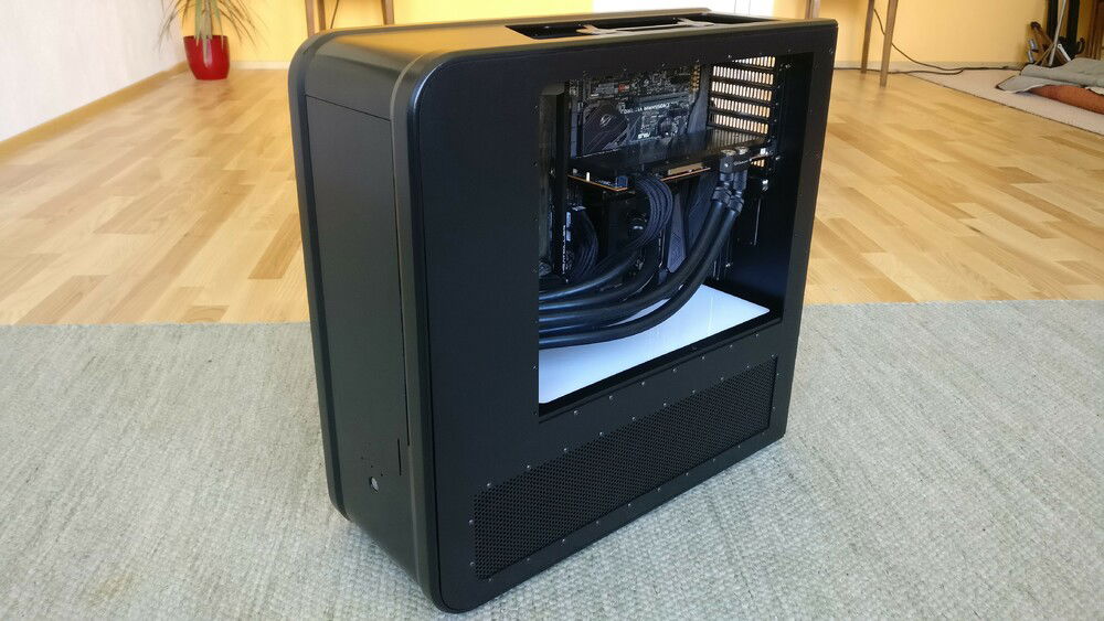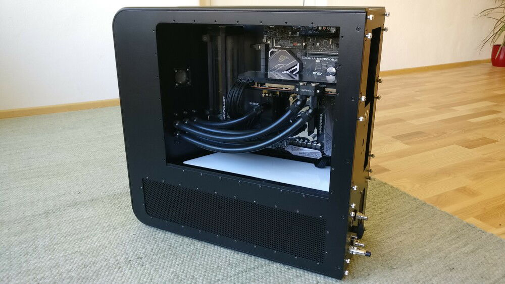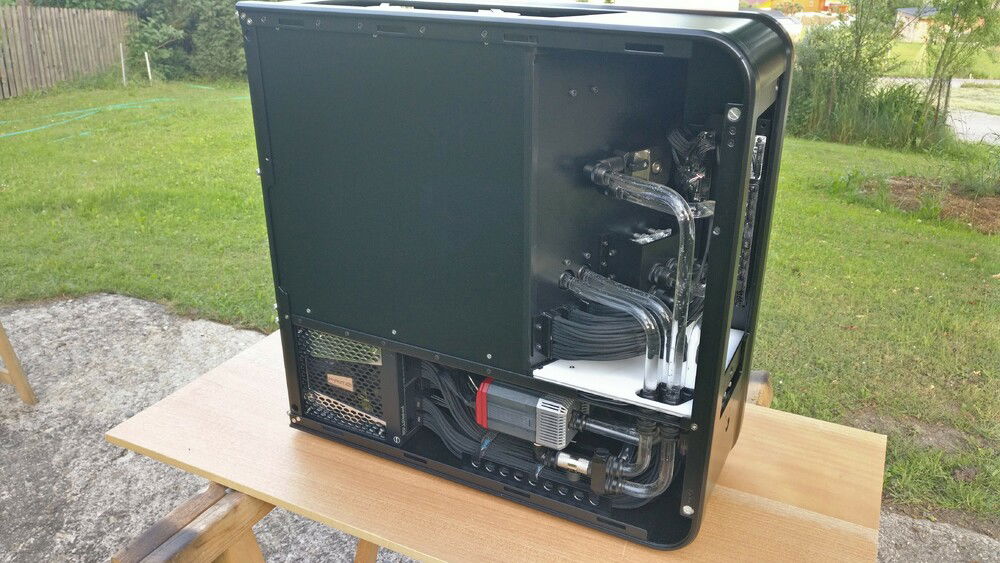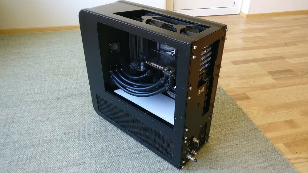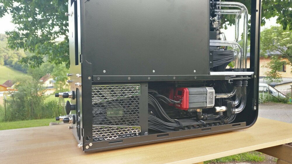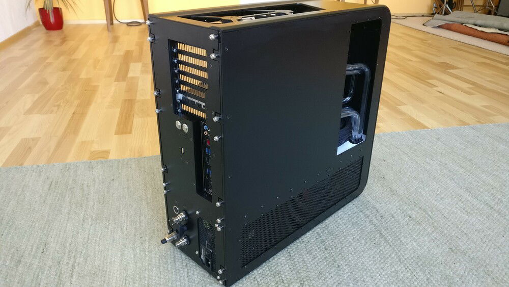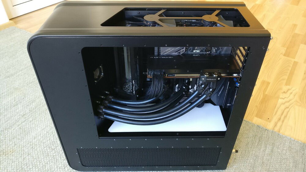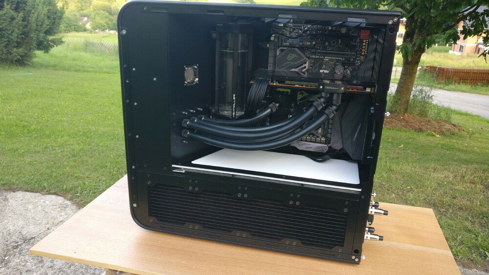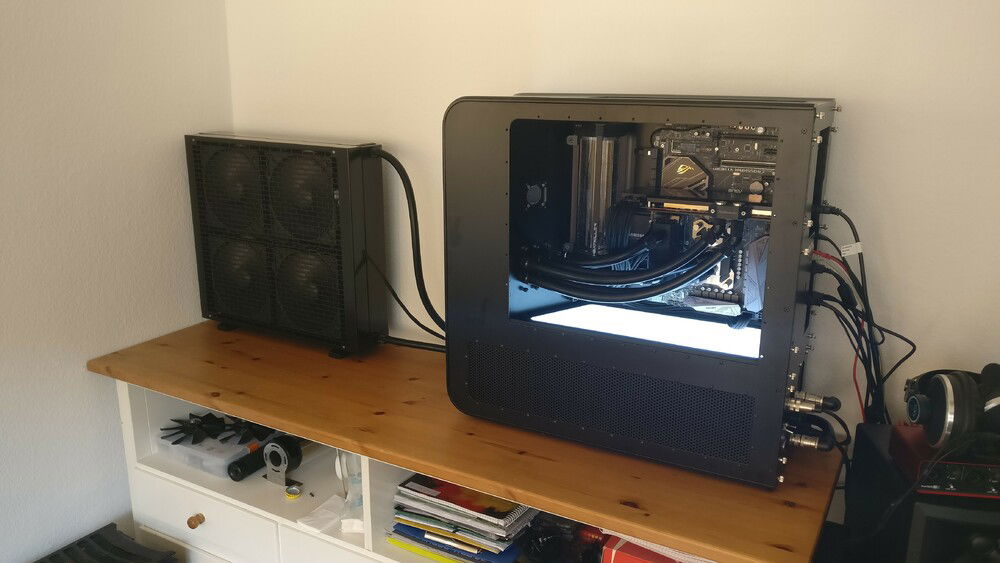 The idea behind the whole thing was not only to get a more compact case, but one which allows me to quickly remove my hardware without the need for draining the whole loop. For cooling capacity I now rely on a MoRa which does the heavy lifting, the internal radiator just serves as a backup in case I can't use the external one (for whatever reason).