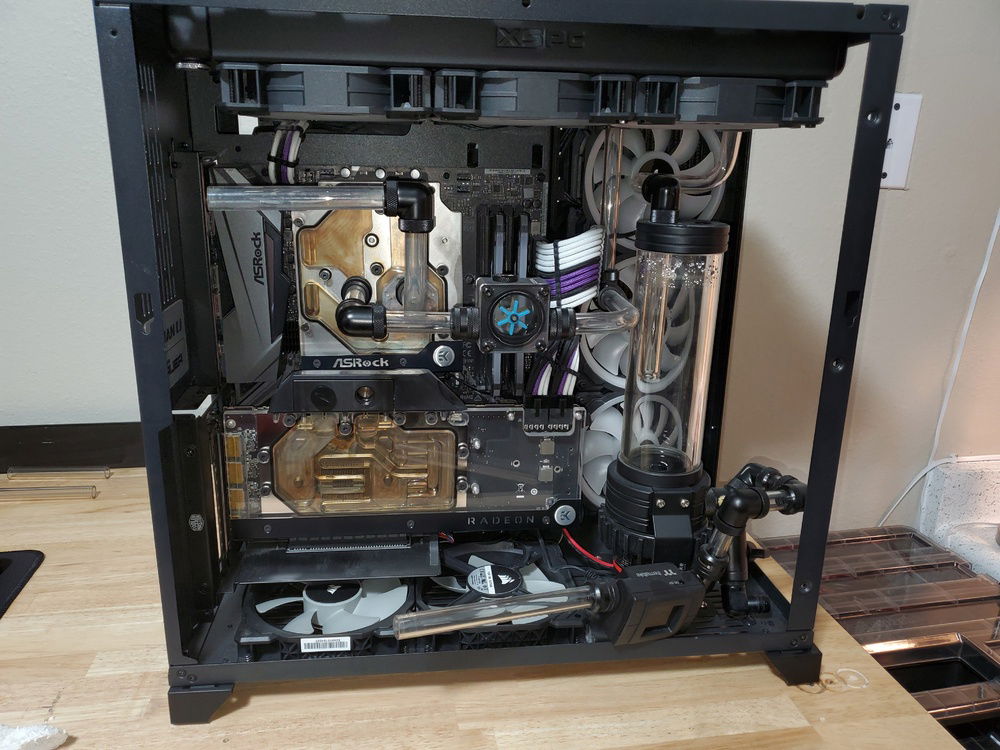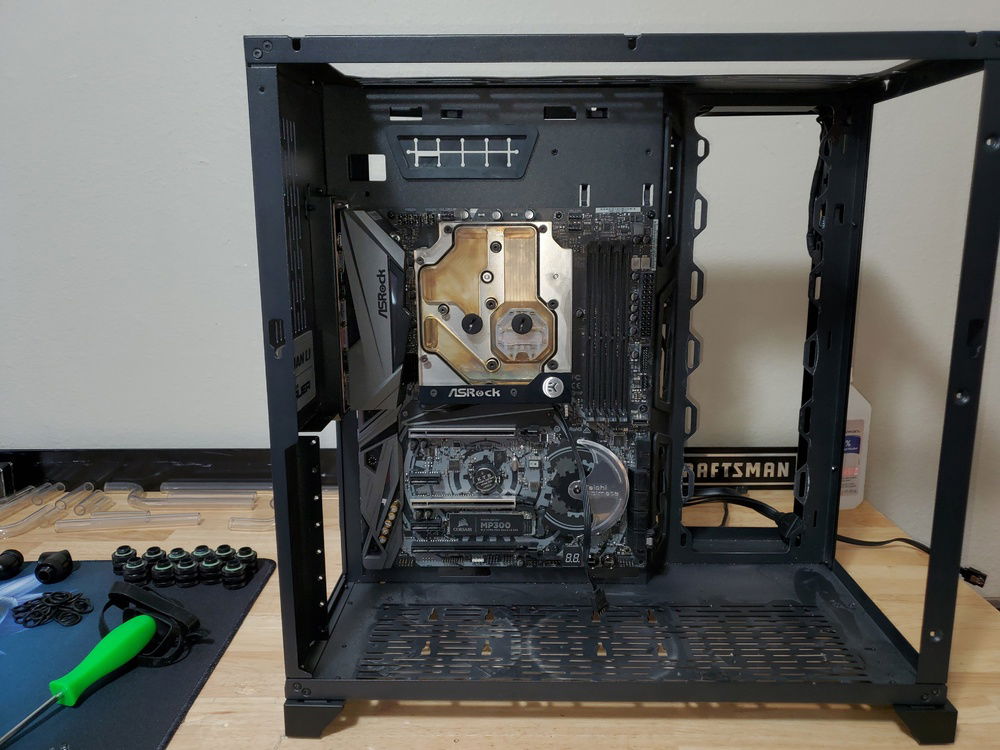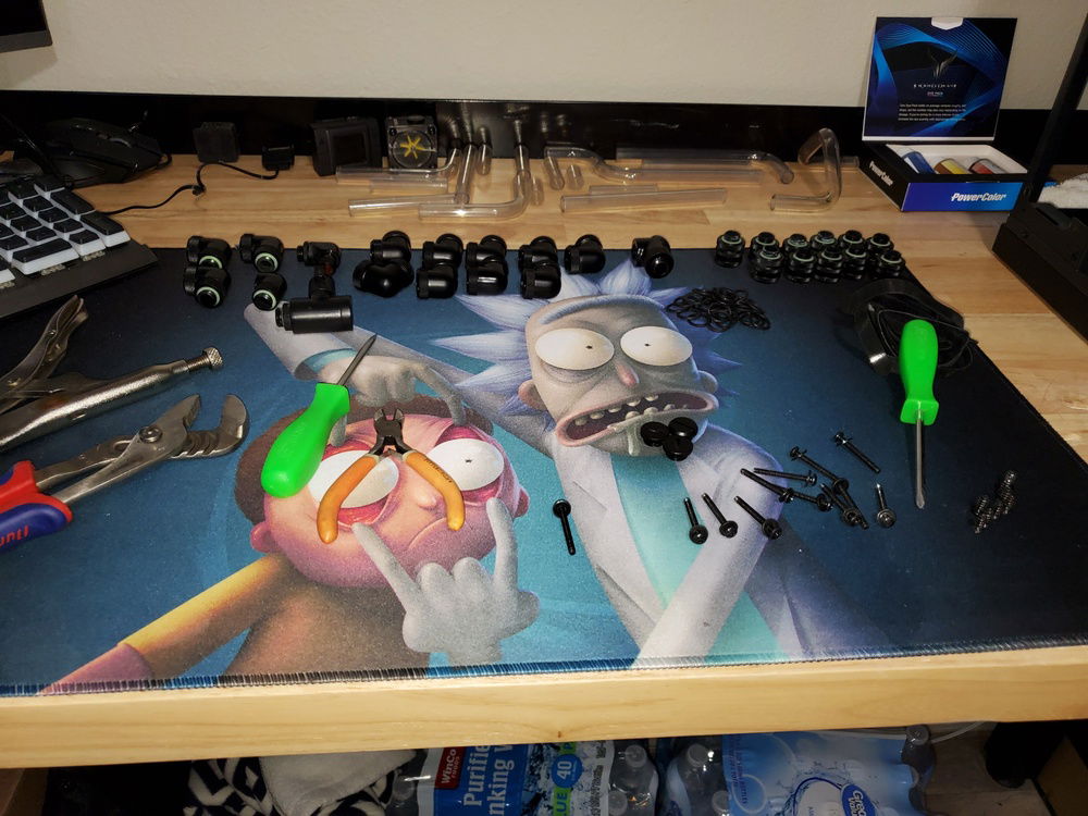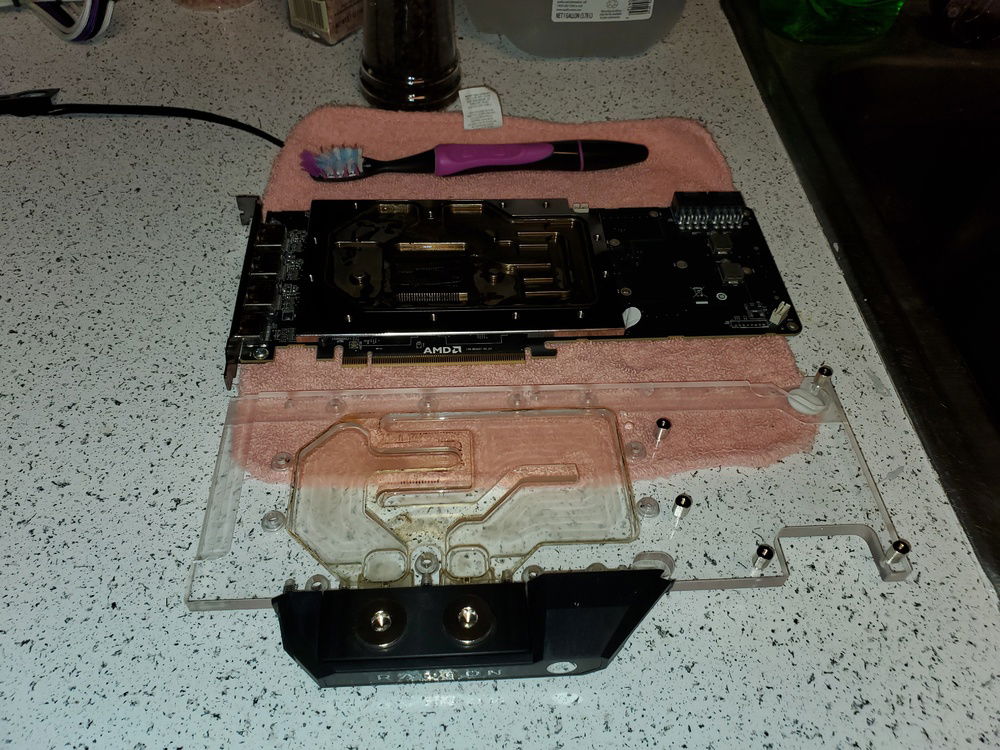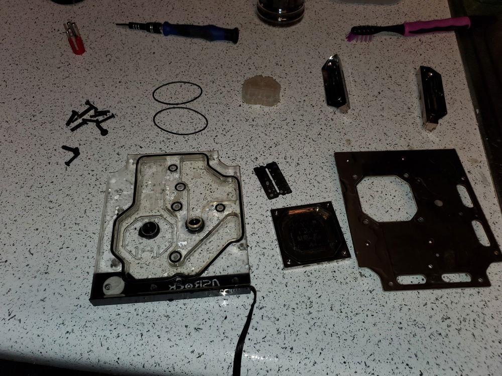 I started tearing a part this rig to clean an redo the loop. I will eventually put it all back together will almost all the same gear, just a new loop design. I was worried because as you can see in a couple of the pictures, the CPU and GPU blocks looked pretty bad and I did not know if they would come clean. Due to lack of room where I was living the system did not get cleaned for over a year. But they came pretty clean, a tooth brush and some soap worked wonders. I am glad I am tearing it apart as I forgot how much of a rats nest my cable management was. I will be able to spend more time on it all this time to make it all look better all around.