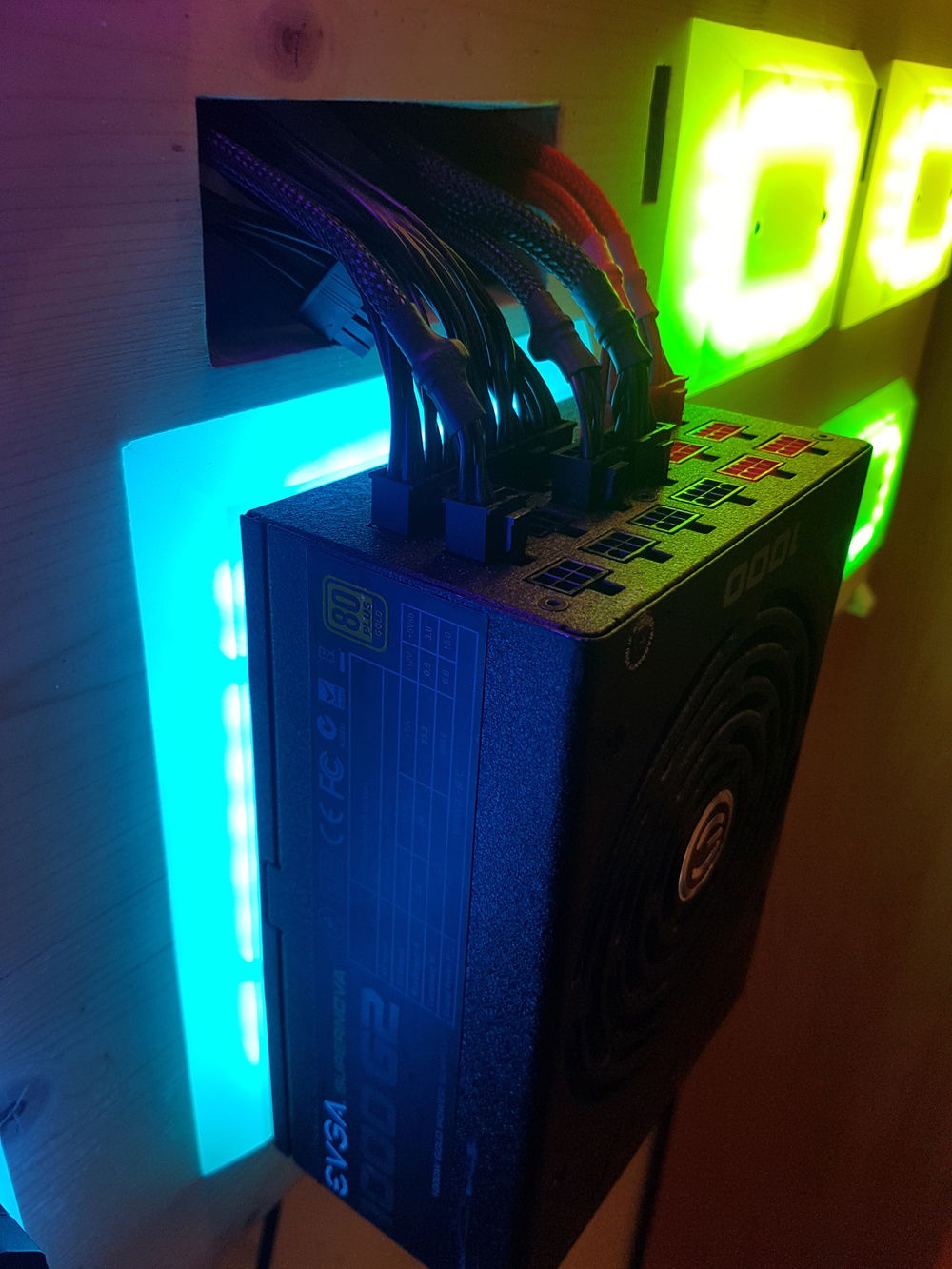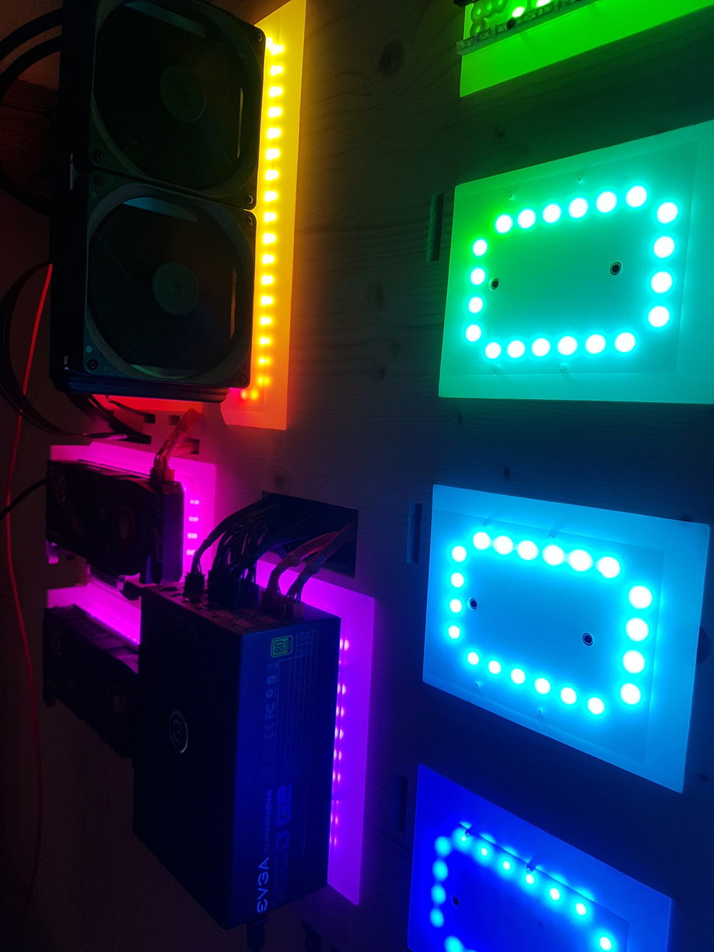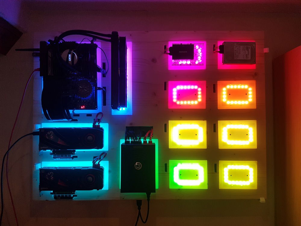 Wall mounted Threadripper build with 356 adressable RGB LEDs. The LEDs are controlled by an esp8266 running my own Software for the effect of an color wheel over the whole Plate. It is still a Work in Progress the empty plates in the right are for 8 HDDs in raid 10. The Plan is to make it a Workstation with Linux as Main OS for Work and a Windows VM for gaming.