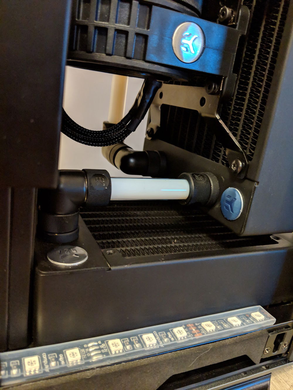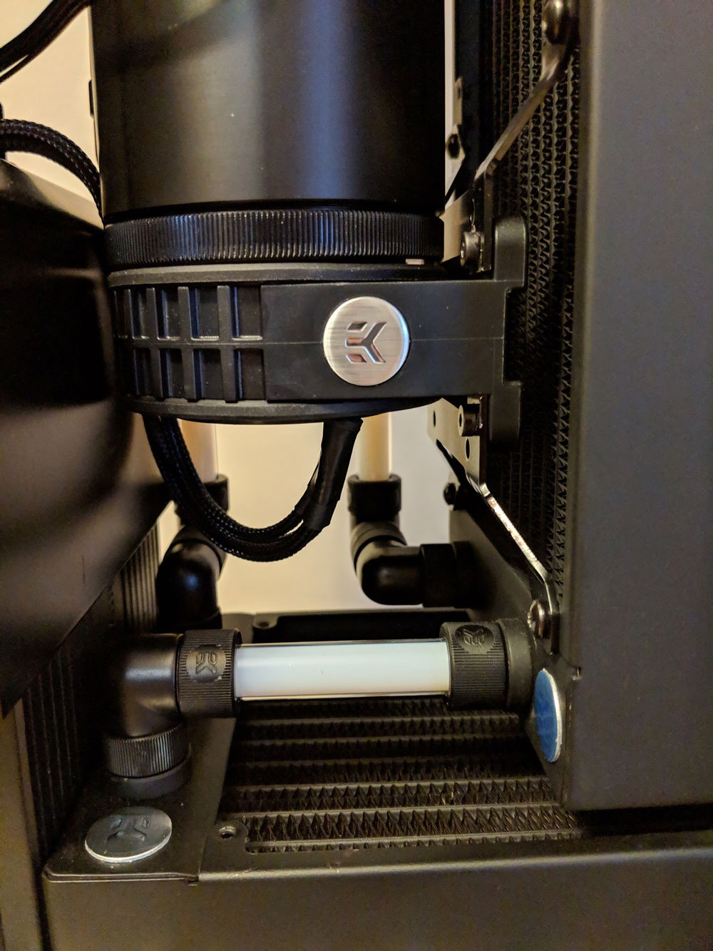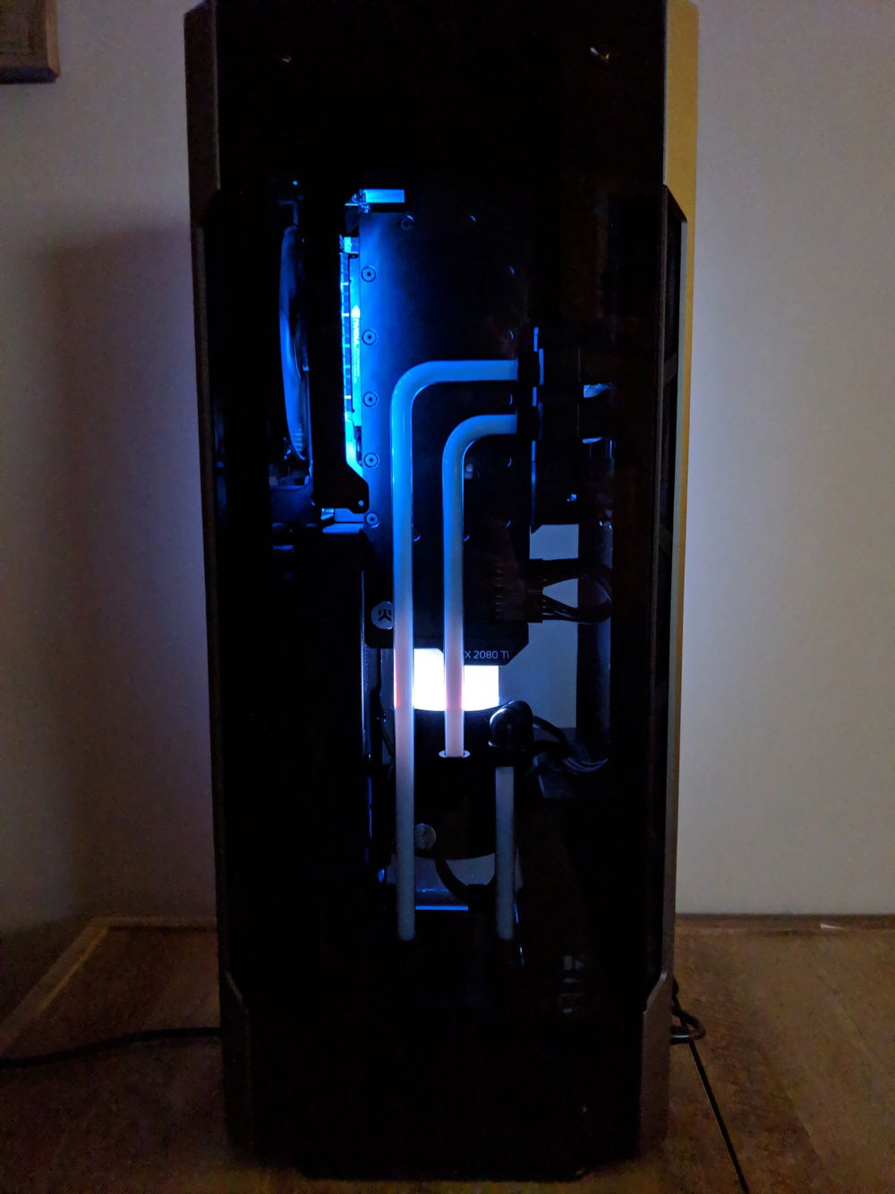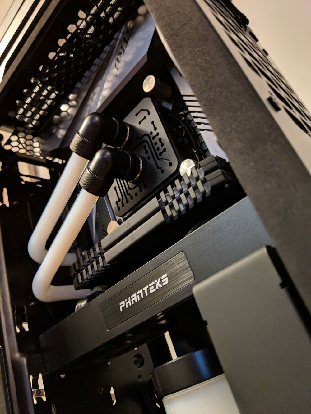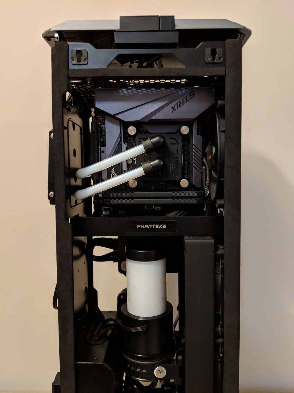 My Phanteks Shift X build featuring Mayhems' 90° glass tubing and Silicon Lottery 9700k 5.1Ghz @ 1.365v . It's a Shift X, so temps aren't super great but I love the aesthetic and working with the glass tubing was a new challenge for me.