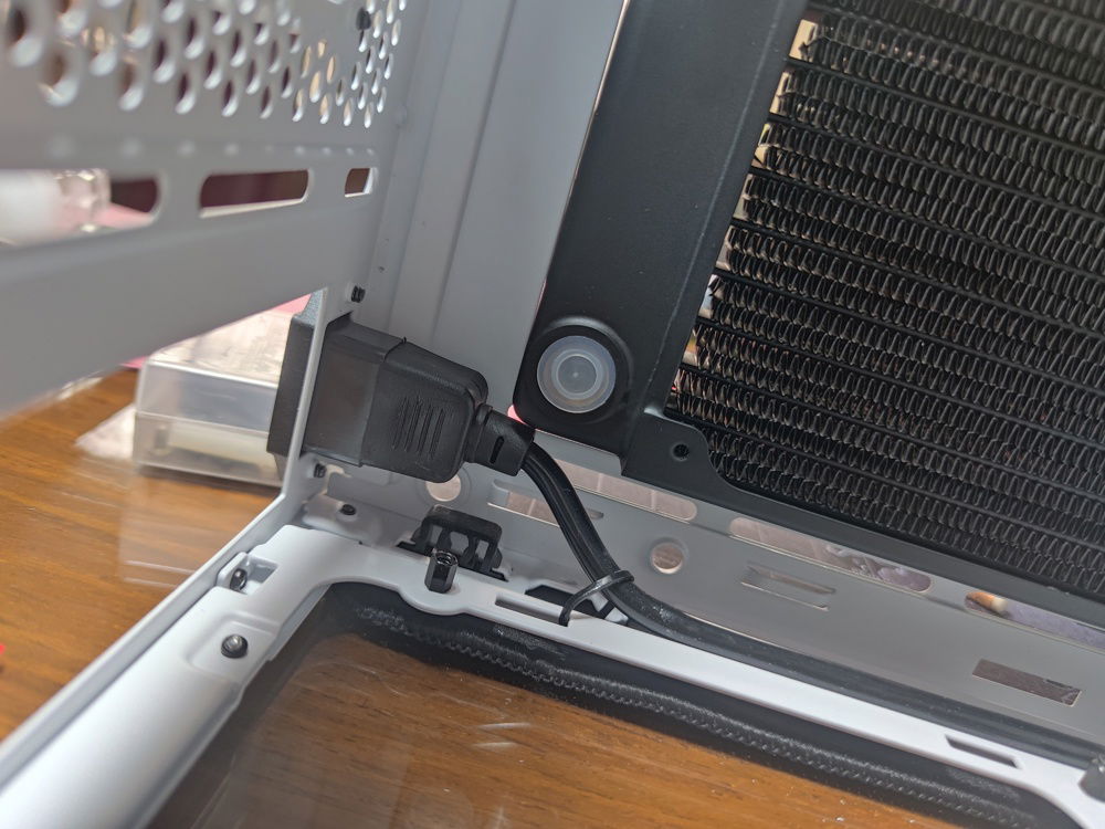 The radiator mounted. I moved it to the side towards the glass panel to clear the power cable housing on the other side.