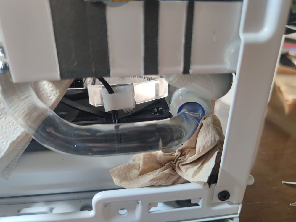 Just removing the bottom panel was nerve wracking since I had to hold up the radiator as I was removing the fan screws and water cooling tubes - without spilling any water onto components - poor planning on my part before I jumped in.