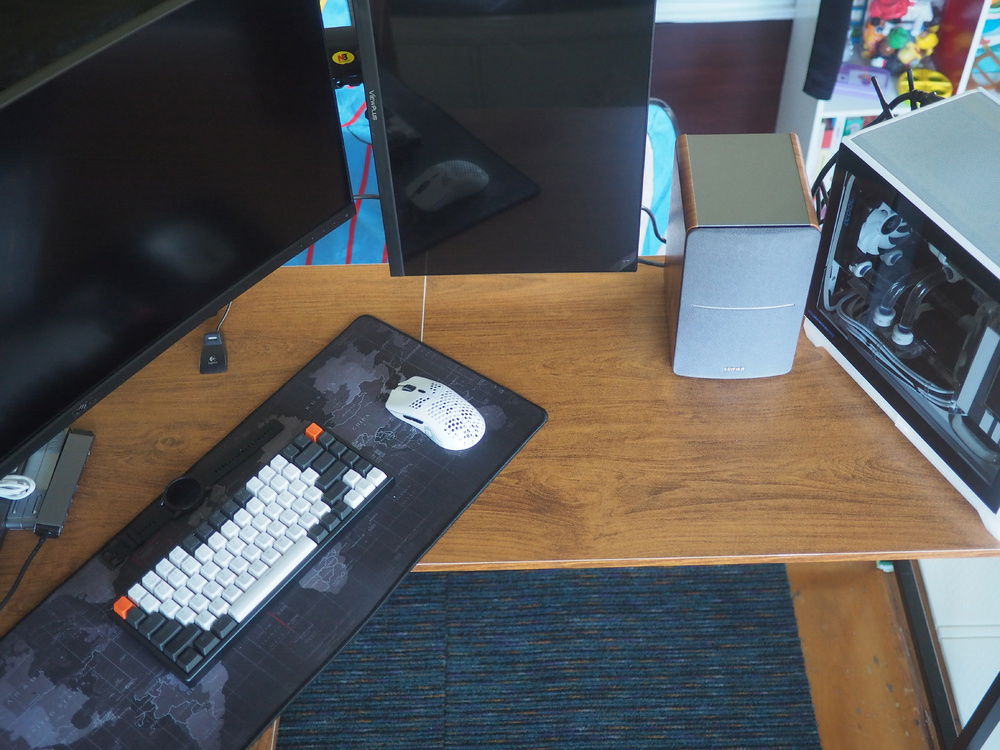 Top view of the work - game space. Speakers were reverted back to my old Logitech Z5300s. For 17 year old speakers, they really rock.