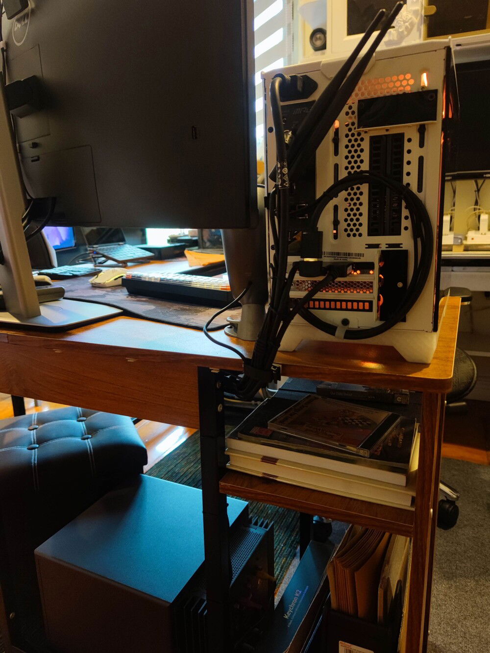 The wires leading to the external fans are less noticeable this way.