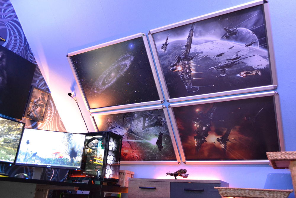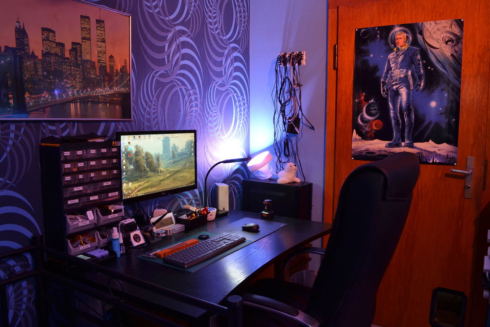 Some more years have gone by and I upgraded some stuff again. This is Tronnic's Battlestation Version 3. The system basically stayed the same, but all peripherals changed. I also rearranged my living room, put some foil on my desk to match the rest of my furnitre, got frames for my posters and added some more LED's and decorations to the room.
