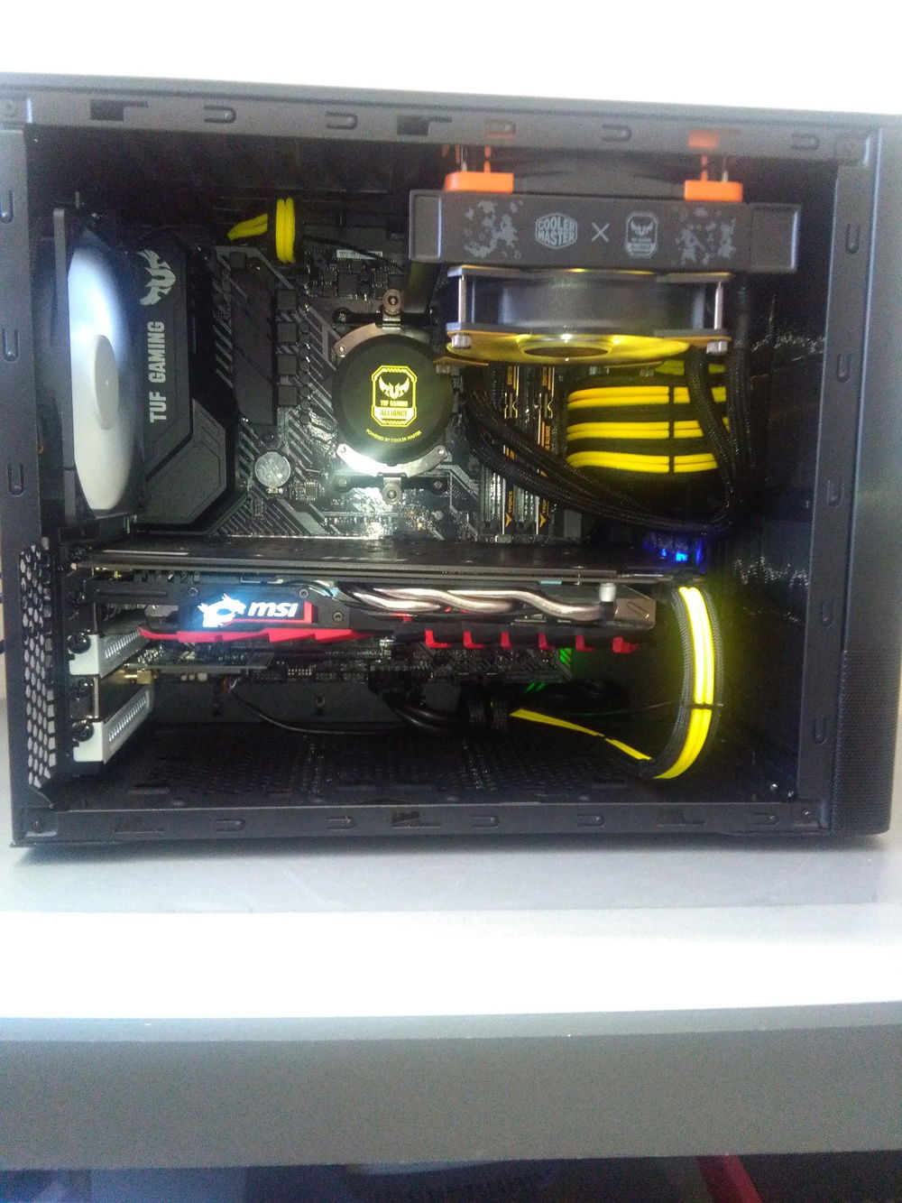 There it is a new pc build but not one I expected a tuf themed AMD RYZEN 5 2400G Quad-Core 3.6 GHz (3.9 GHz Turbo) Socket AM4 65W ASUS TUF B450M-PLUS Team T-FORCE VULCAN TUF Gaming Alliance 16GB (2 x 8GB) 288-Pin DDR4 SDRAM DDR4 Seasonic FOCUS series SSR-750FM 750W 80 + Gold Power Supply, Semi-Modular, ATX12 HP EX900 M.2 120GB PCIe 3.0 x4 NVMe 3D TLC NAND Internal Solid State Drive (SSD) Seagate Hard Drive ST3000DM008 3TB 7200 RPM 64MB Cache Cooler Master MasterLiquid Lite ML120L TUF Gaming Alliance Edition RGB AIO Fractal Design Node 804 Black Window Aluminum/Steel MATX Cube Computer Case.