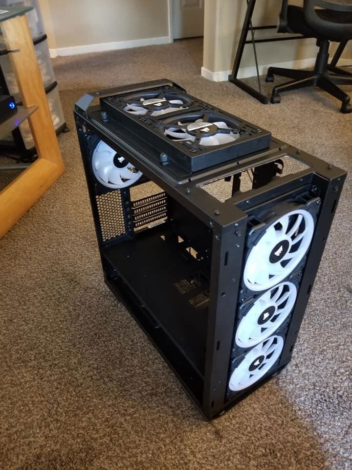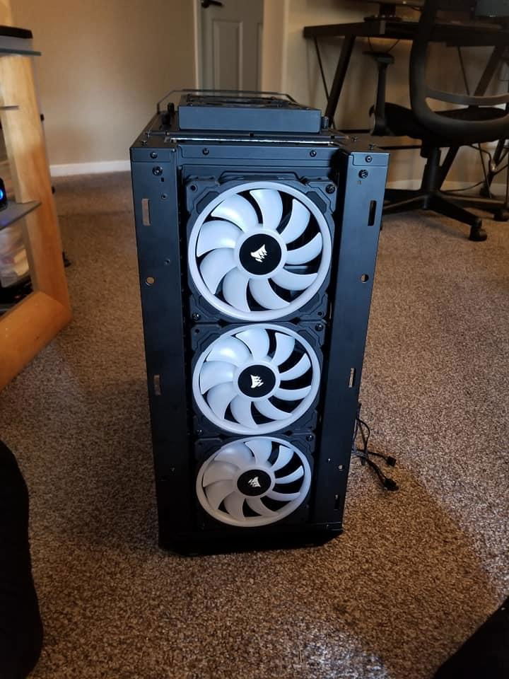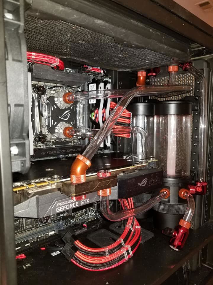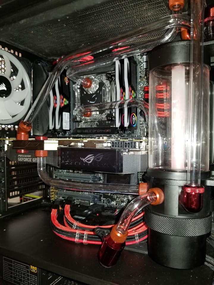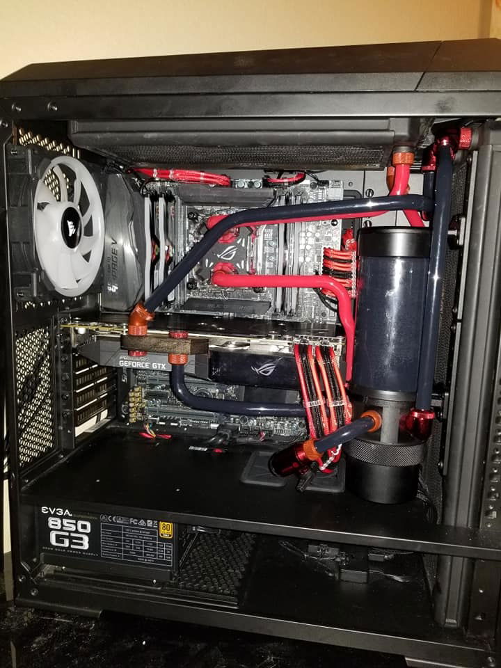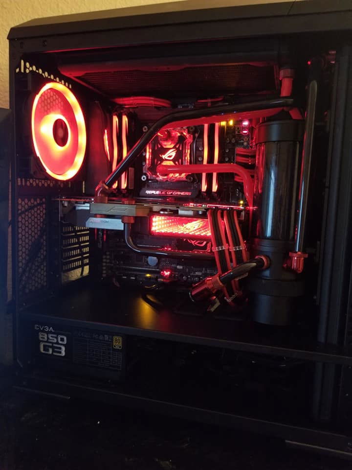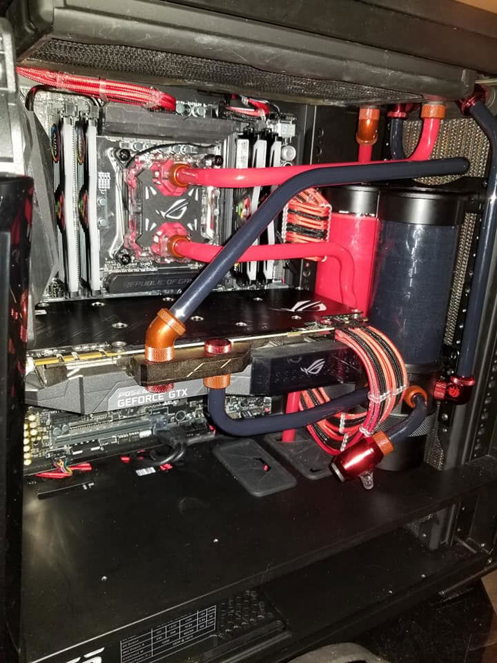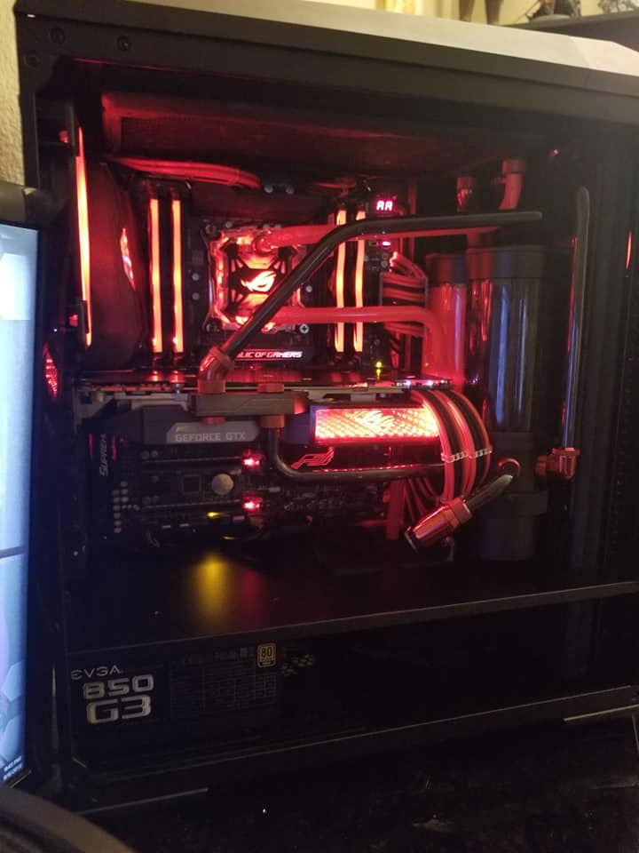 As for the Specs I have Asus Rampage V Edition 10 with an Intel i7-6850K OC to 4.4, it has an Asus GTX 1080ti Poseidon OC +75MHz to core and +400MHz to ram. For ram it has 16GB of GeIL SUPER LUCE RGB 2666Mhz ram OC to 2933Mhz. There are a total of six 140mm Corsair LL140 RGB fans, The CPU water block is a Swiftech Apogee XL2 with a custom ROG logo on it, a Black Ice Nemesis 280GTS radiator (top) CPU loop and a Black Ice Nemesis 420GTS radiator (front) GPU loop to keep everything nice and cool.