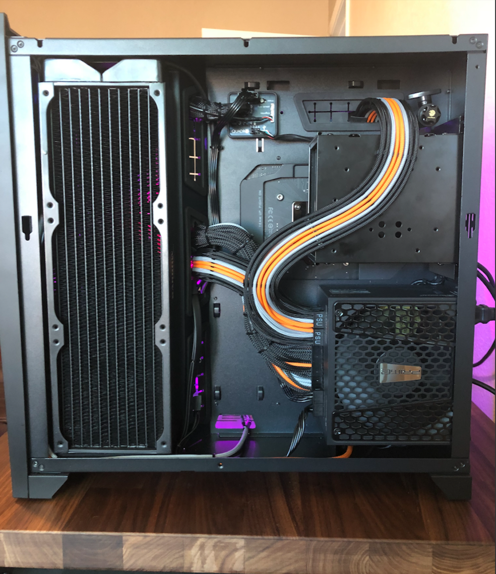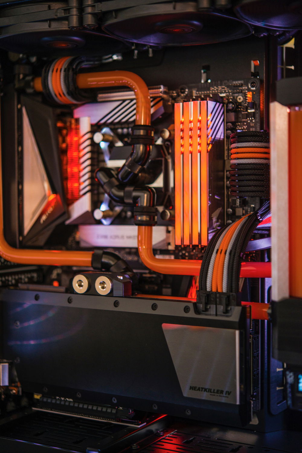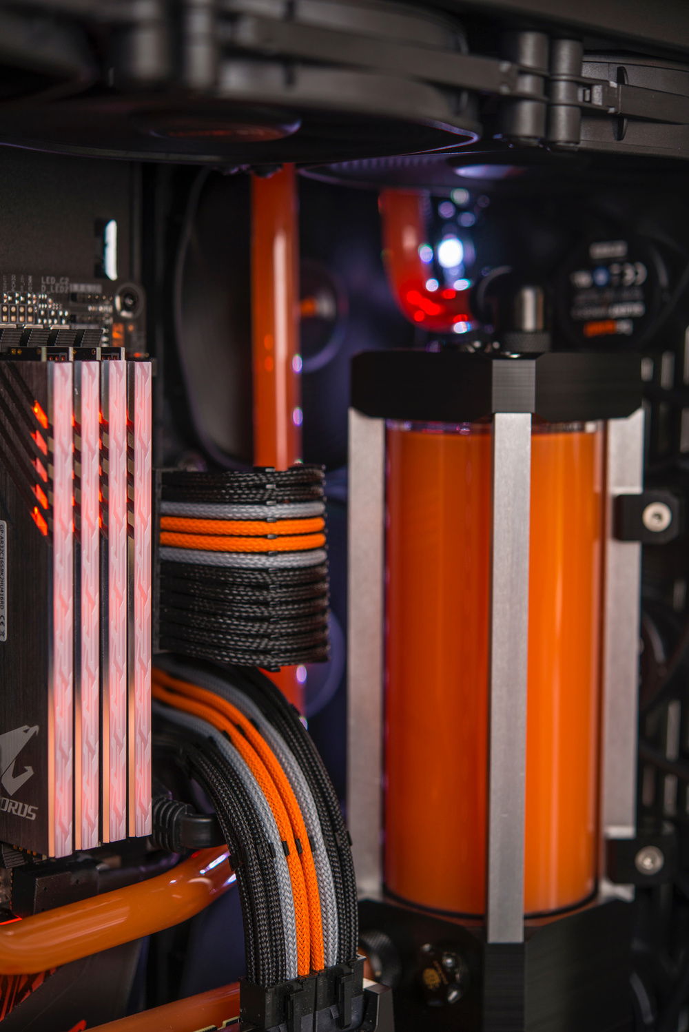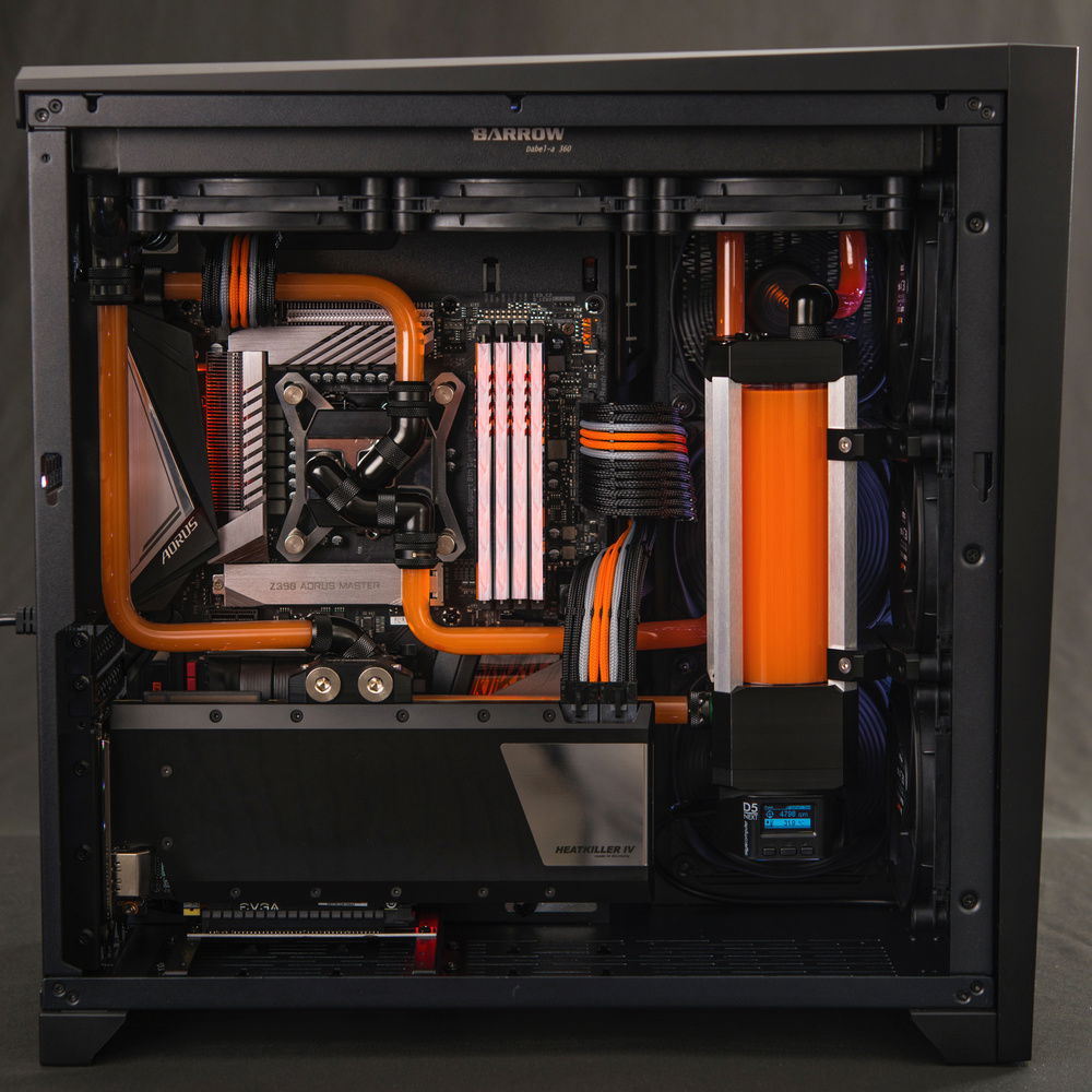 Following up on my previous build I wanted to see what could be done with some simple mods and to see how clean I could keep the aesthetic of the system. I used zero symmetry in the tubes which is usually a bad formula as the human eye is drawn to symmetry and in water cooled PCs the easiest thing to do to make a system look good is run perfectly symmetrical tubes. So in light of no symmetry in the tubes I wanted to make short runs and hide the tubes as much as possible. The build started as an Aorus theme which only deviated at the video card due to my curiosity as to what could be done with a 2080 TI non "A" chip GPU while on water. I was greatly pleased to find that water cooling opened up the frequency a good bit to a stable 2165. However the 2080 TI power limit is still a problem no matter how cool the chip is and seems to limit the cards output. I decided to not go silly on the stickers and branding in light of a more understated look with just a couple color ways to set off the Aorus motherboard and RAM. The processor runs at a stable 5.2 Ghz and never hits 70C. As a point of interest I mocked up this system with both a split loop and a single pass loop and as many have reported I found no cooling benefit from running the loop GPU to RAD to CPU to Rad To RES. In the config Pump to GPU to CPU to Rad1 to Rad2 to RES it ran exactly the same in terms of thermals.