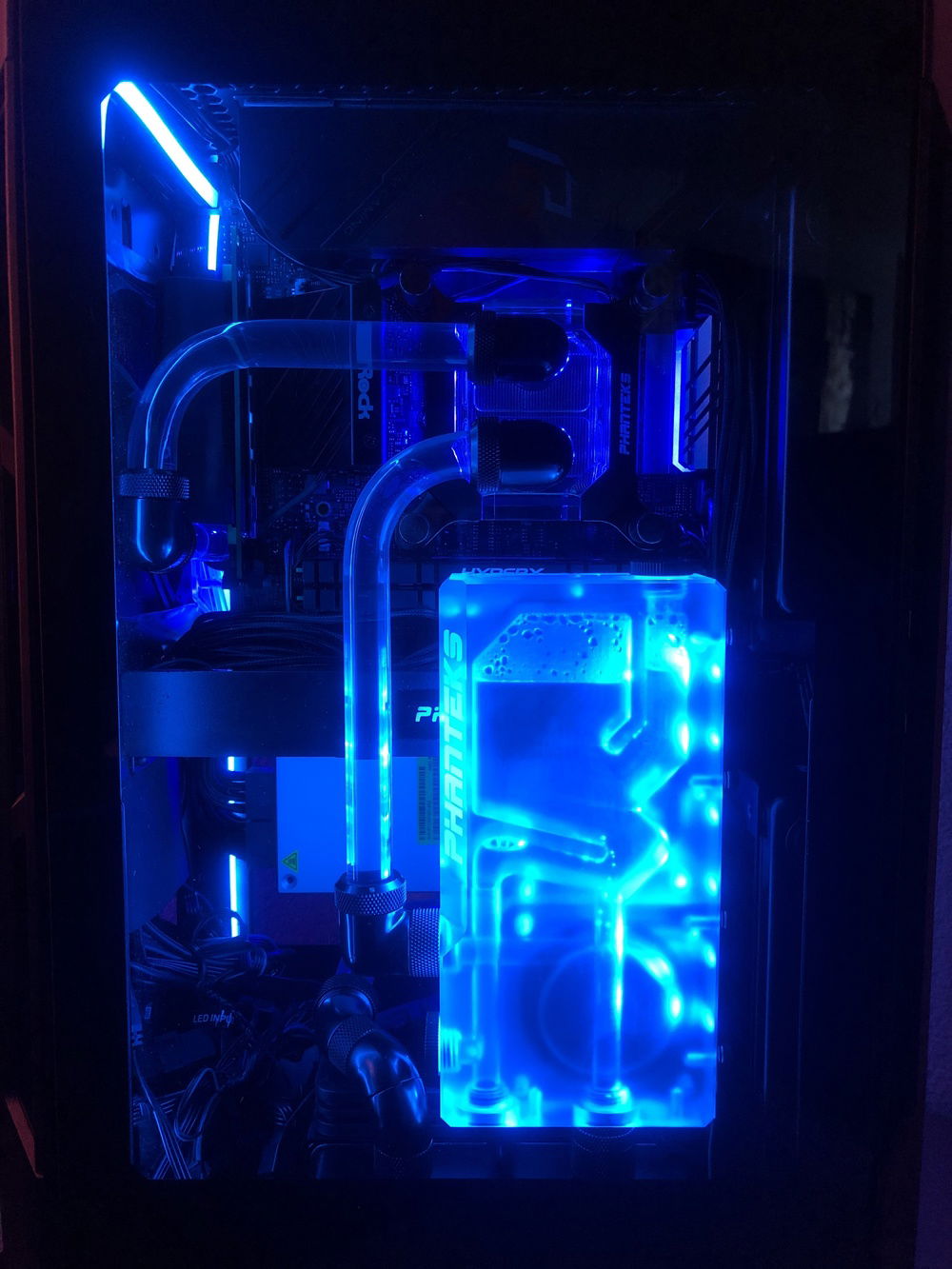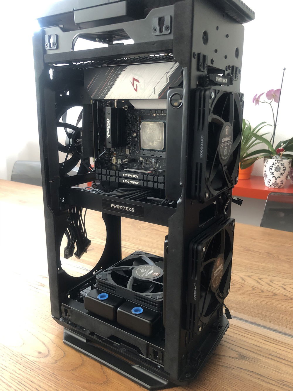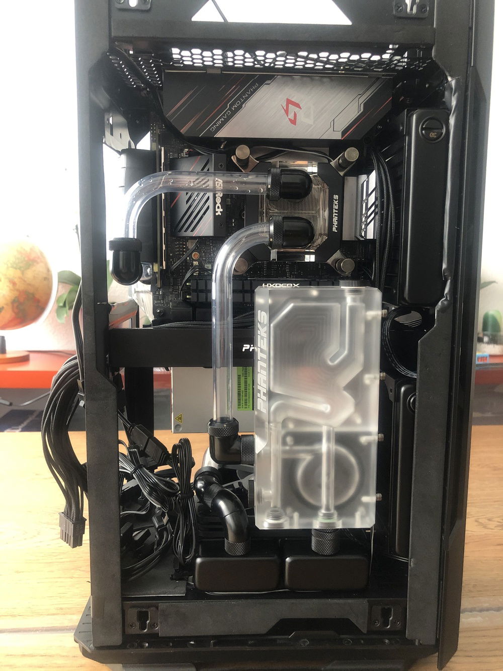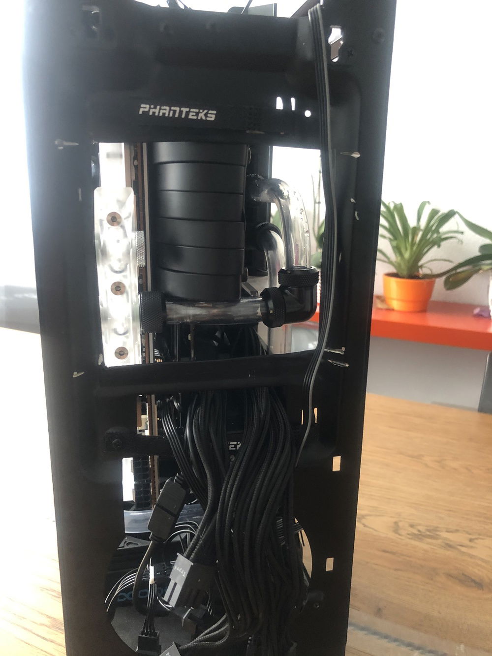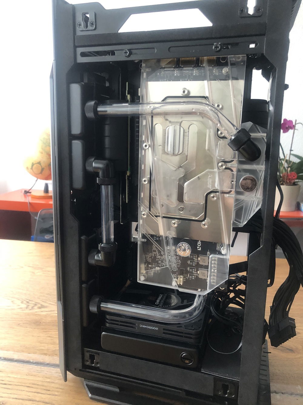 As the Radeon VII is crazy big I had to move the PSU outside the case (mounted on the rear panel). But this allowed me to mount the GPU all the way to the right and have the tube coming in straight from behind.