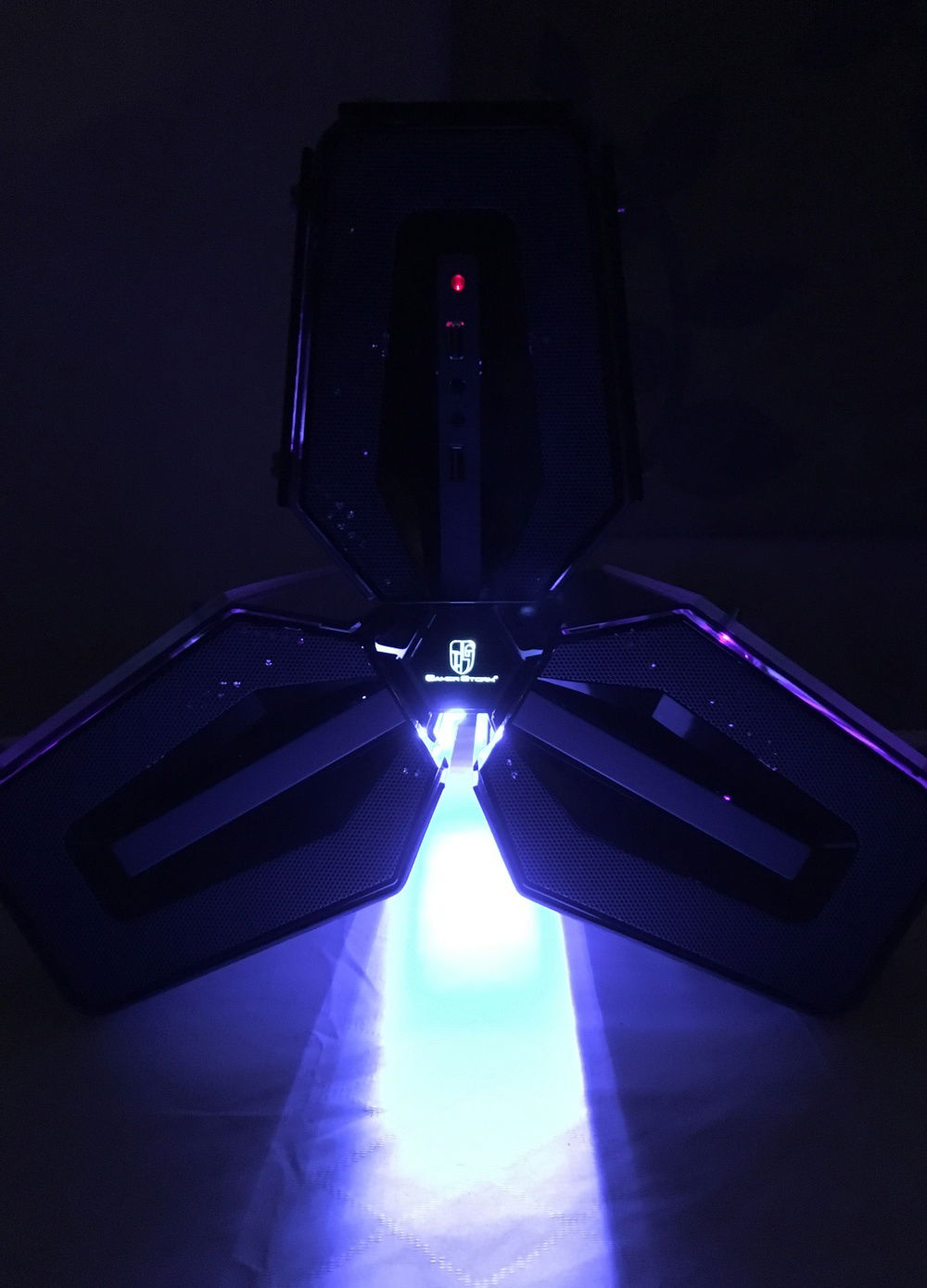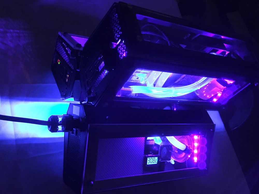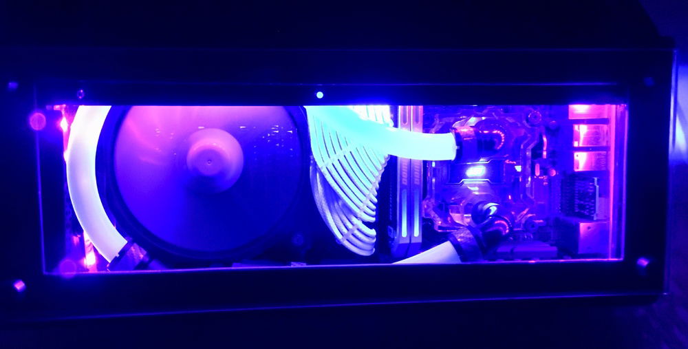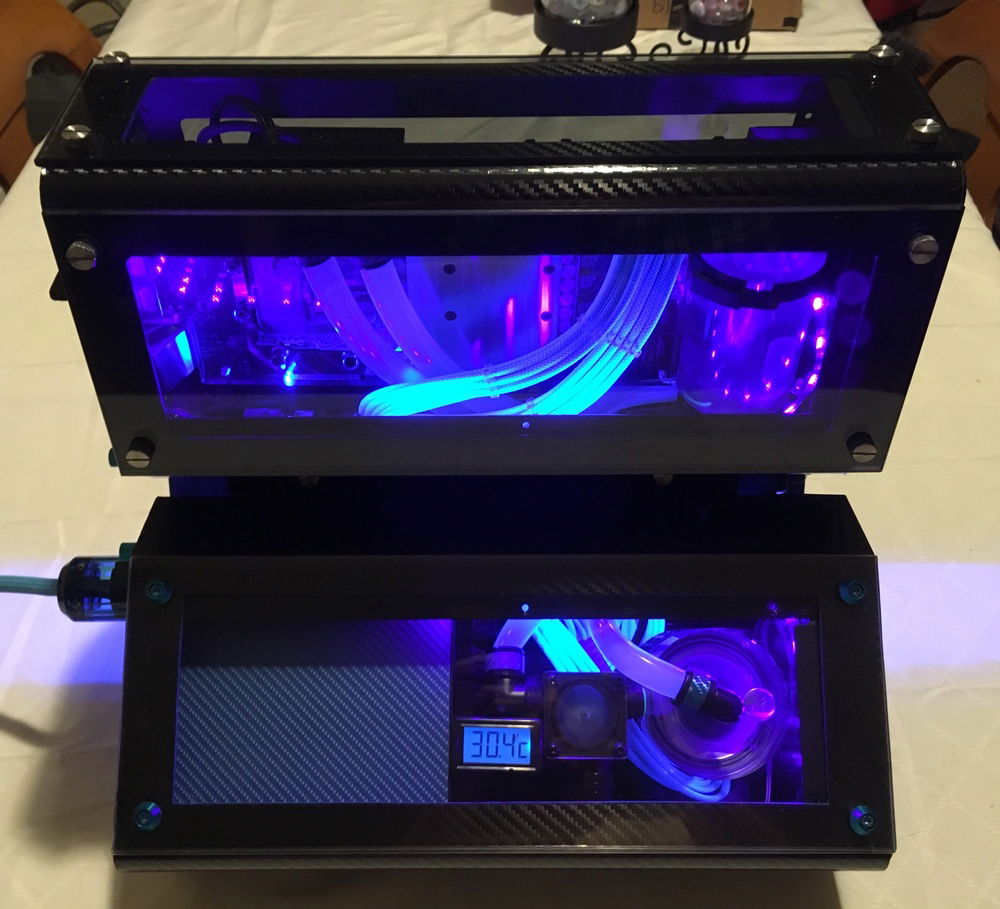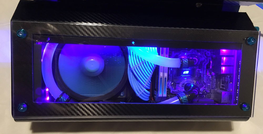 Cut side windows so you can see inside PSU / pump and MLB sides. All custom loop, wiring, and UV lighting. Custom blue / black paint w/carbon fiber vinyl wrap.